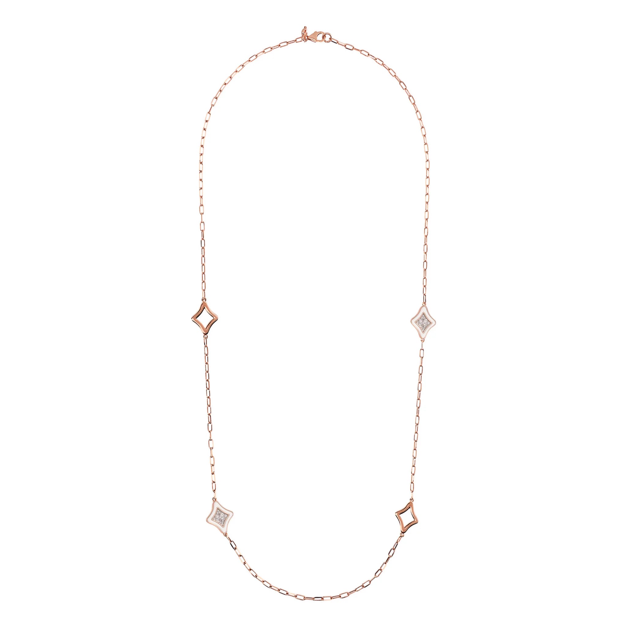 Bronzallure long necklace made of Golden Rosé alloy, 18kt rose gold plated, with forzatina chain embellished with four étoiles stations (19.5x15.5 mm) including two in perforated golden rosé and two enamelled with cubic zirconia pavé, luminous quality; lobster clasp closure.
