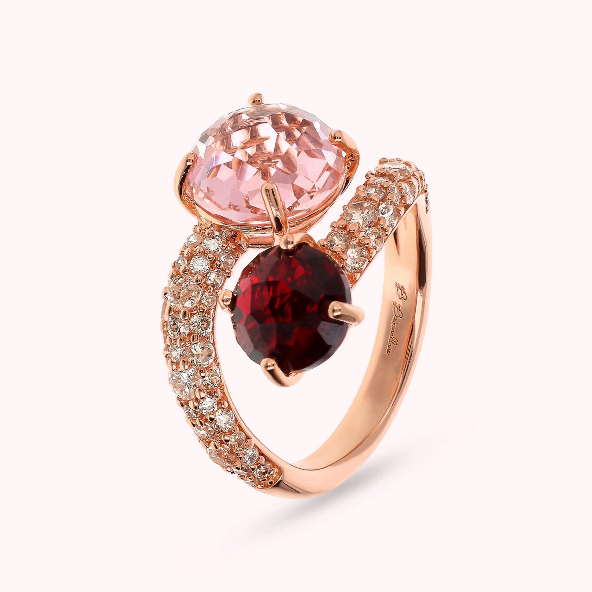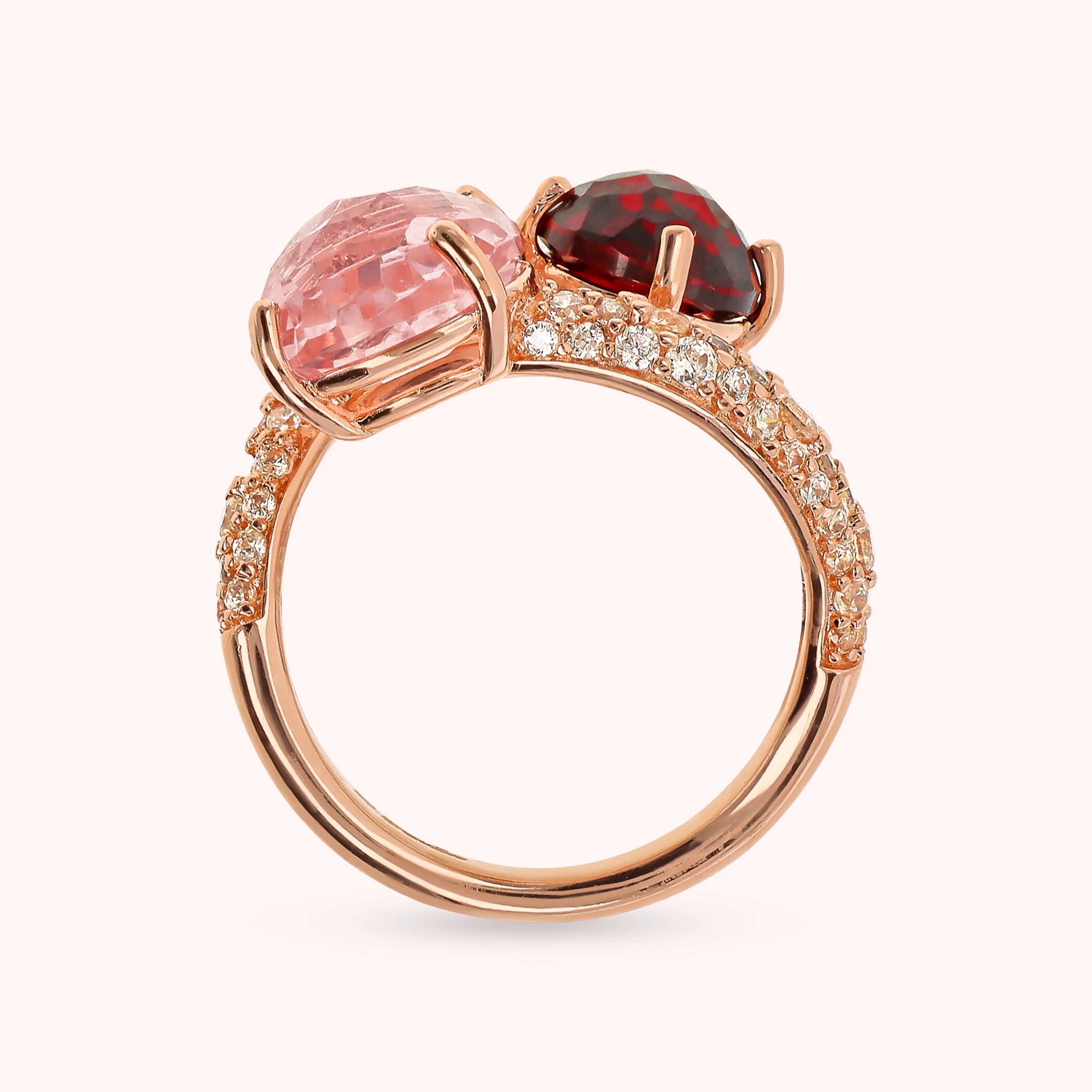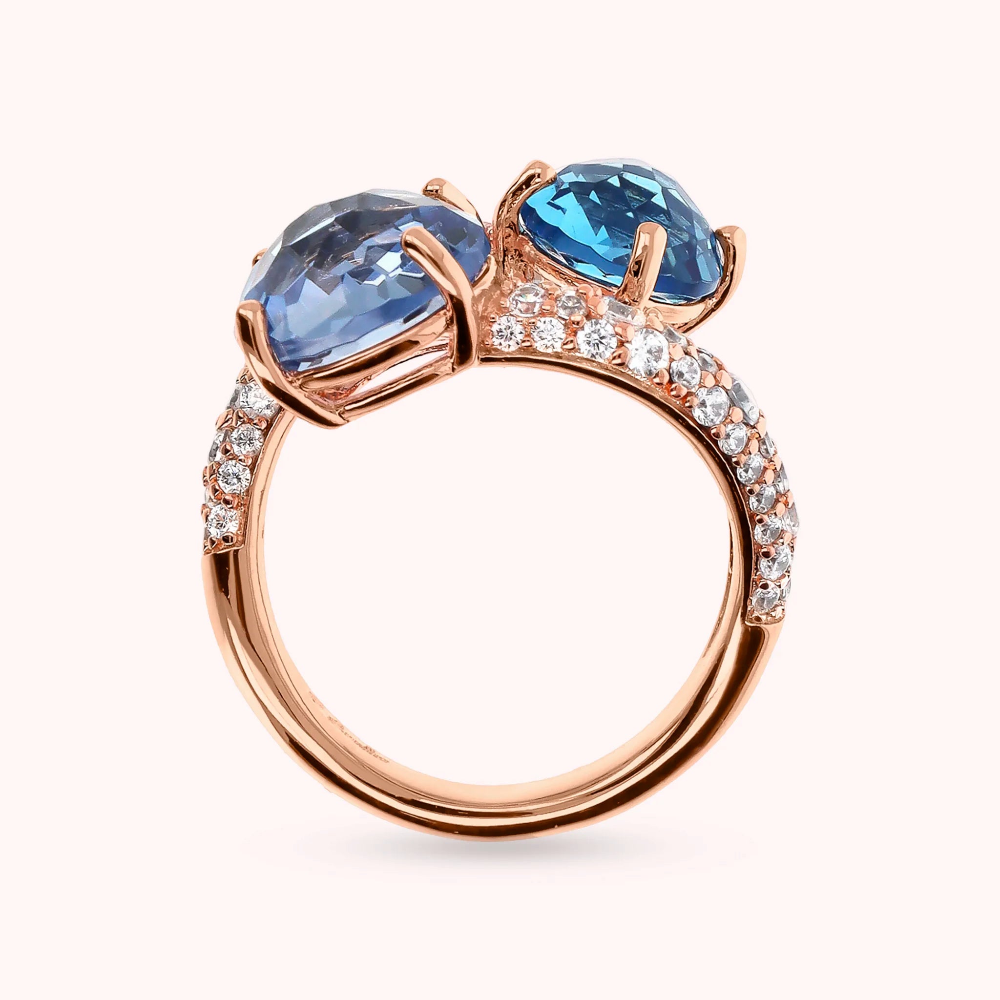 Bronzallure contrarié ring made of Golden Rosé alloy, 18kt rose gold plated, with two graduated round gem prism stones (8/10 mm) and cubic zirconia pavé surface, luminous quality.