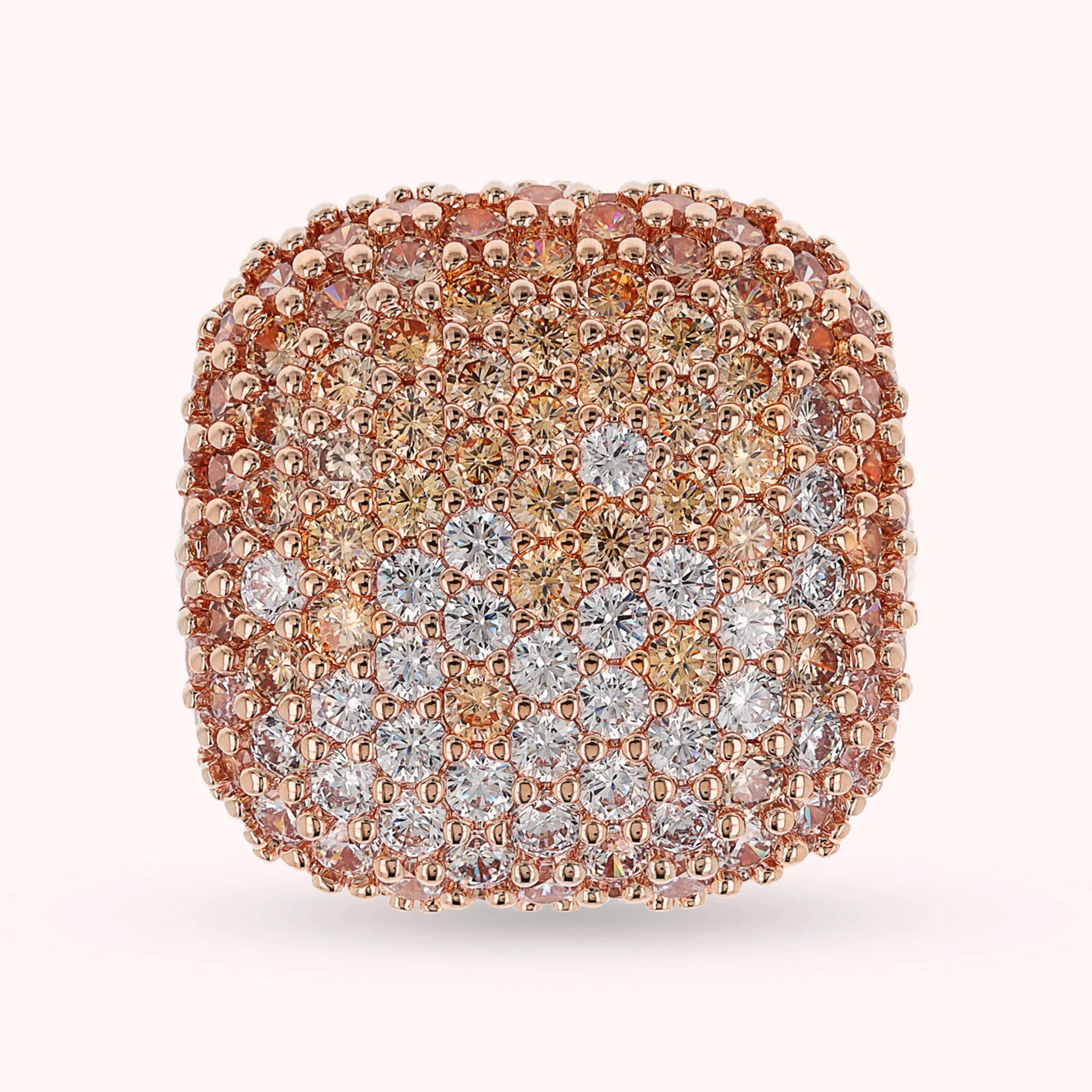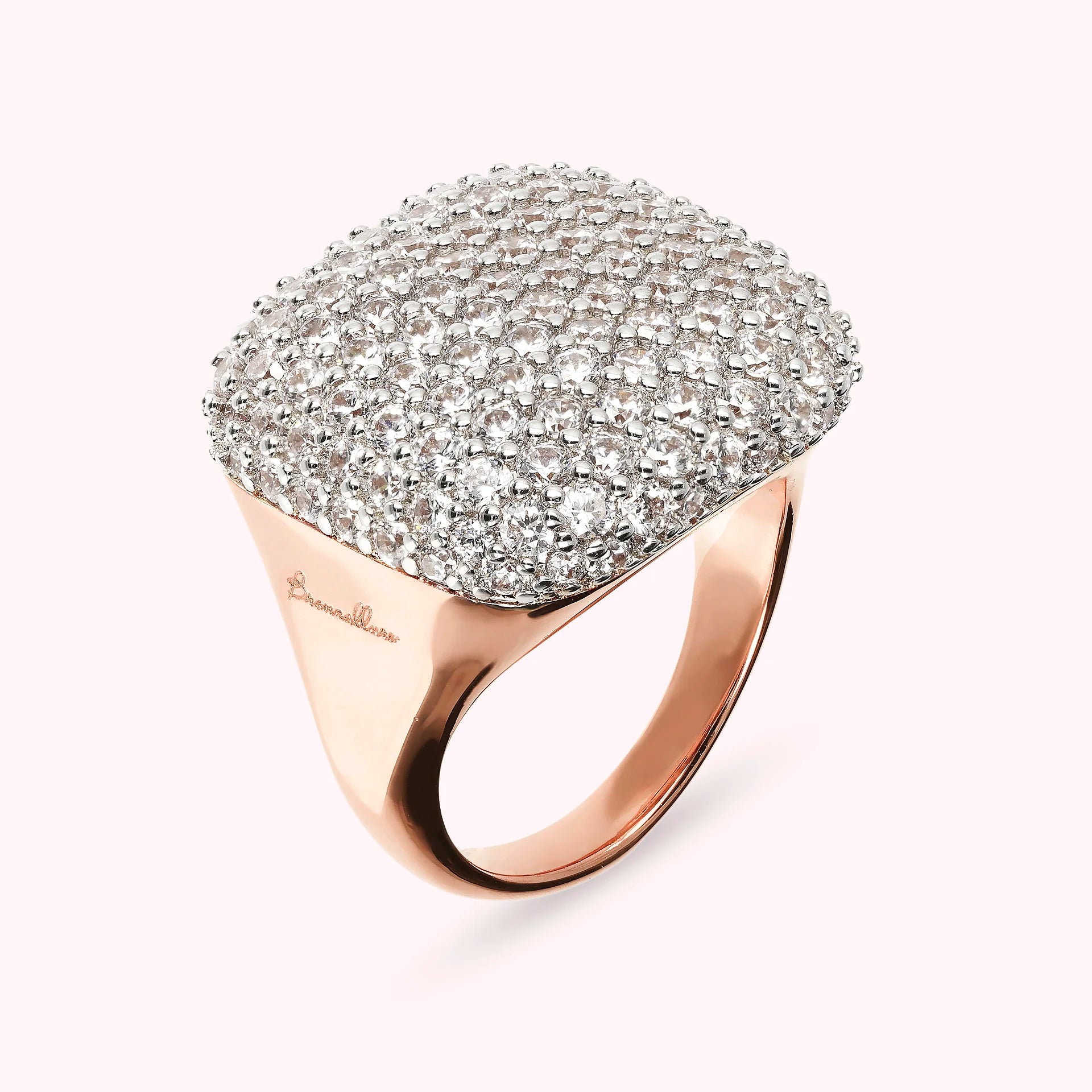 Bronzallure chevalier ring made of Golden Rosé alloy, 18kt rose gold plated, square shape (21x21 mm) with cubic zirconia pavé, luminous quality.
