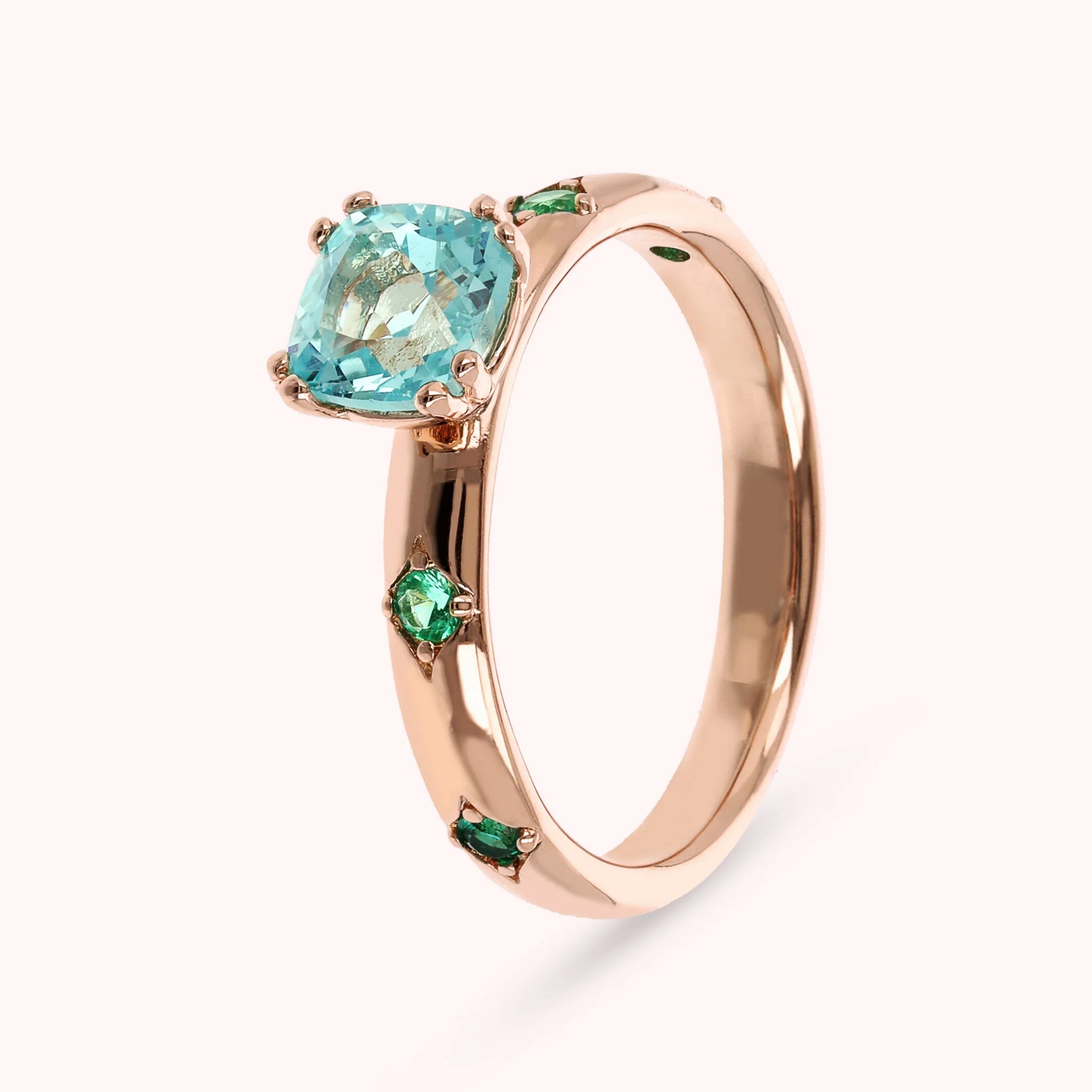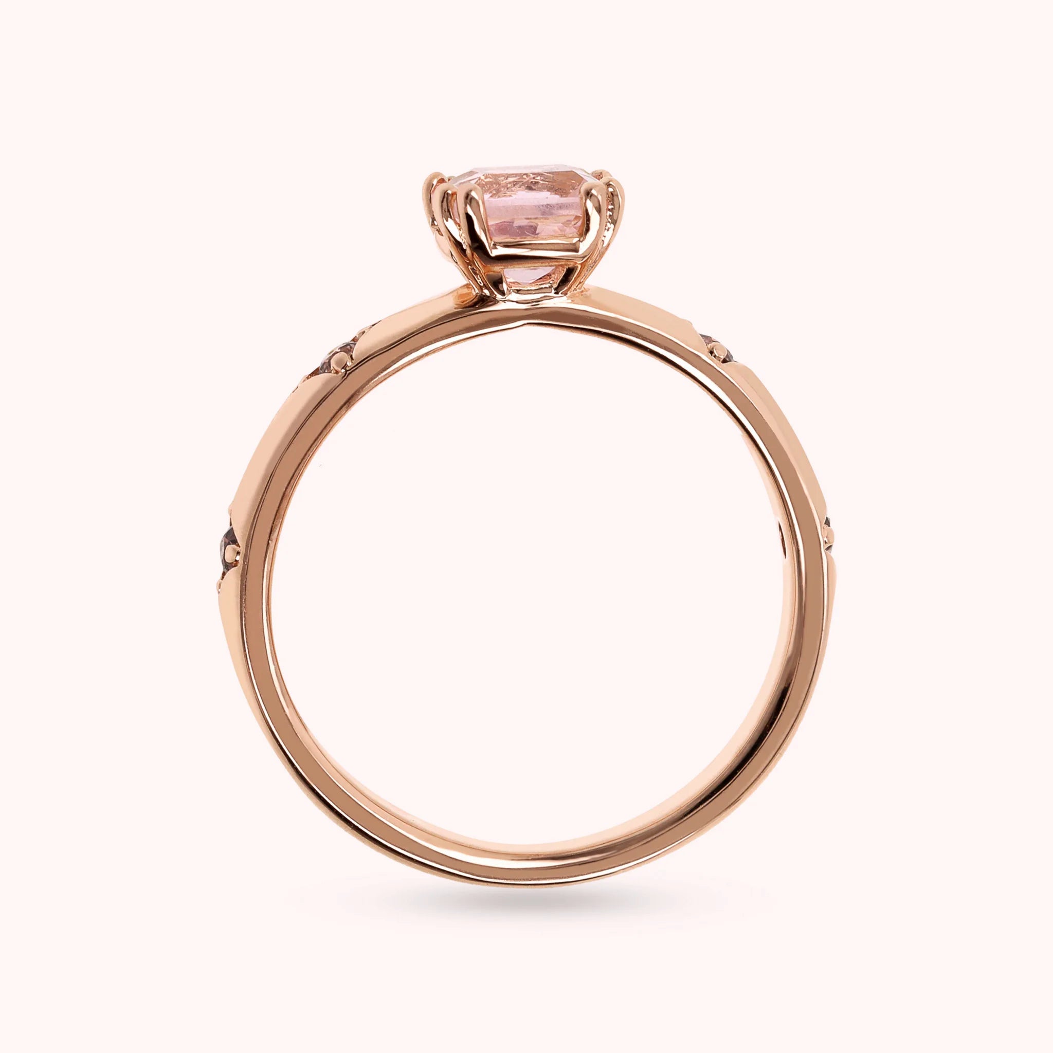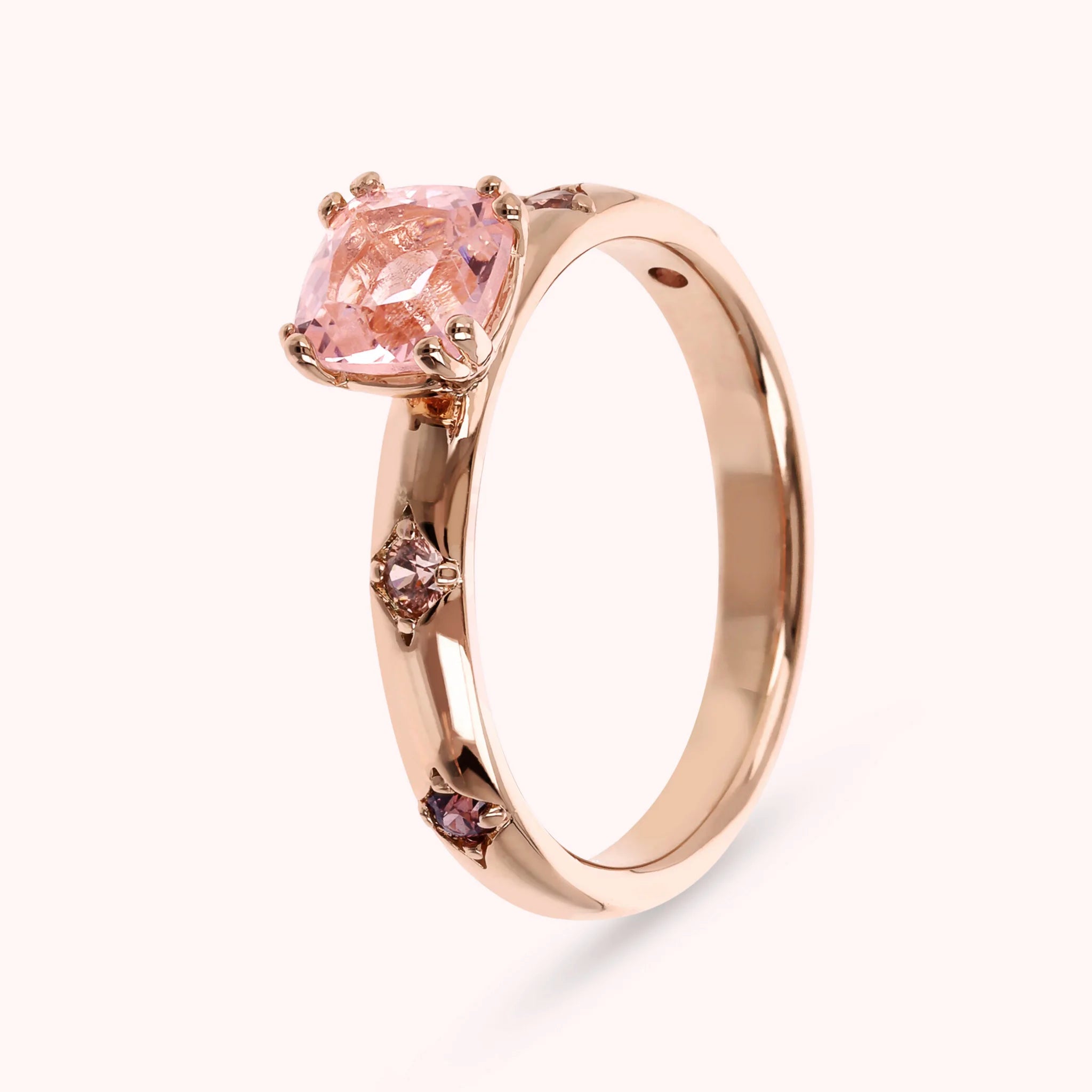 Solitaire ring made of Golden Rosé alloy, 18kt rose gold plated, embellished with four étoiles engraved with a cubic zirconia light point and a central cushion-cut gem prism (6x6 mm).