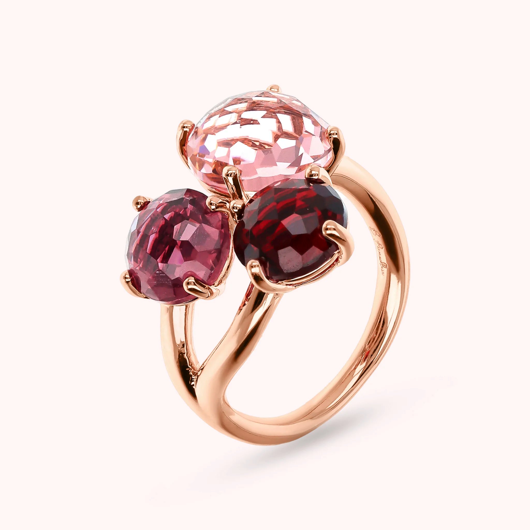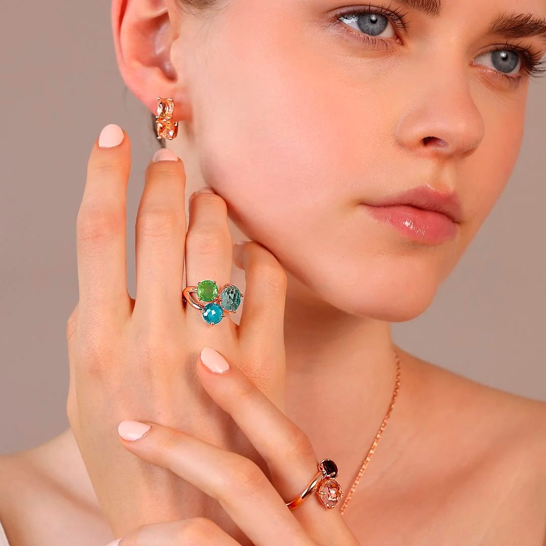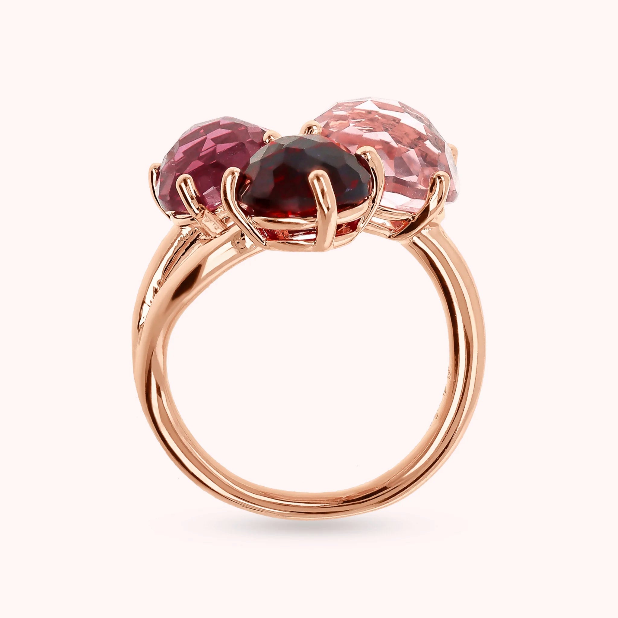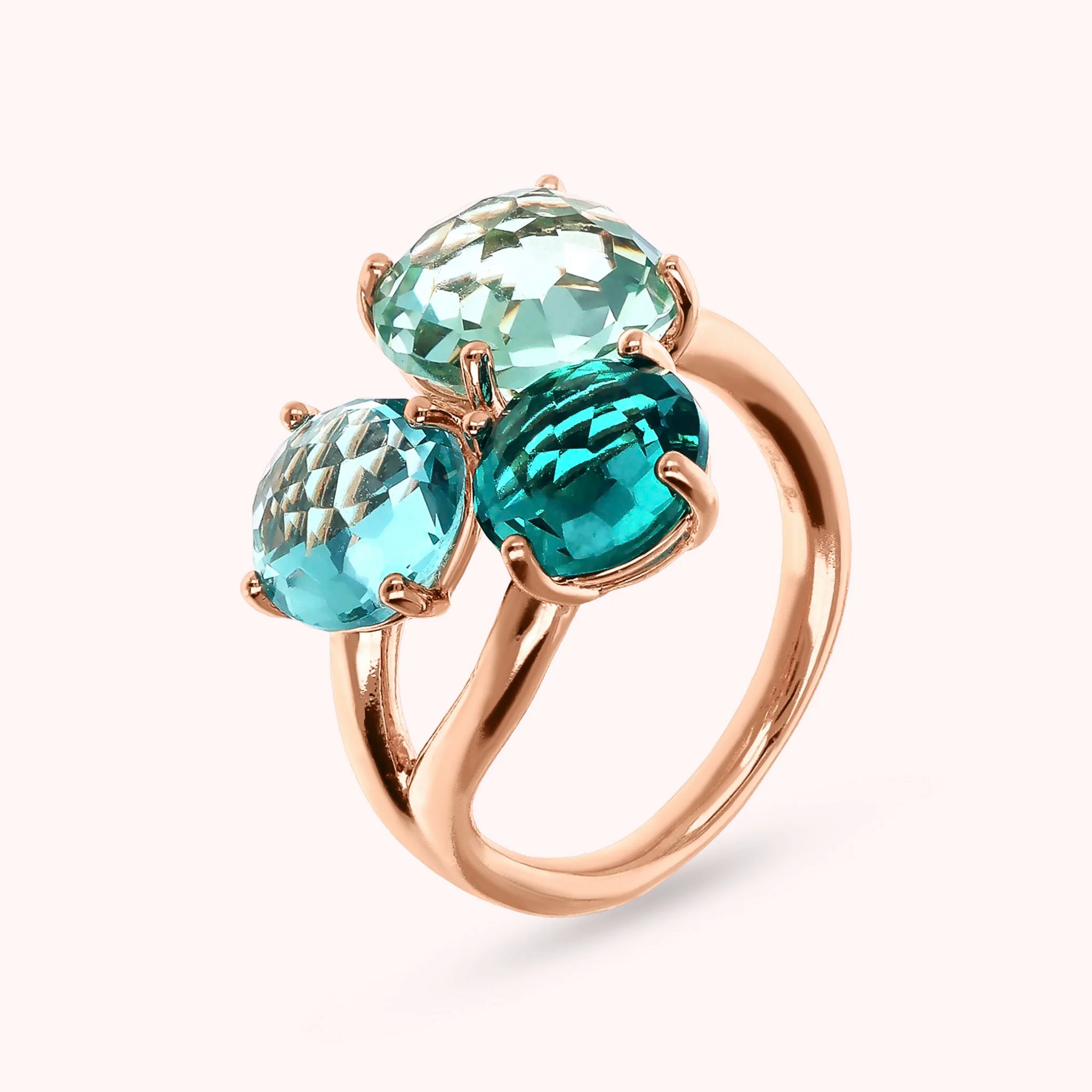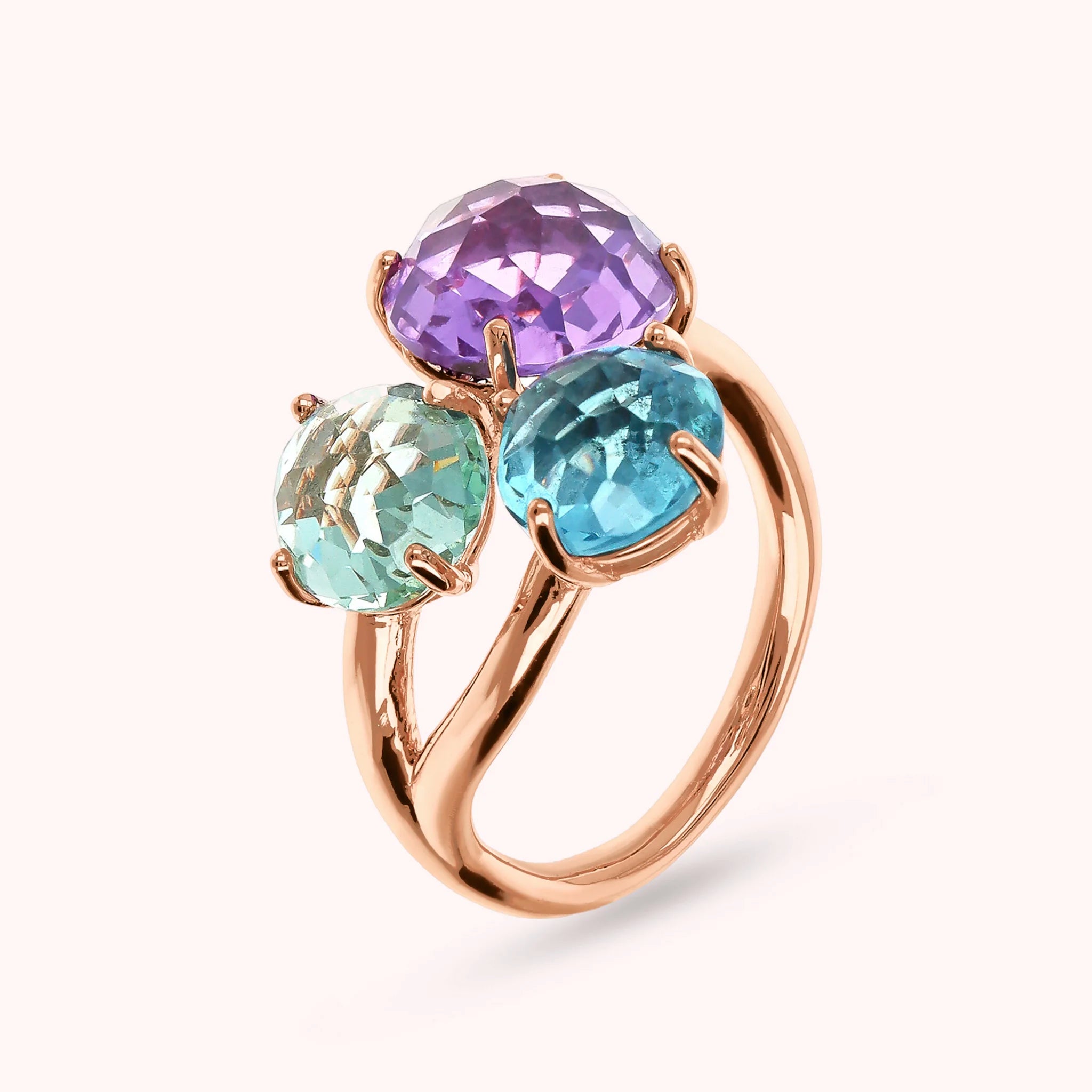 Bronzallure trilogy ring made of Golden Rosé alloy, 18kt rose gold plated, embellished with three round gem prism stones (8/10 mm) with a mosaic cut.