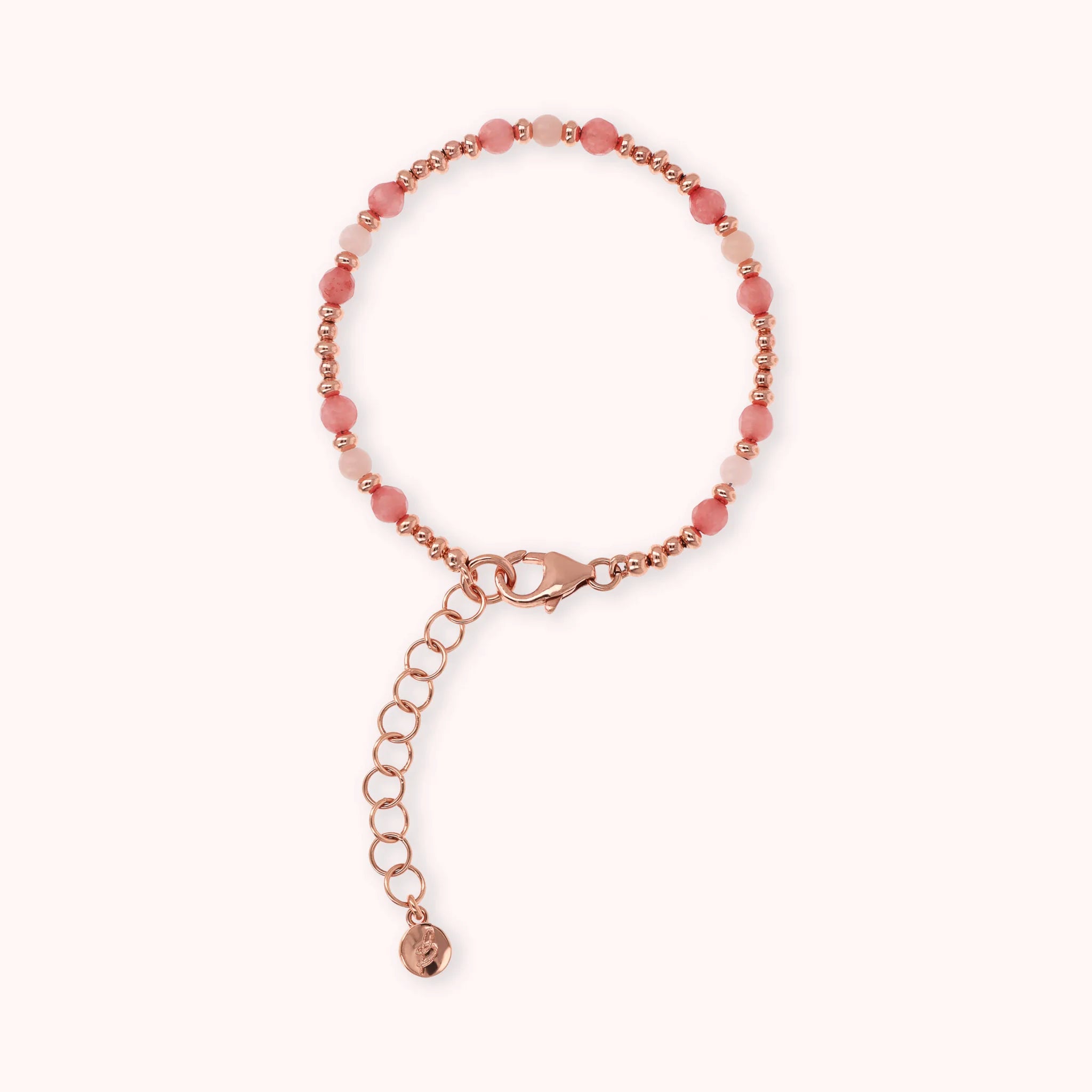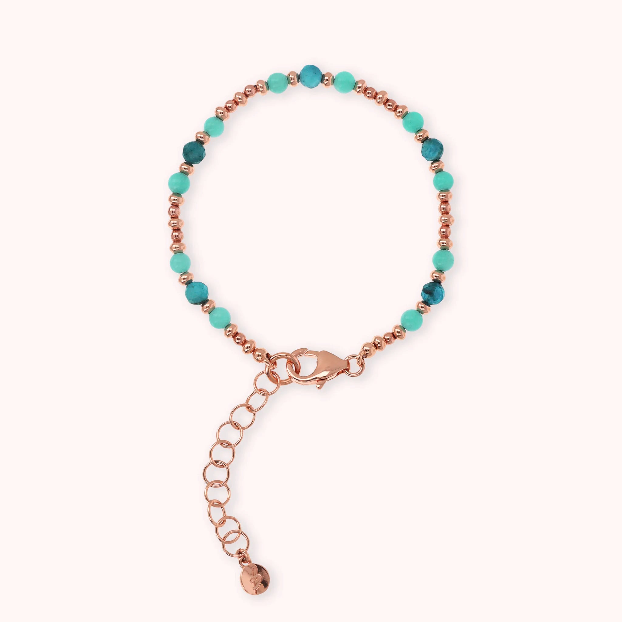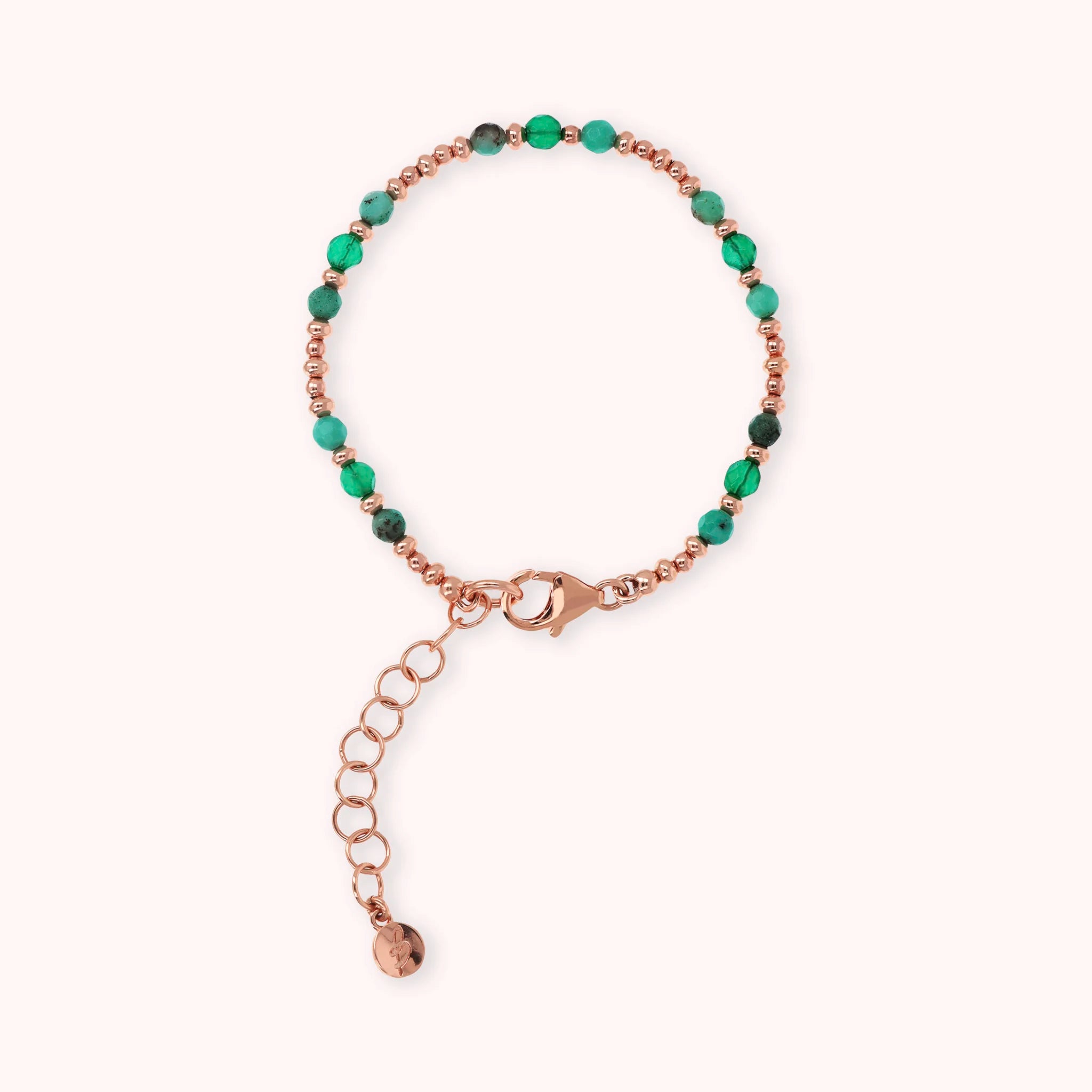 Bracelet made of Golden Rosé alloy, 18kt rose gold plated, embellished with an alternation of small beads and washers in golden rosé and small spheres (5 mm) in faceted natural stone. Lobster clasp closure.