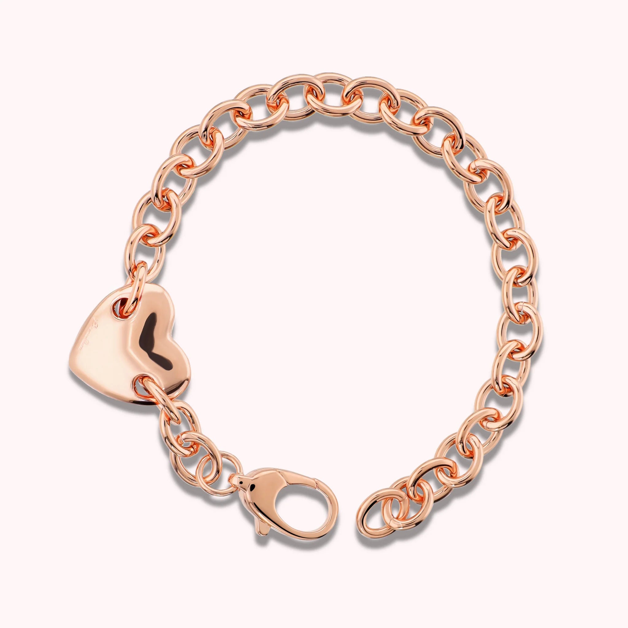 Bracciale Bronzallure made of Golden Rosé alloy, plated with 18kt gold, featuring a rolo chain adorned with a shiny heart-shaped charm. Lobster clasp closure.