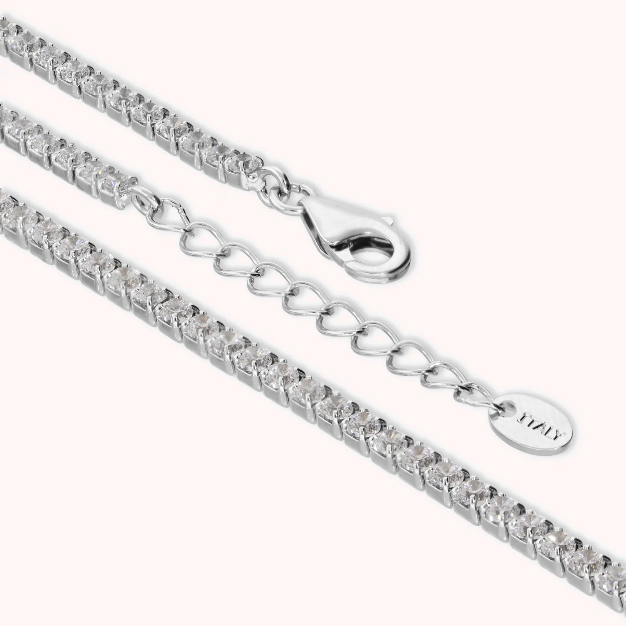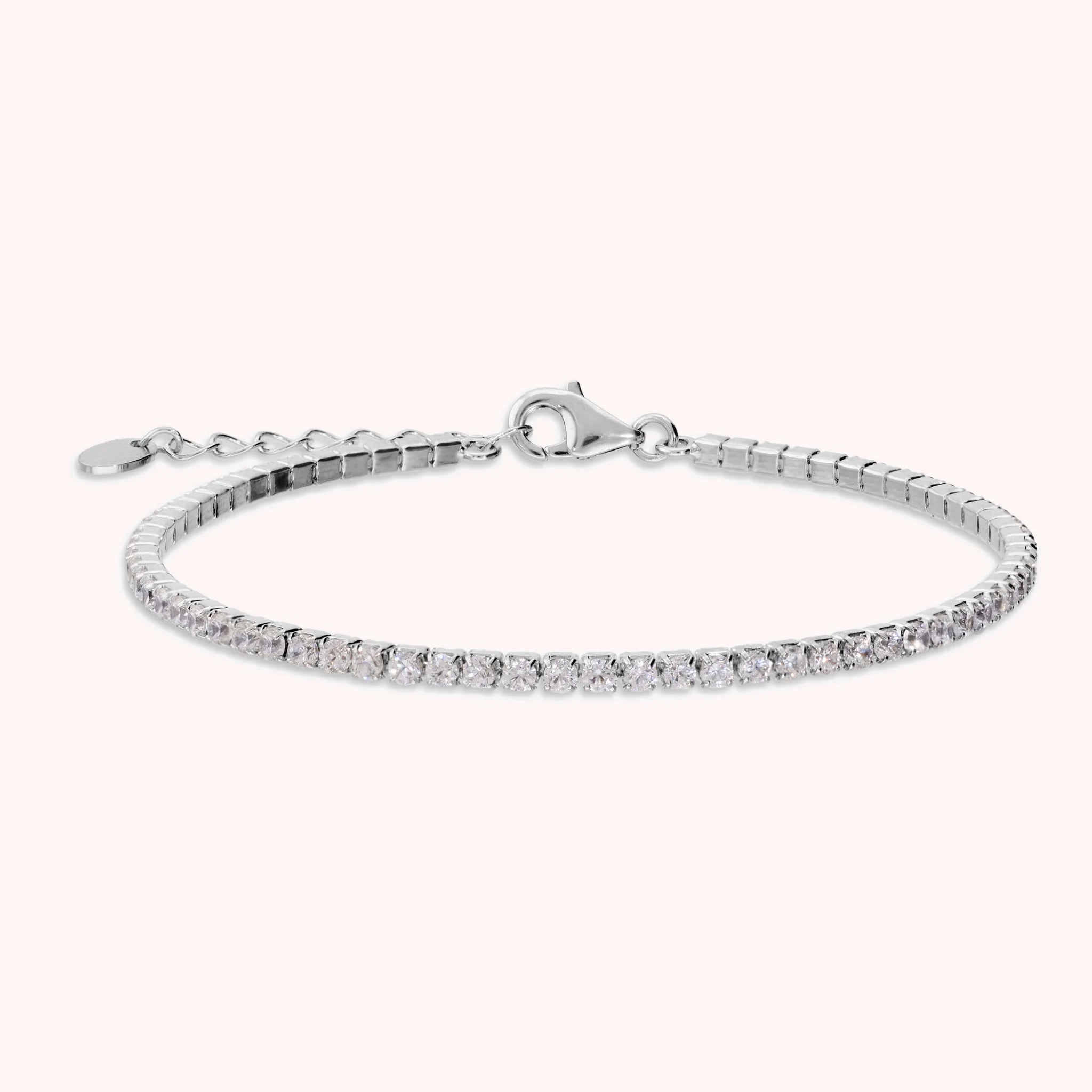 Tennis bracelet made of Golden Alloy, rhodium plated, adorned with white cubic zirconia (2 mm). Length 17+3 cm extension. Lobster clasp.