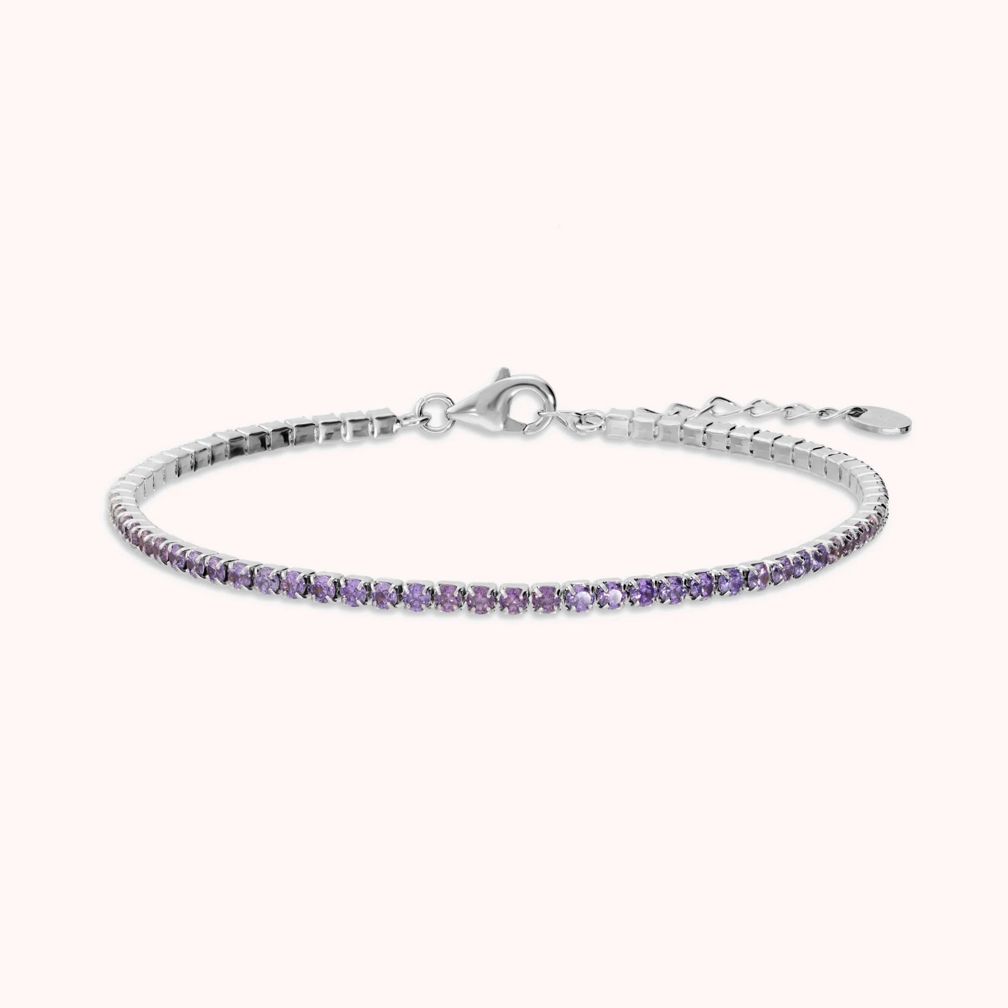 Tennis bracelet made of Golden Alloy, rhodium plated, adorned with purple cubic zirconia (2 mm), gradient effect. Length 17+3 cm extension. Lobster clasp.