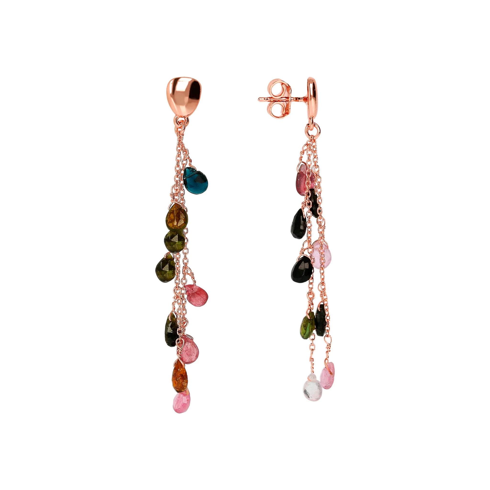 Bronzallure dangle earrings made on a Golden Rosé base, 18kt Rose Gold plated, with rolo chain strands embellished with small natural tourmaline stone drops in pastel colors; butterfly stud clasp.