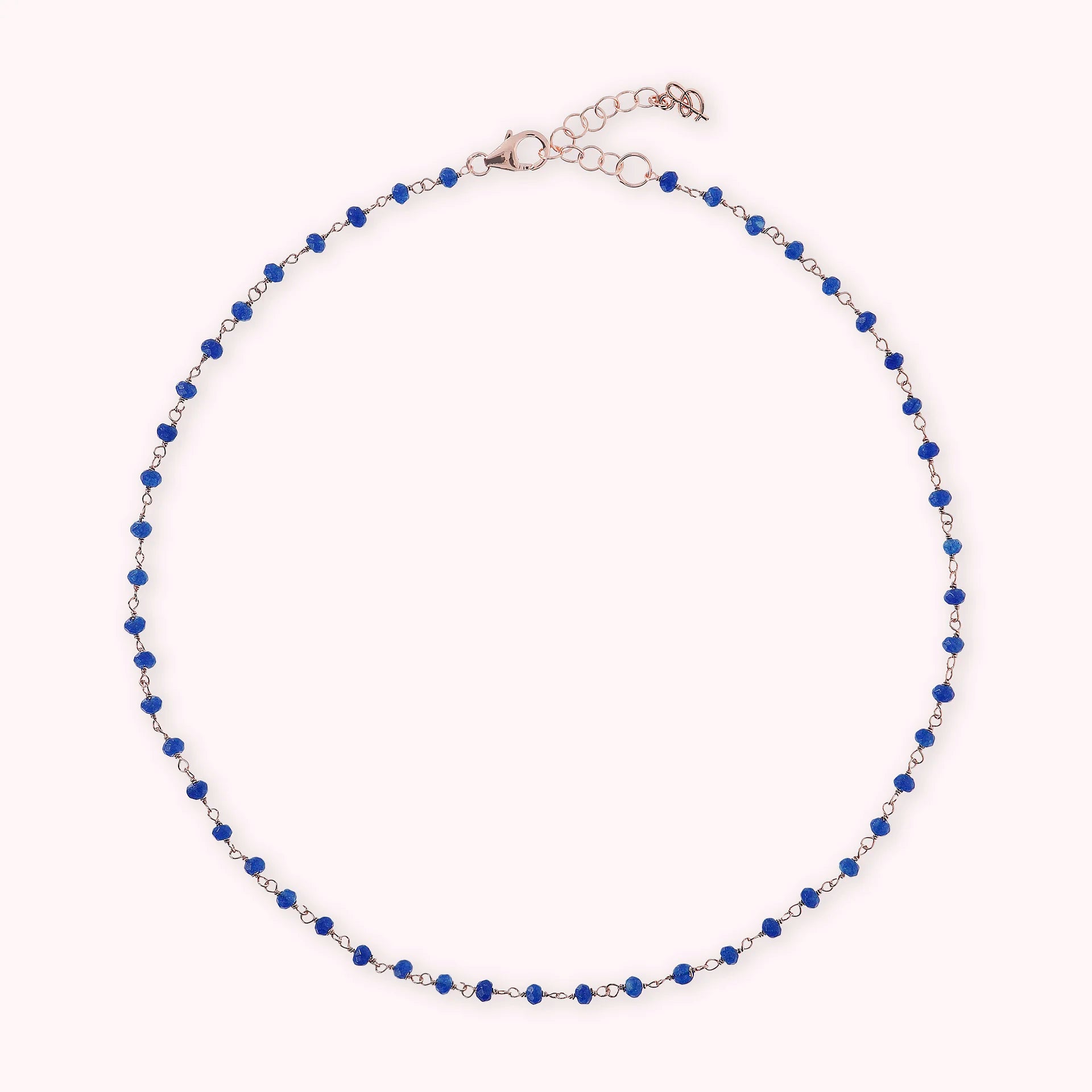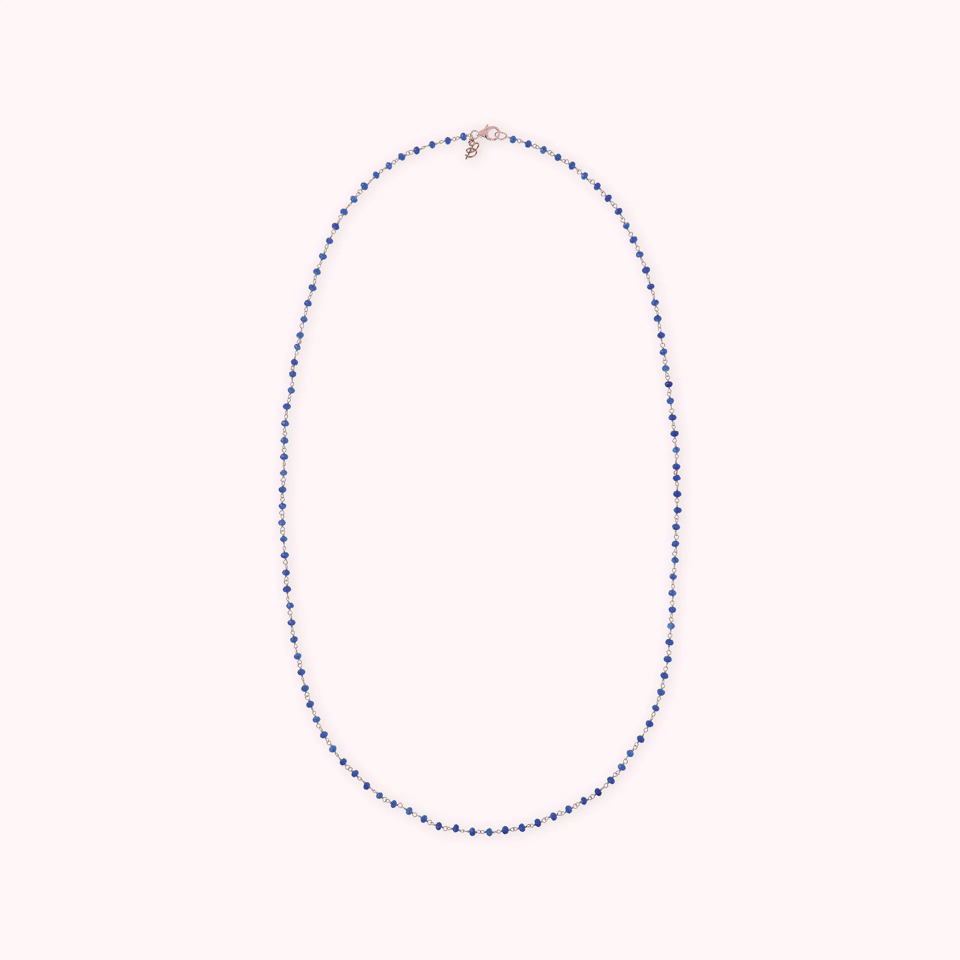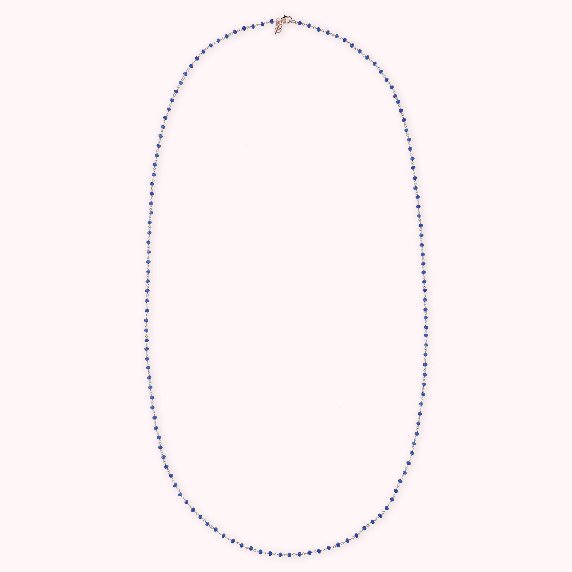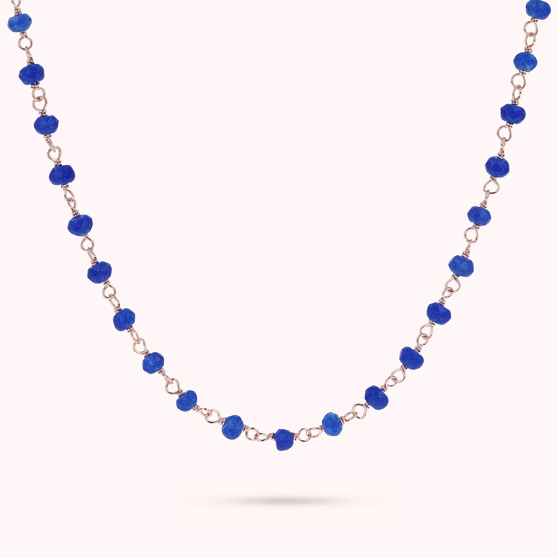 Bronzallure rosary necklace made of Golden Rosé alloy, 18kt rose gold plated, embellished with small natural blue agate stones (3.5 mm); lobster clasp closure. Available in three sizes: short (38 cm), medium (75 cm) and long (100 cm).