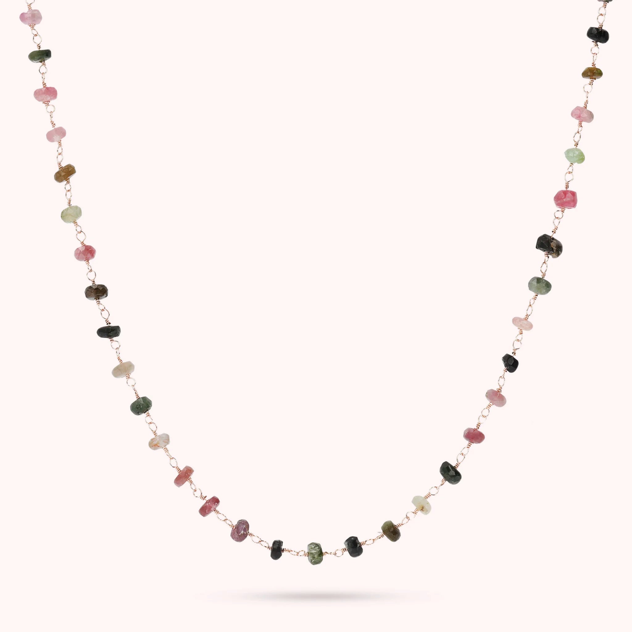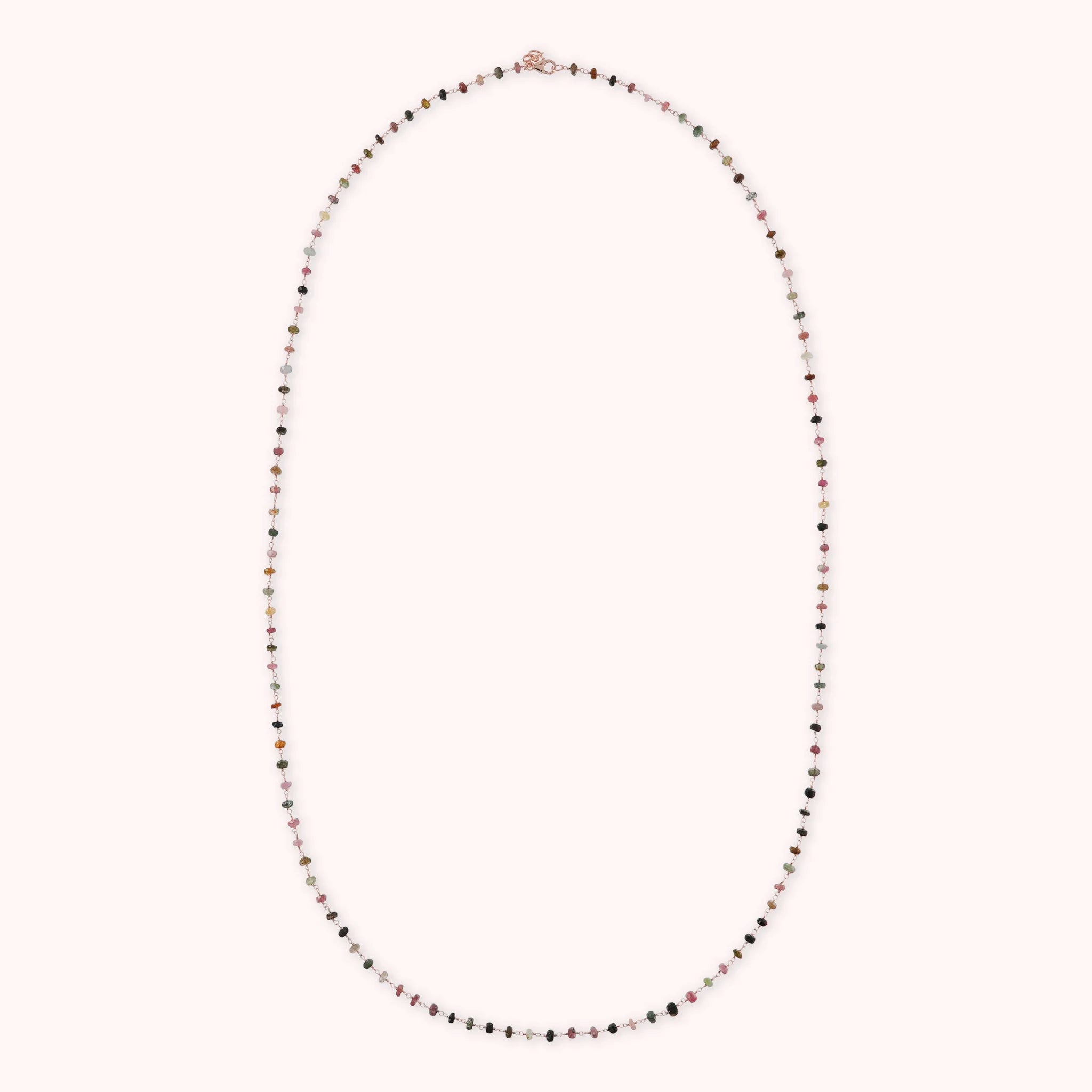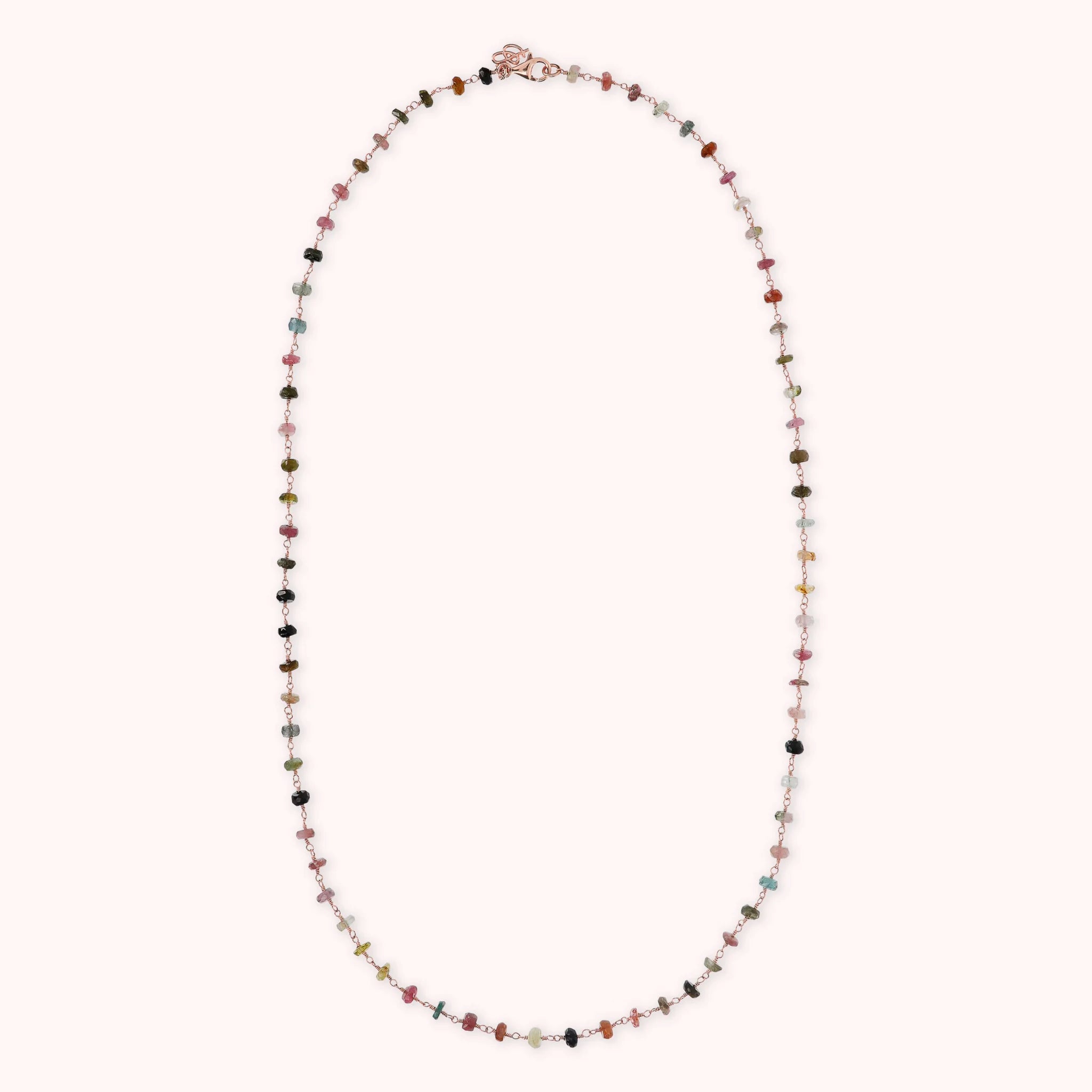Bronzallure rosary necklace made on a Golden Rosé base, 18kt rose gold plated, embellished with small multicolor tourmaline natural stones; lobster clasp. Necklace available in three sizes: short (38 cm), medium (75 cm) and long (100 cm).