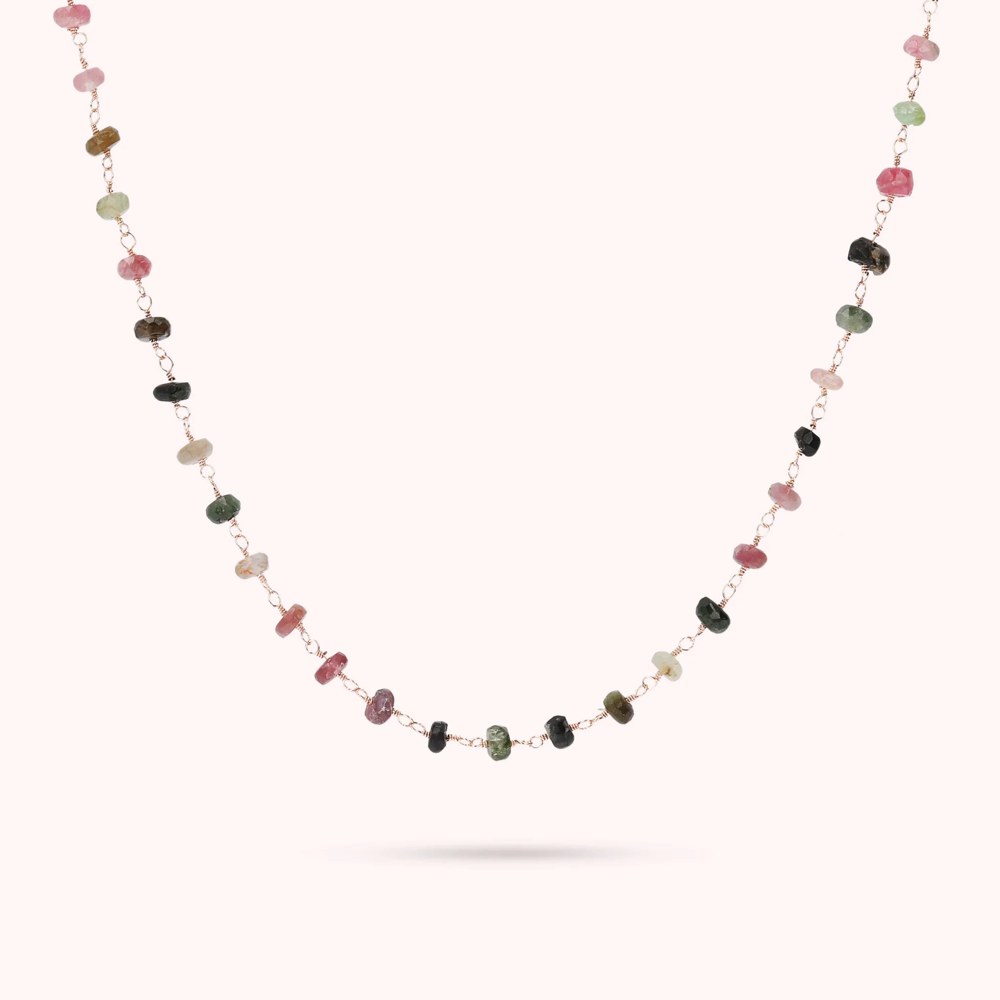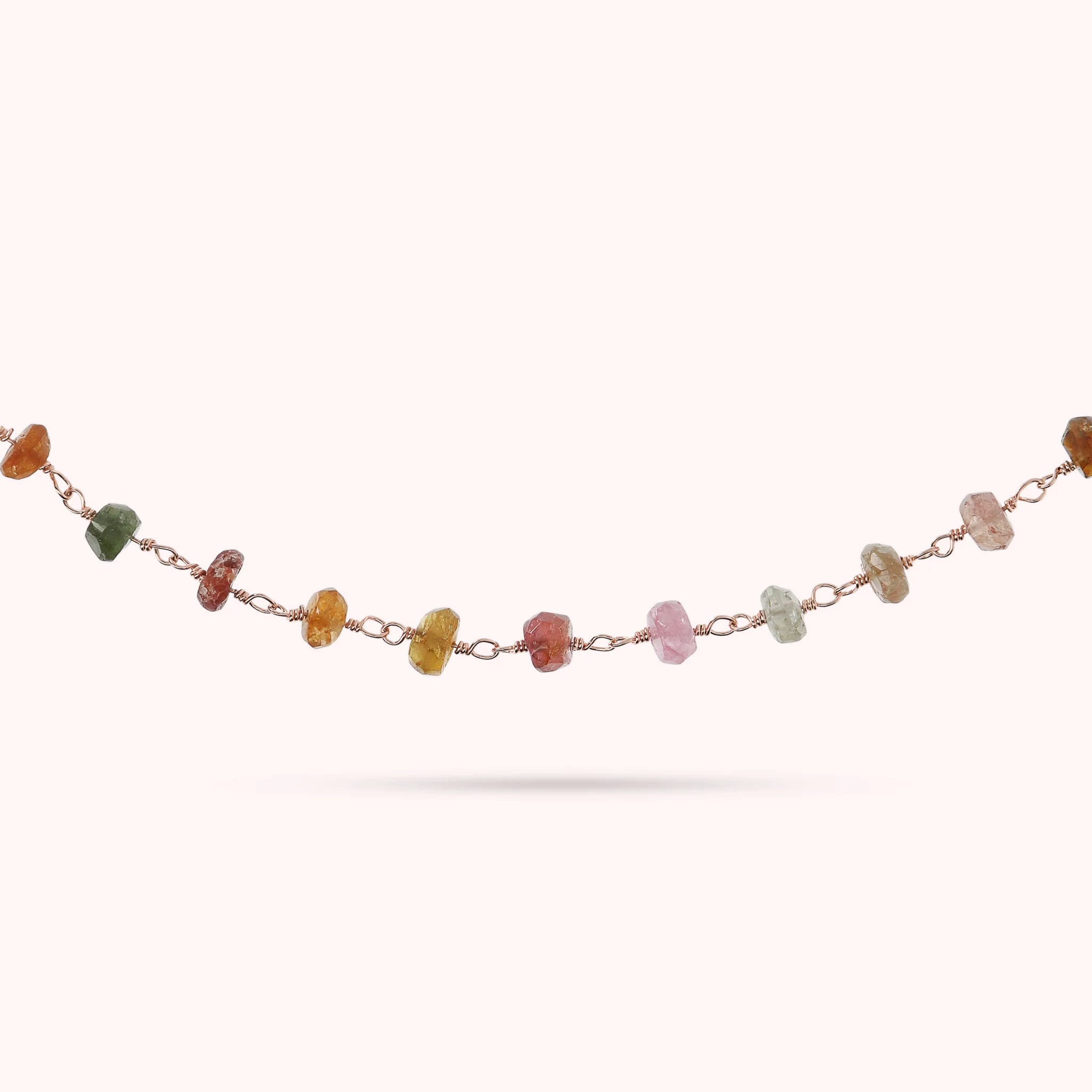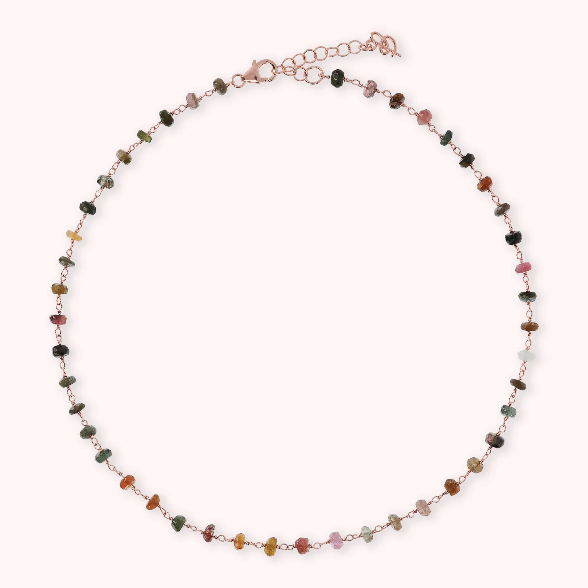 Bronzallure rosary necklace made on a Golden Rosé base, 18kt rose gold plated, embellished with small multicolor tourmaline natural stones; lobster clasp. Necklace available in three sizes: short (38 cm), medium (75 cm) and long (100 cm).
