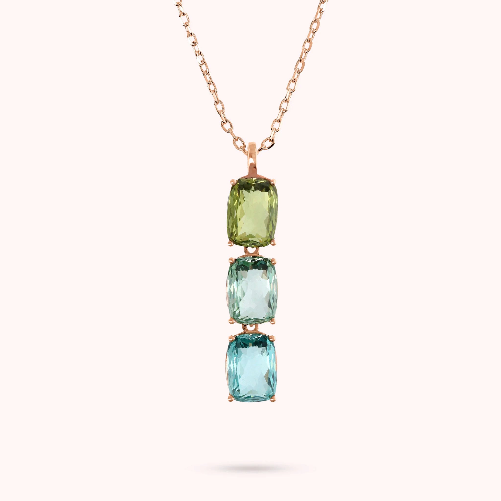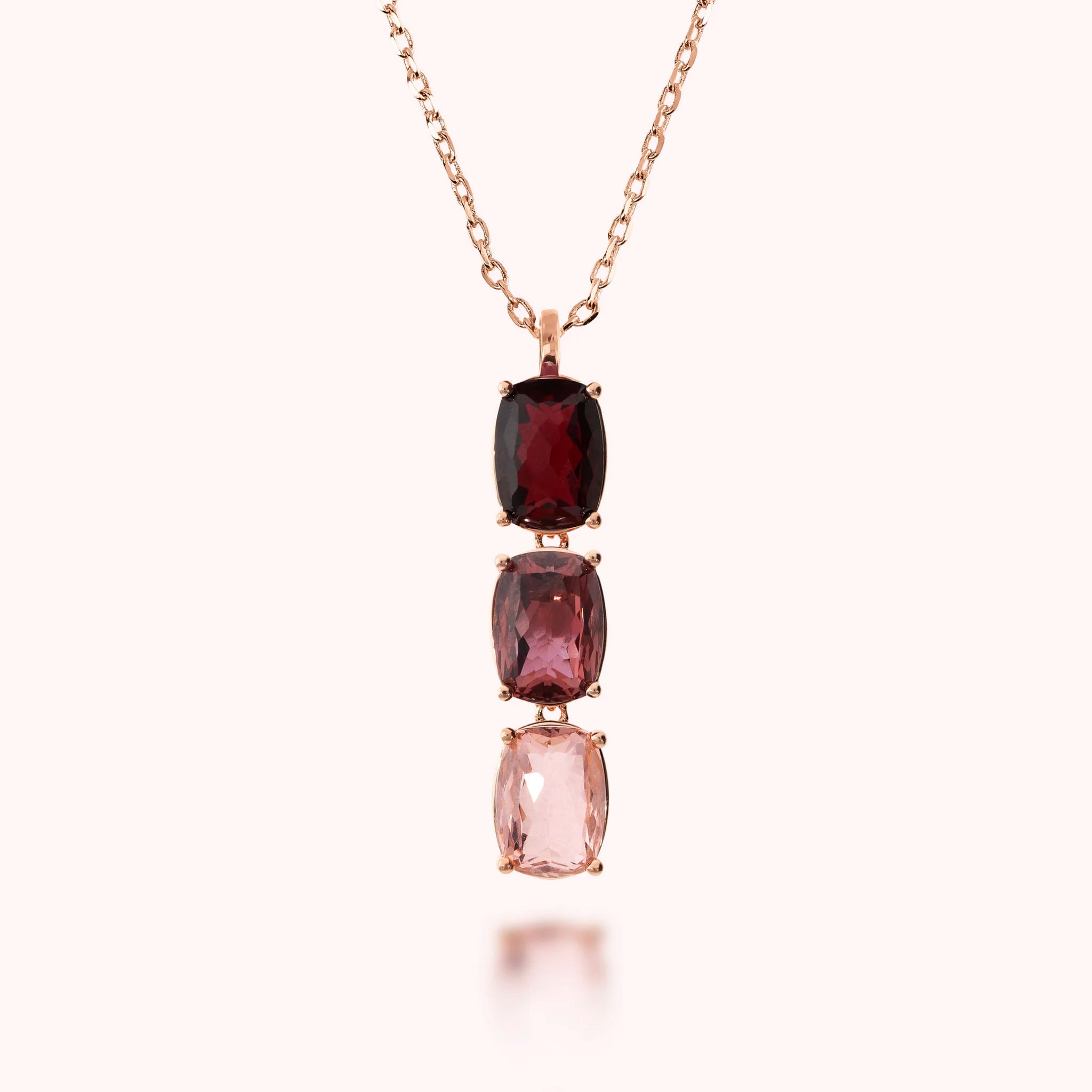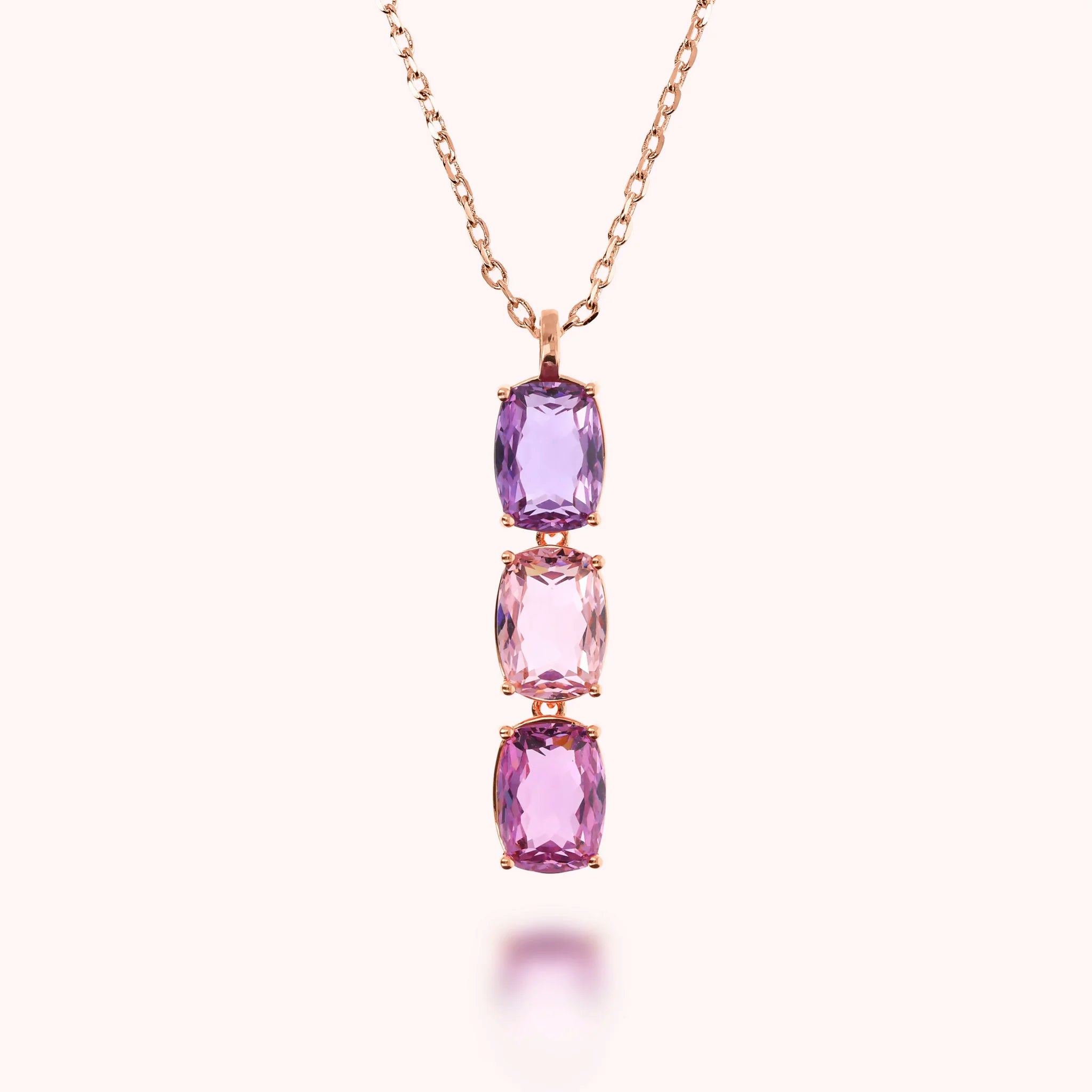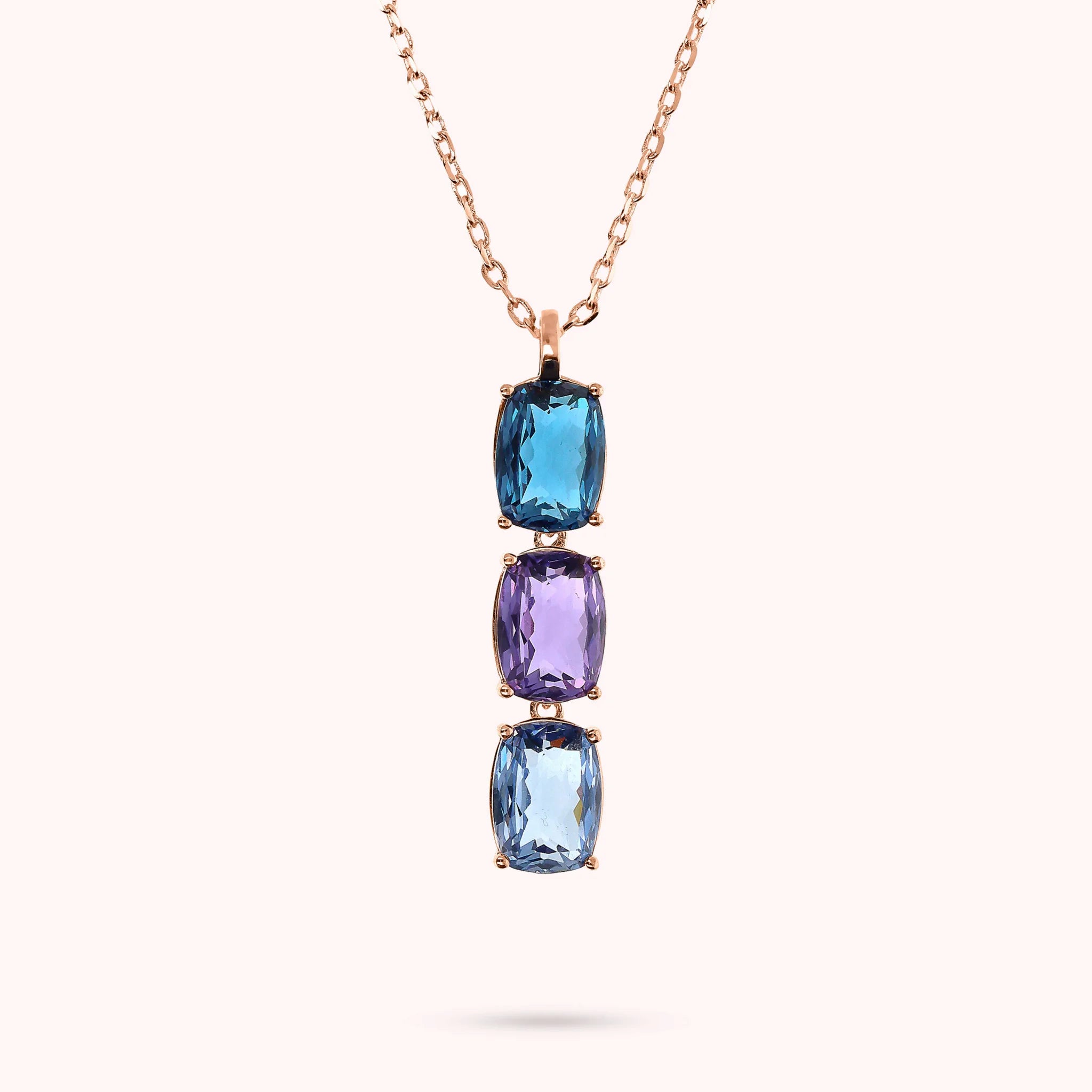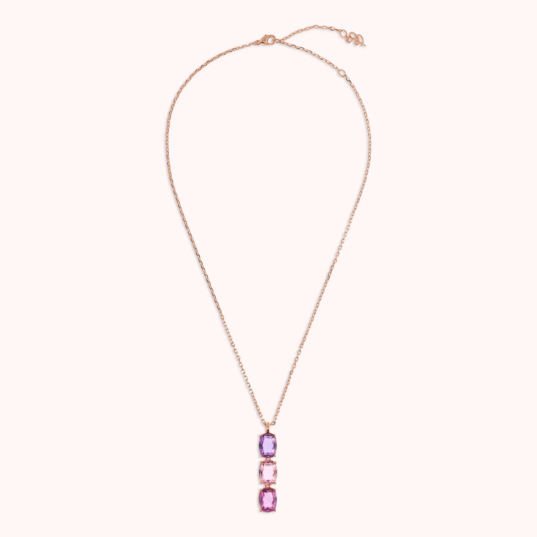 Necklace made of Golden Rosé alloy, 18kt rose gold plated, embellished with a pendant with rectangular gem prism stones (8x11 mm) with a mosaic cut. Lobster clasp closure with extender.