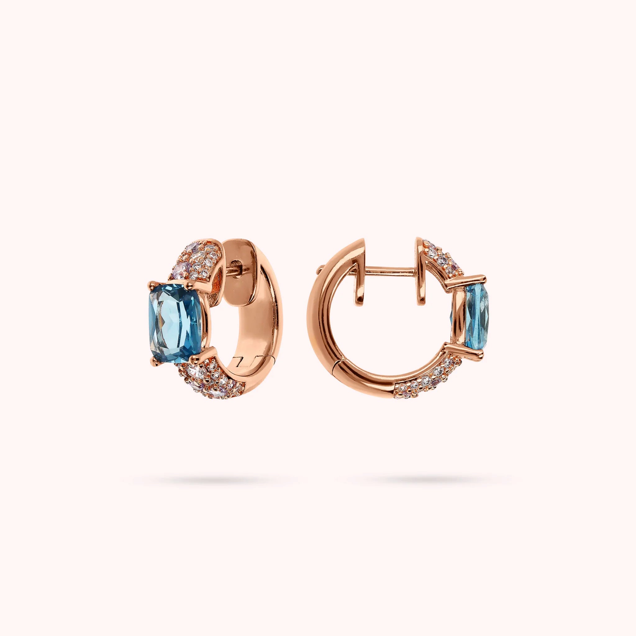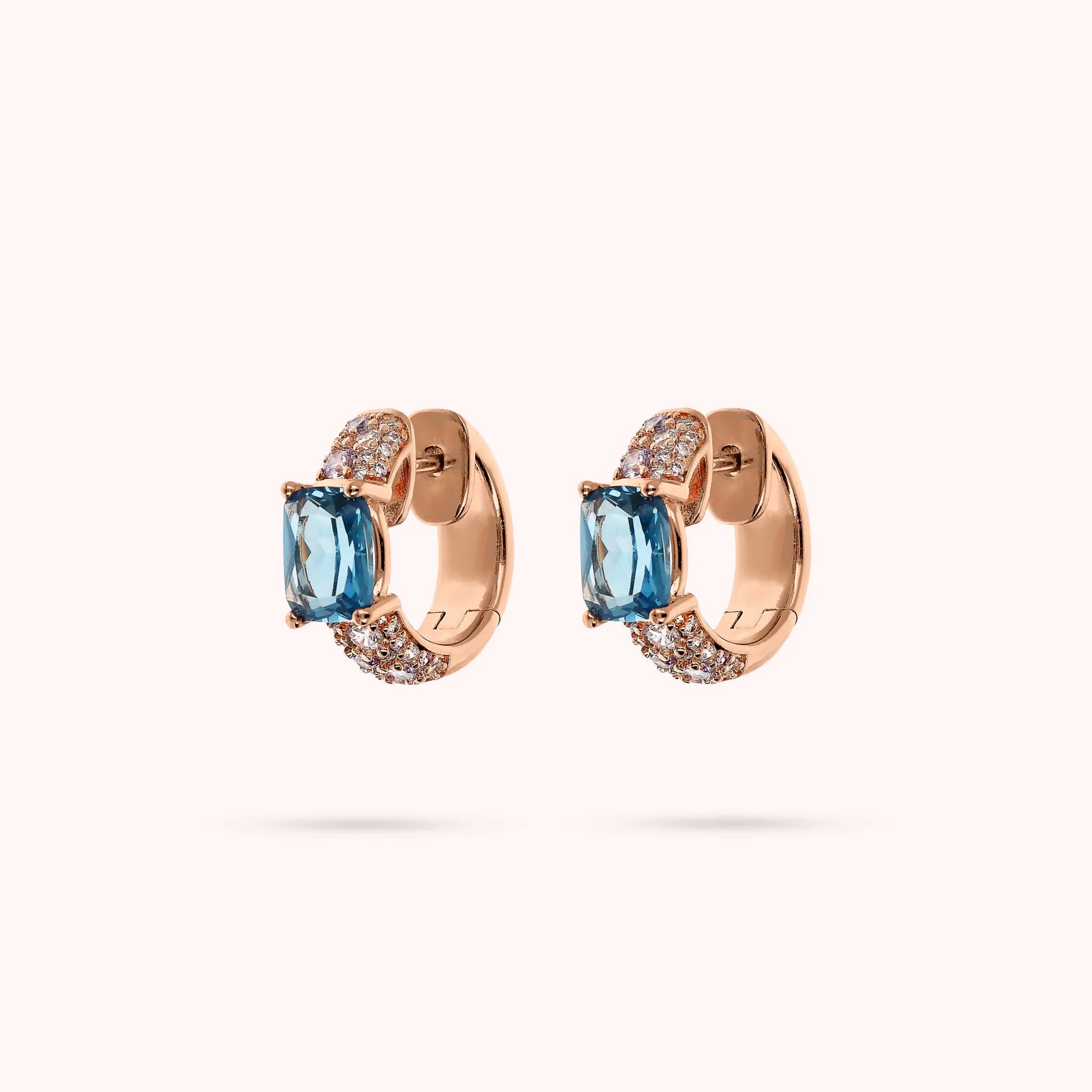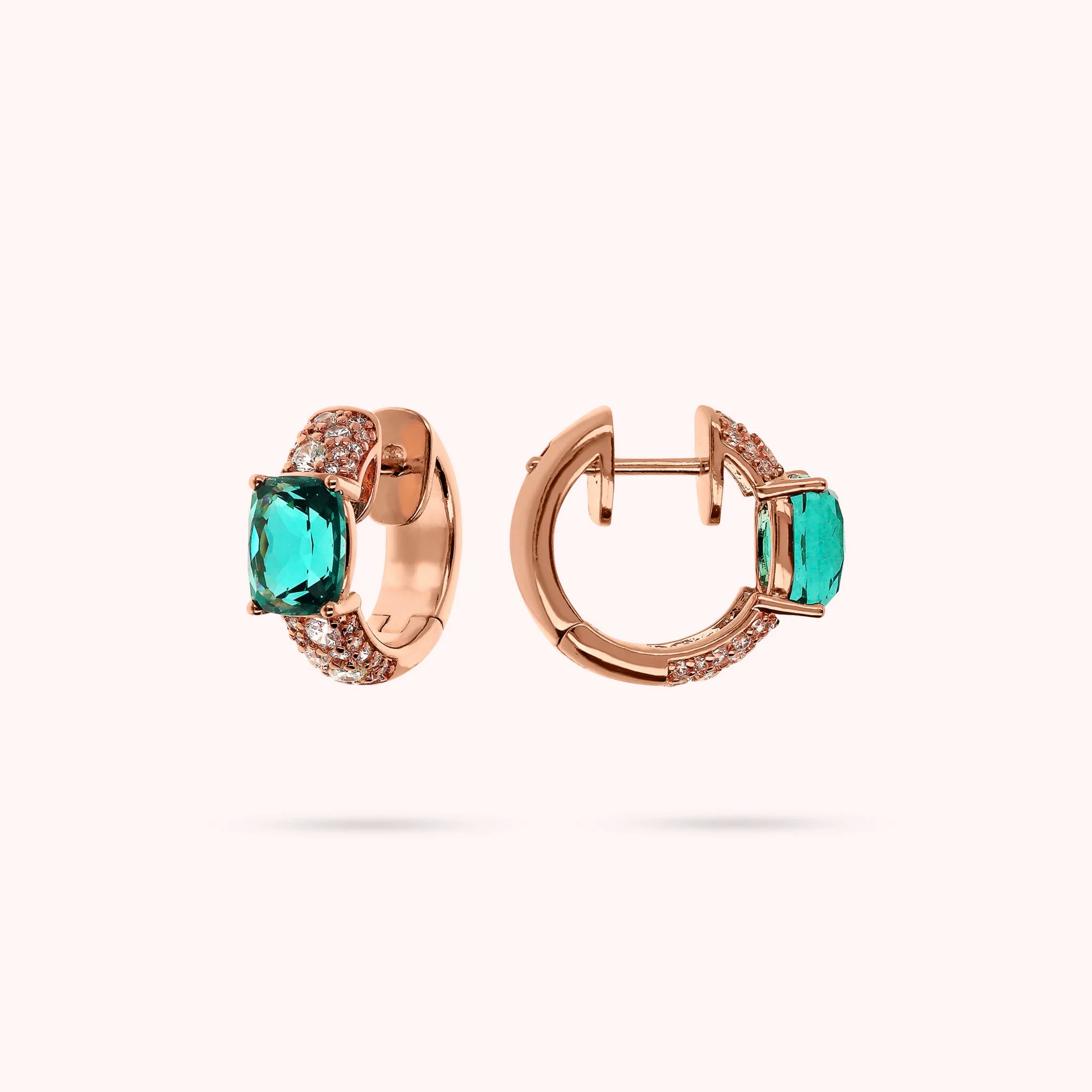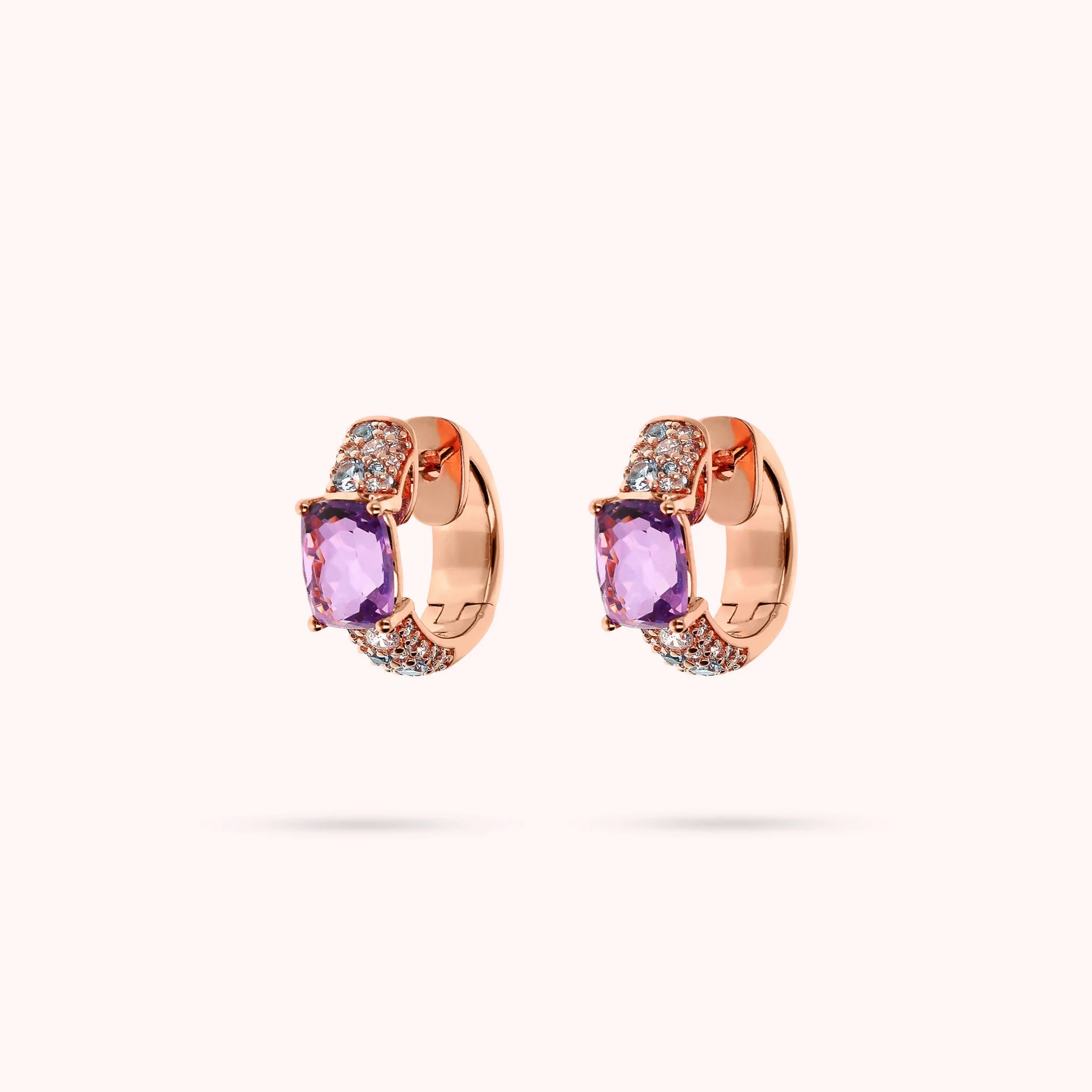 Bronzallure hoop earrings made of Golden Rosé alloy, 18kt rose gold plated, with cubic zirconia pavé surface, luminous quality, embellished with rectangular gem prism stones (8x5 mm) with a mosaic cut. Closure with interlocking pin. External diameter 1.5 cm.
