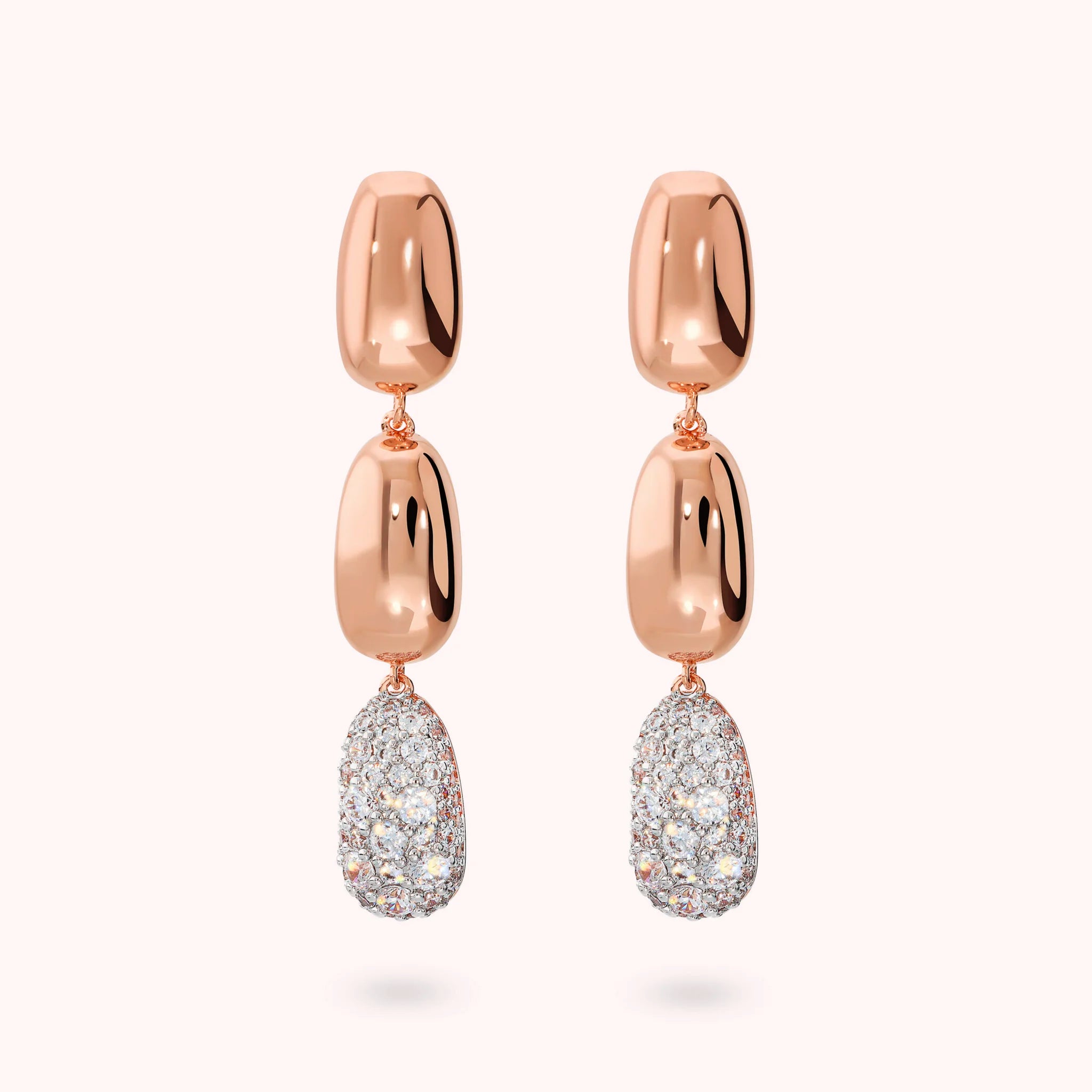 Bronzallure drop earrings made of Golden Rosé alloy, 18kt gold plated, with alternating shiny nuggets and pavé elements of cubic zirconia, luminous quality. Post and butterfly closure.