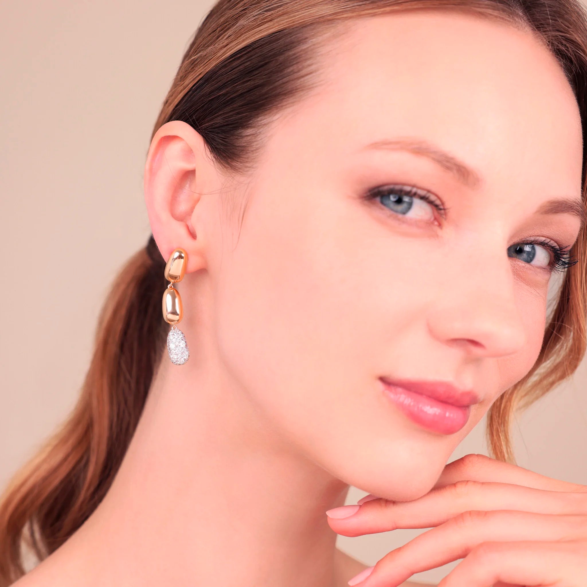 Orecchini che brillano ad ogni movimento, con pepite lucide e bagliori delicati che accendono il volto di un’eleganza naturale. Un tocco di luce semplice e raffinato, da indossare ogni giorno.
