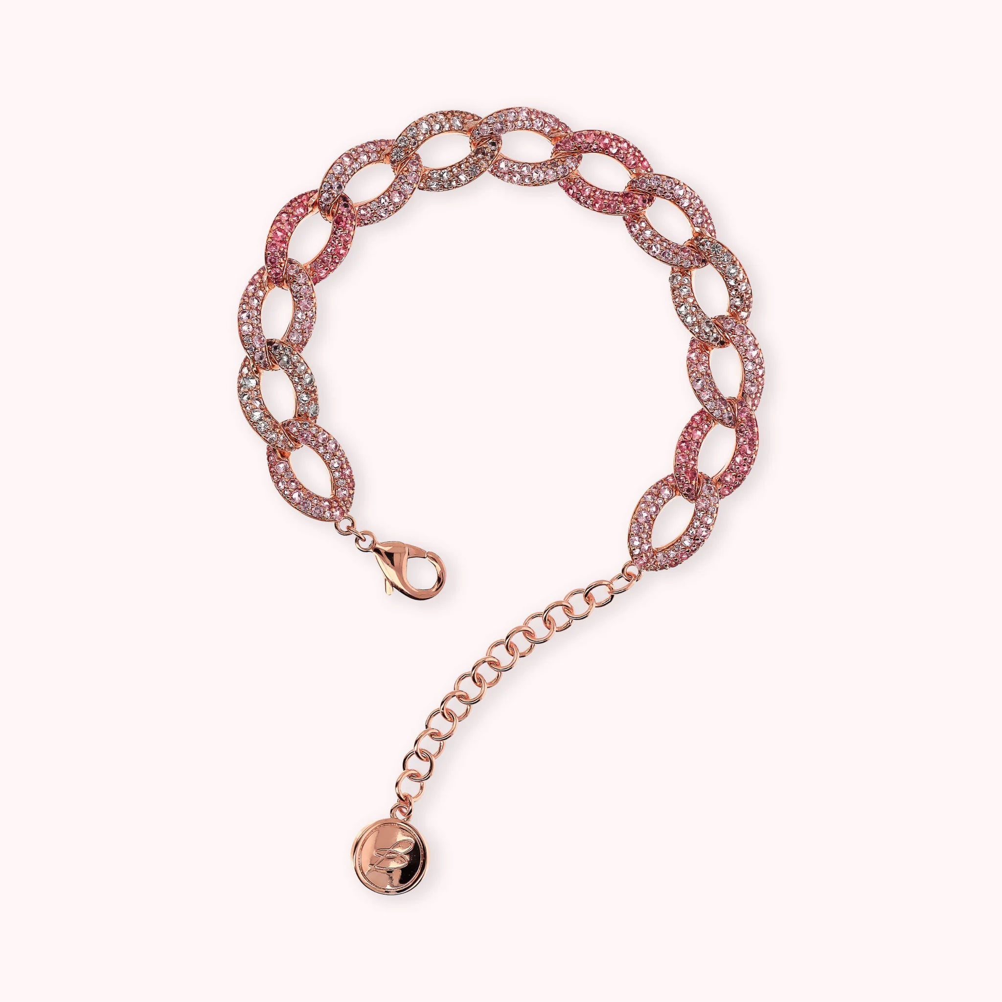 Bracelet made of Golden Rosé alloy, 18kt rose gold plated, with squared curb chain and cubic zirconia pavé surface, luminous quality. Lobster clasp closure.