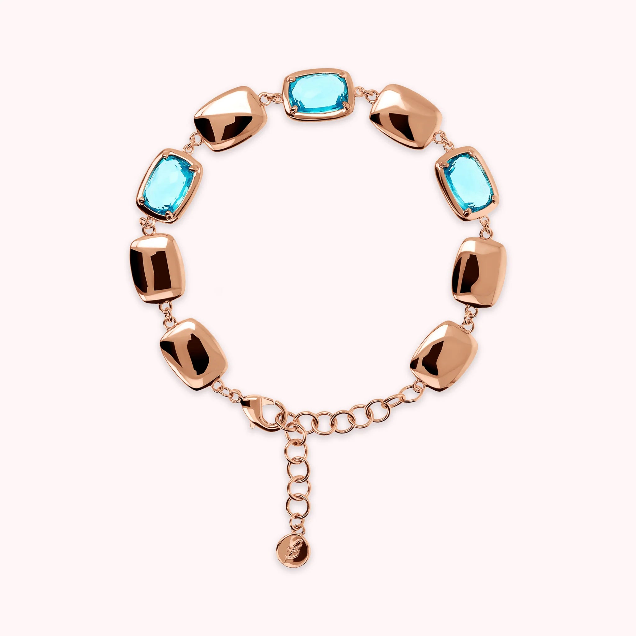Bronzallure bracelet made of Golden Rosé alloy, plated with 18kt Rose Gold, featuring shiny rectangular elements (13x9 mm) alternated with baguette-cut gem prism stones (11x8 mm). Length 17+4.5 cm extension. Lobster clasp.
