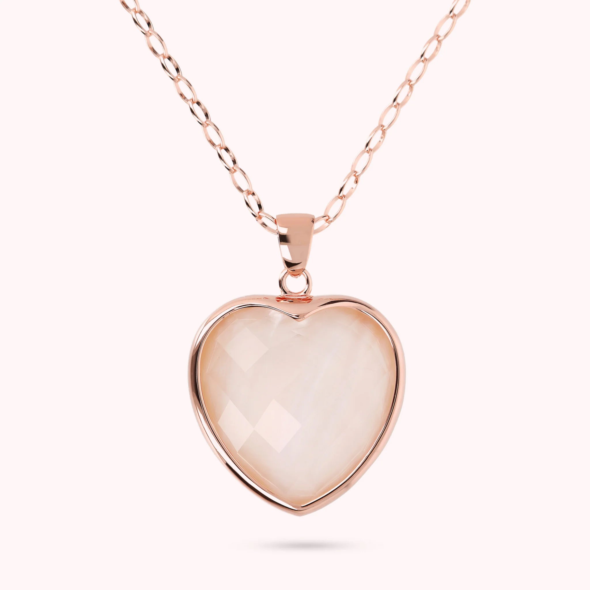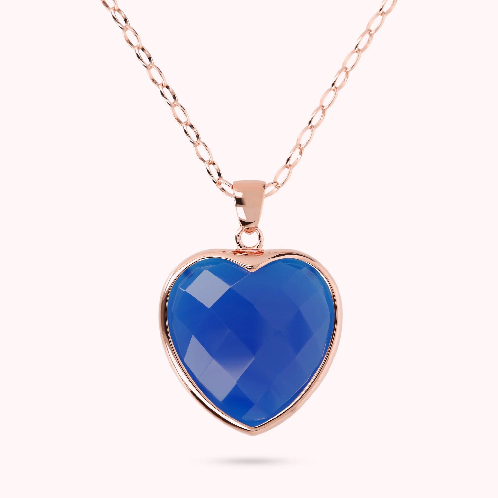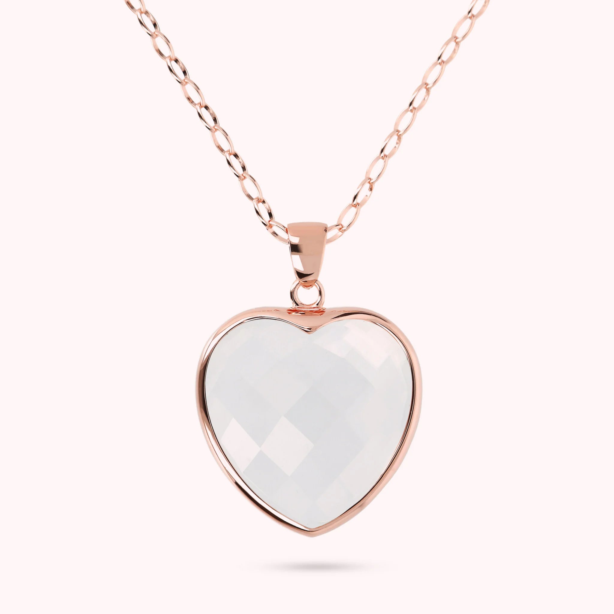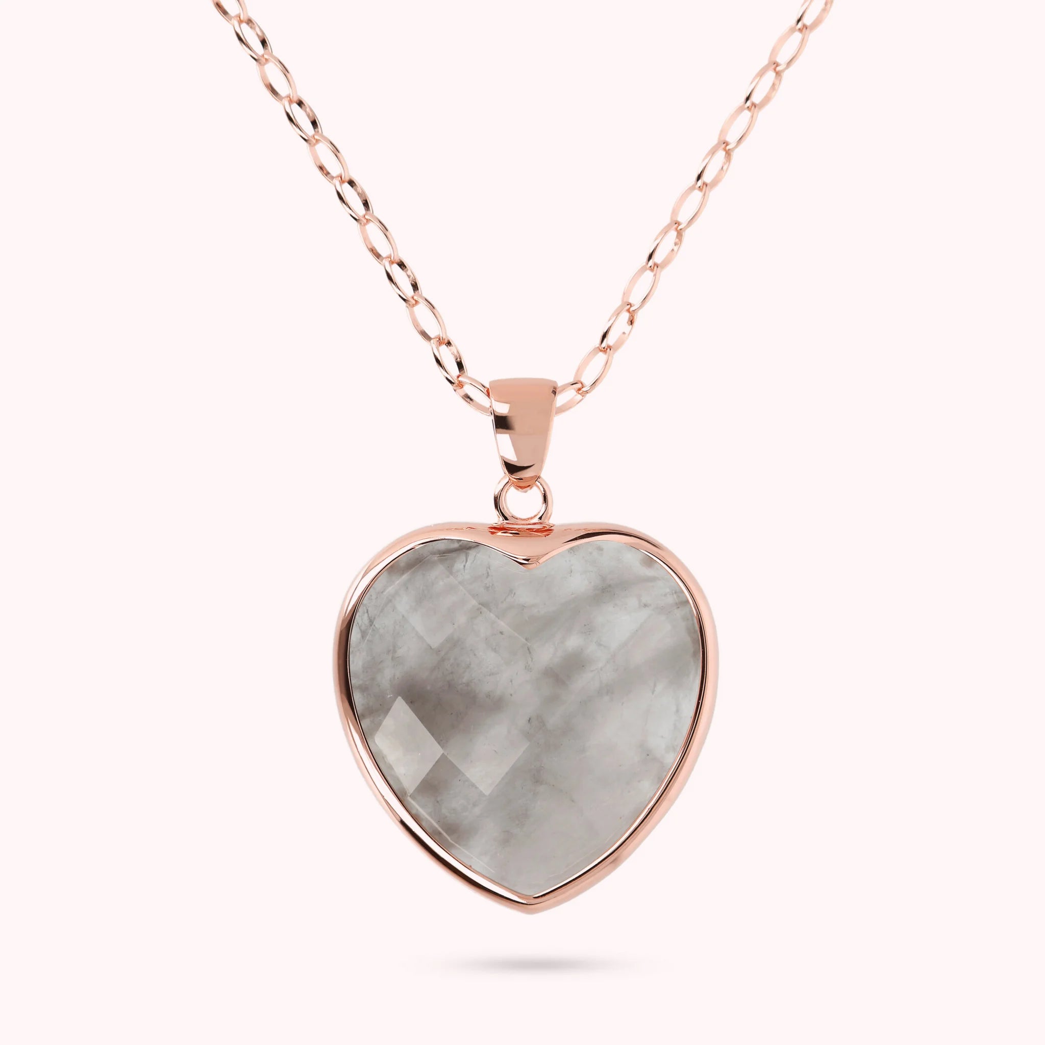 Long Oval Rolo Chain Necklace with Heart Pendant in Faceted Natural Stone