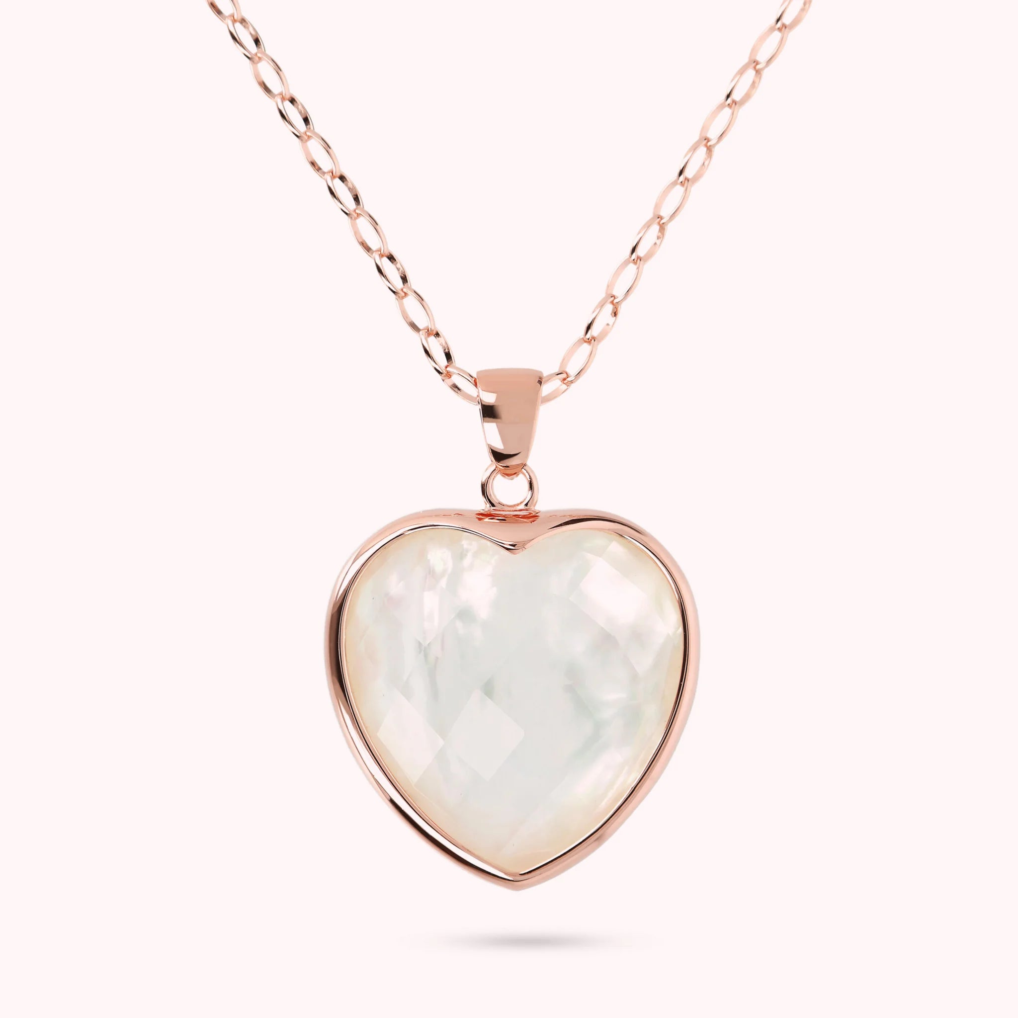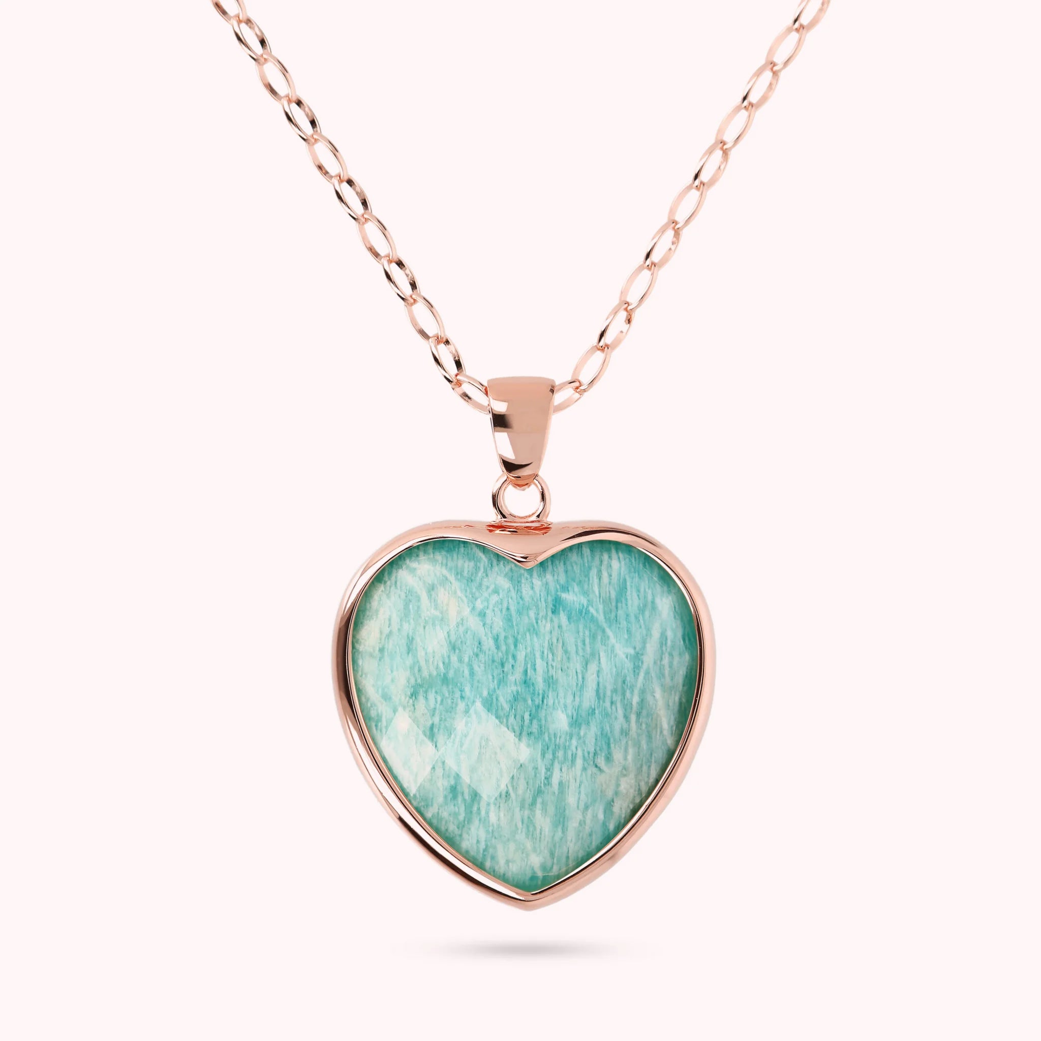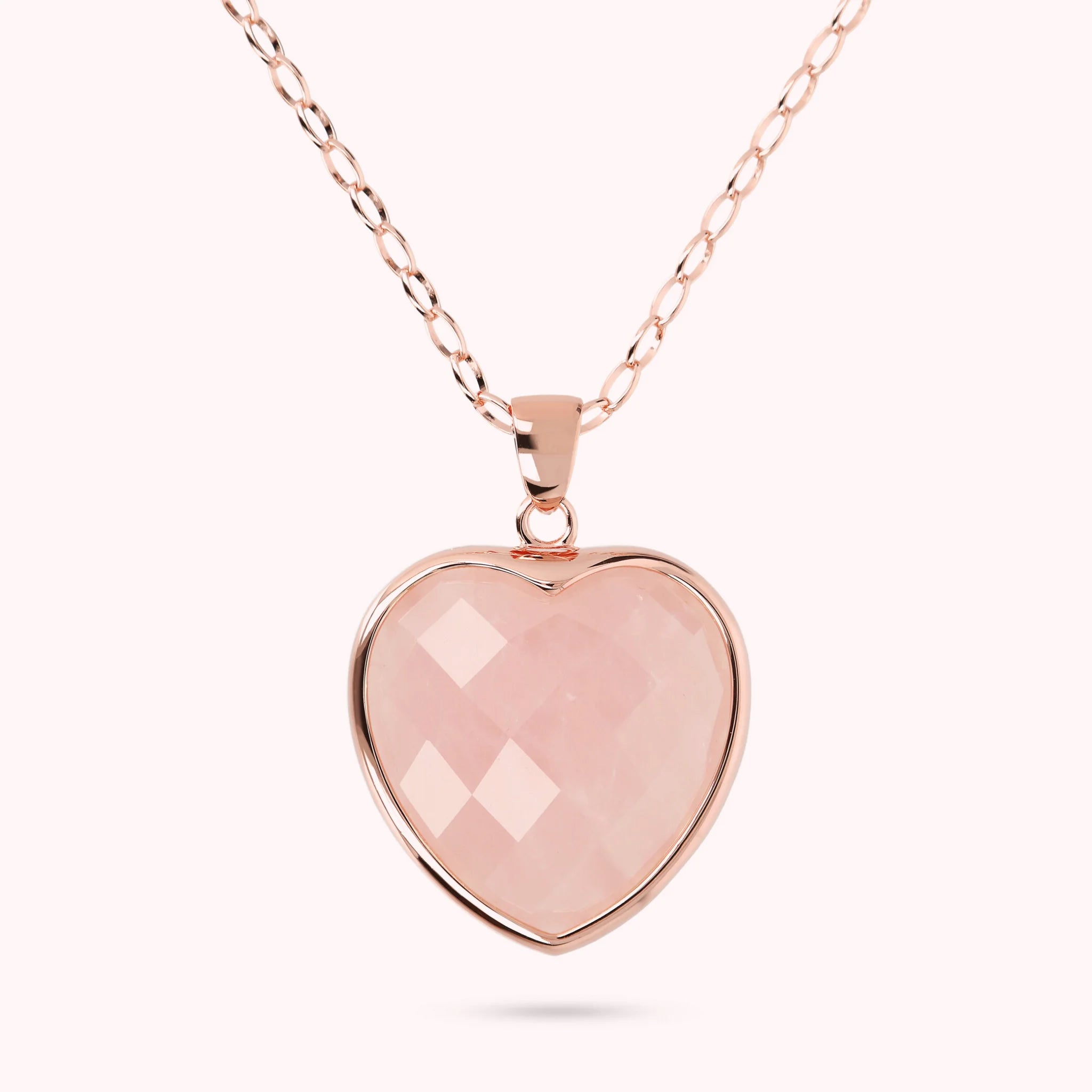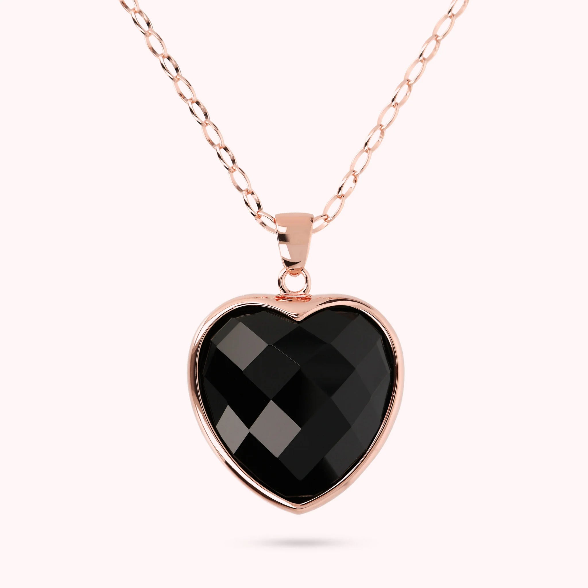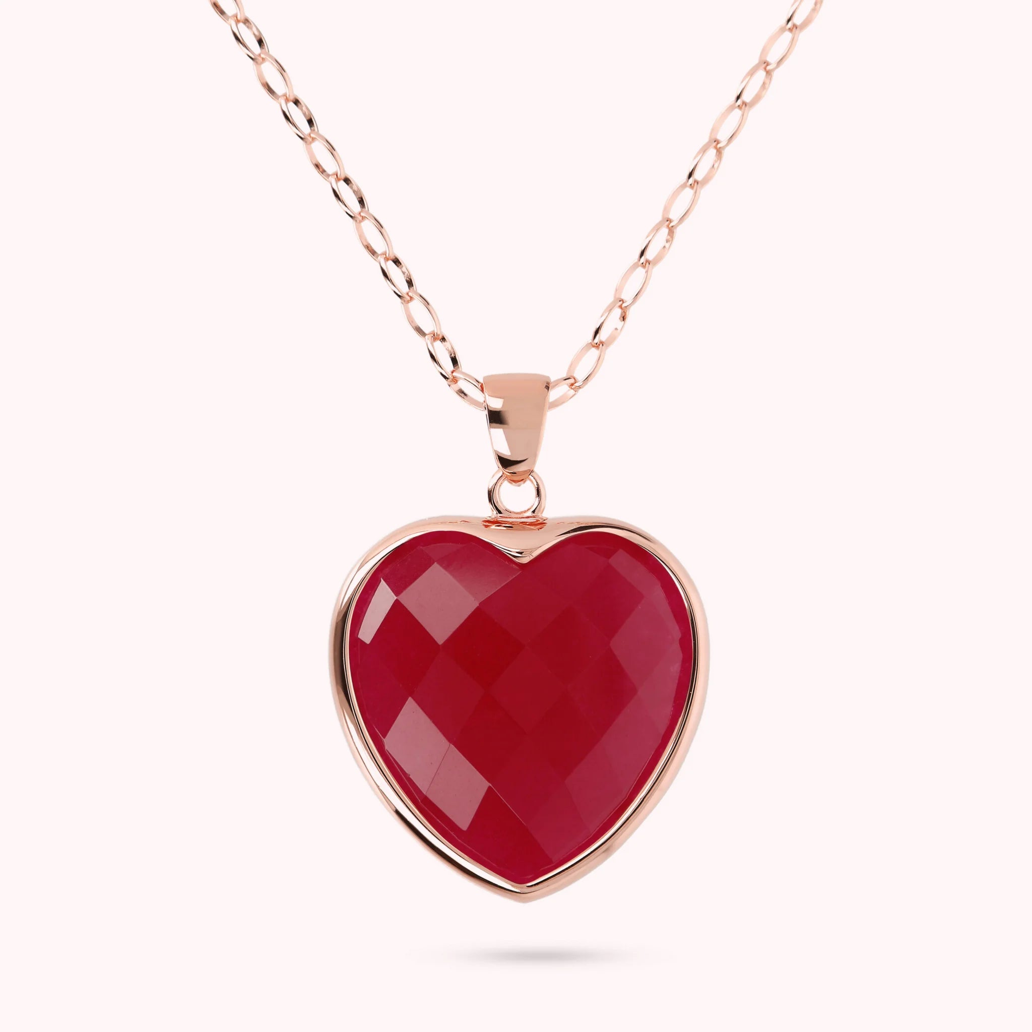 Long Oval Rolo Chain Necklace with Heart Pendant in Faceted Natural Stone