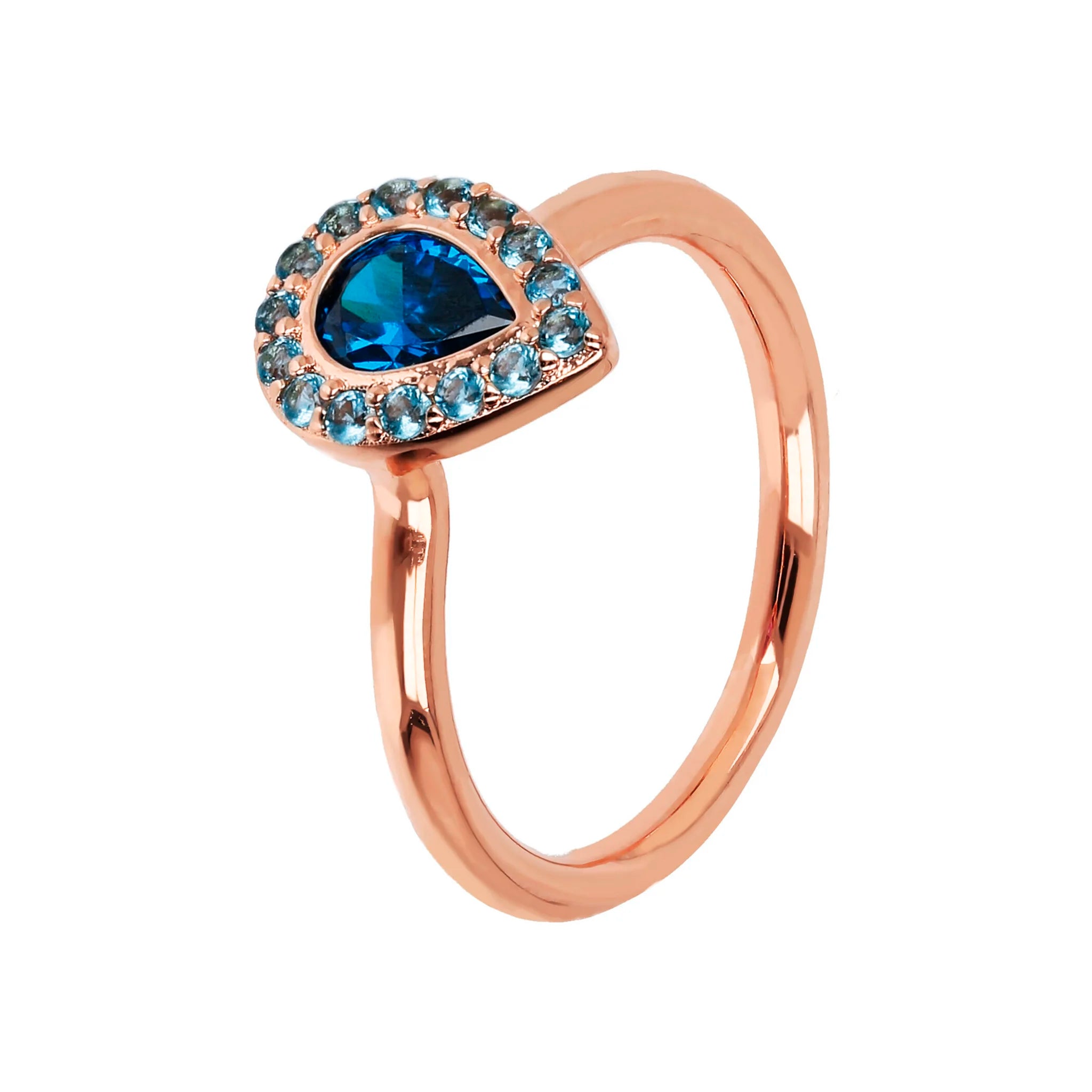 Bronzallure solitaire ring made of 18kt yellow gold-plated Golden Rosé alloy, embellished with a teardrop-shaped cubic zirconia element surrounded by tiny light spots.