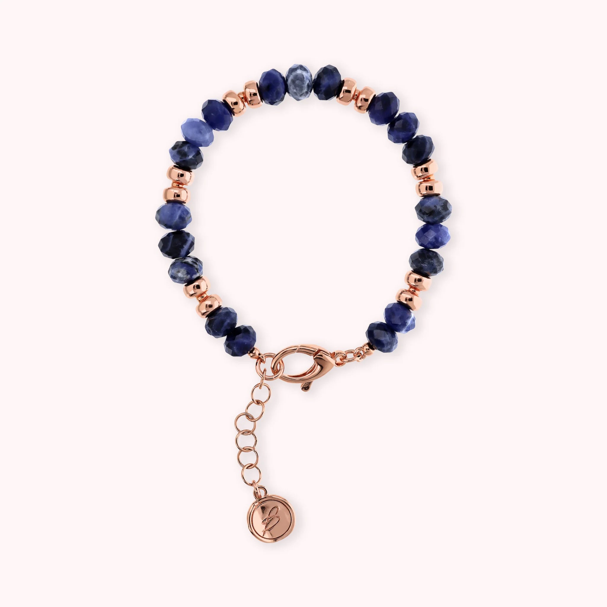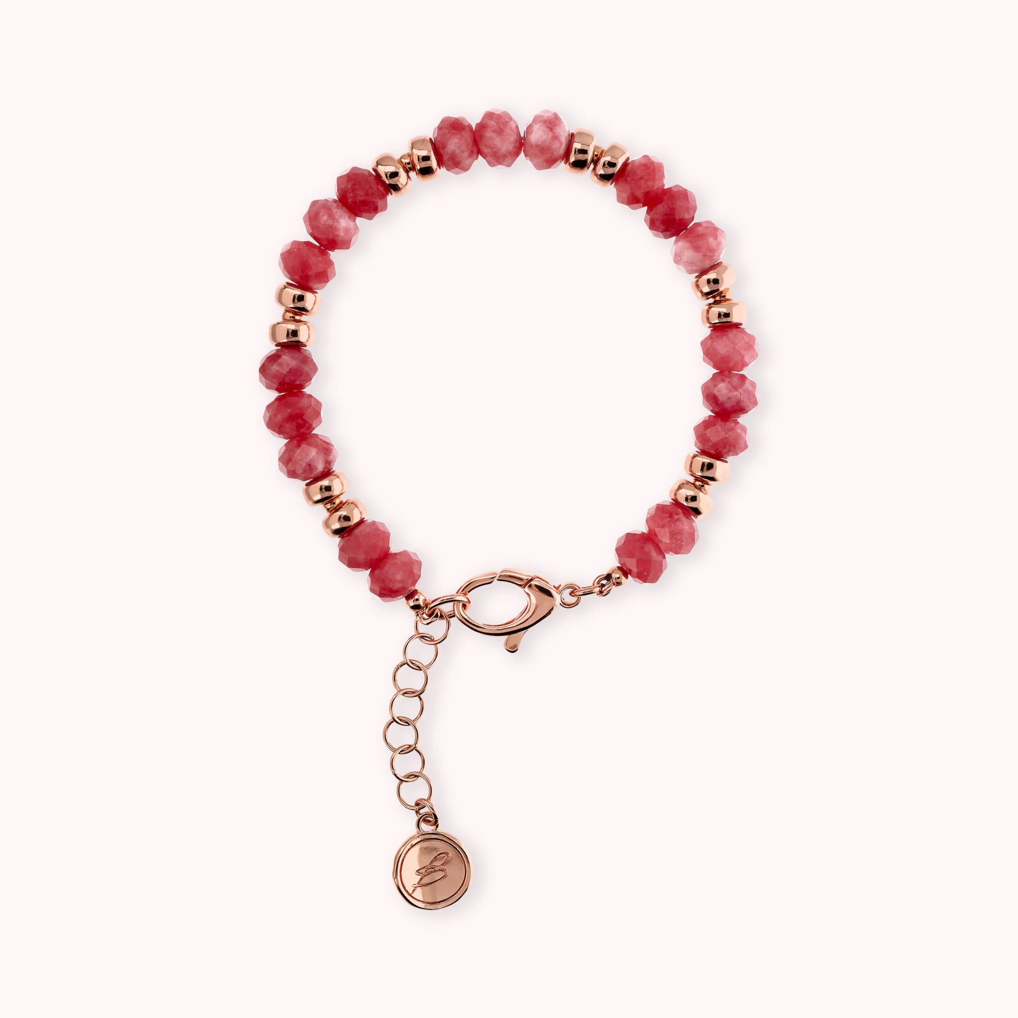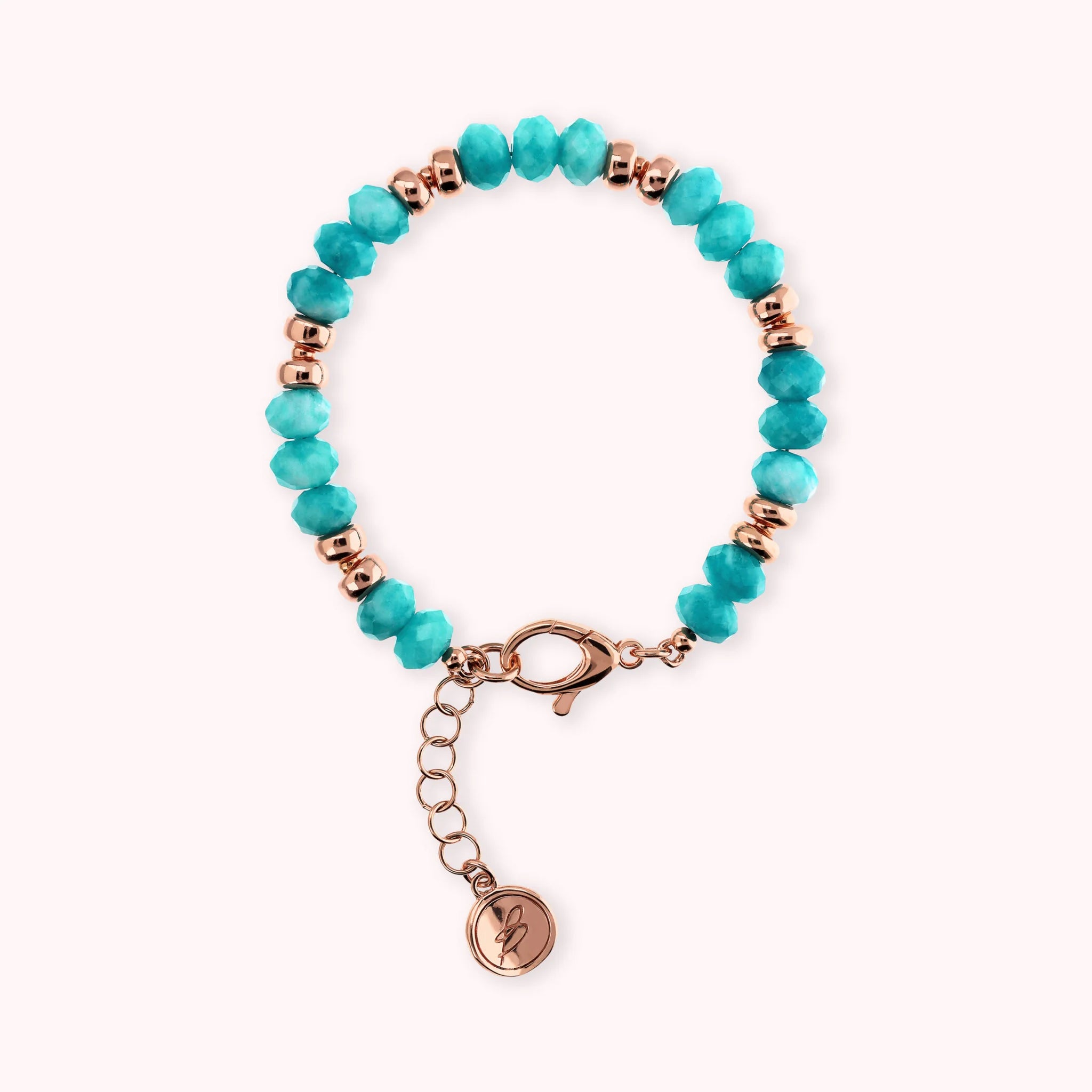 Bracelet made of Golden Rosé alloy, 18kt rose gold plated, embellished with faceted natural stones (8 mm) alternating with shiny Golden Rosé washers. Lobster clasp closure.