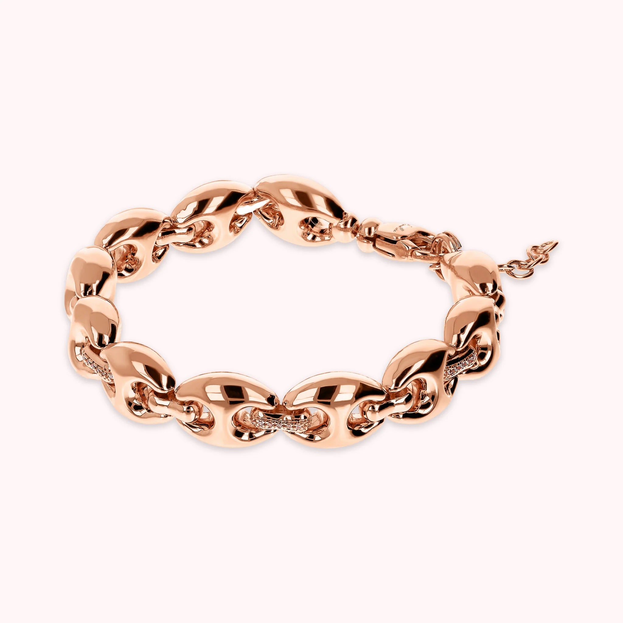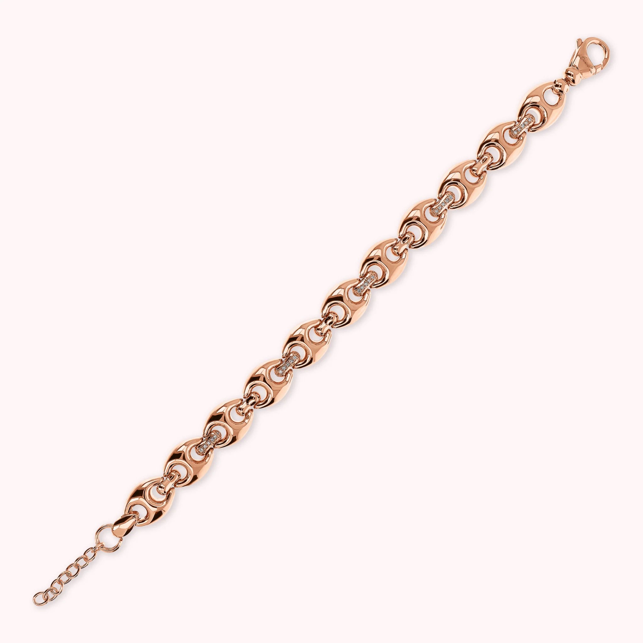 Bronzallure bracelet made of Golden Rosé alloy, 18kt rose gold plated, with shiny marine links alternating with cubic zirconia pavé elements, luminous quality. Length 21+2.5 cm extension. Lobster clasp closure.