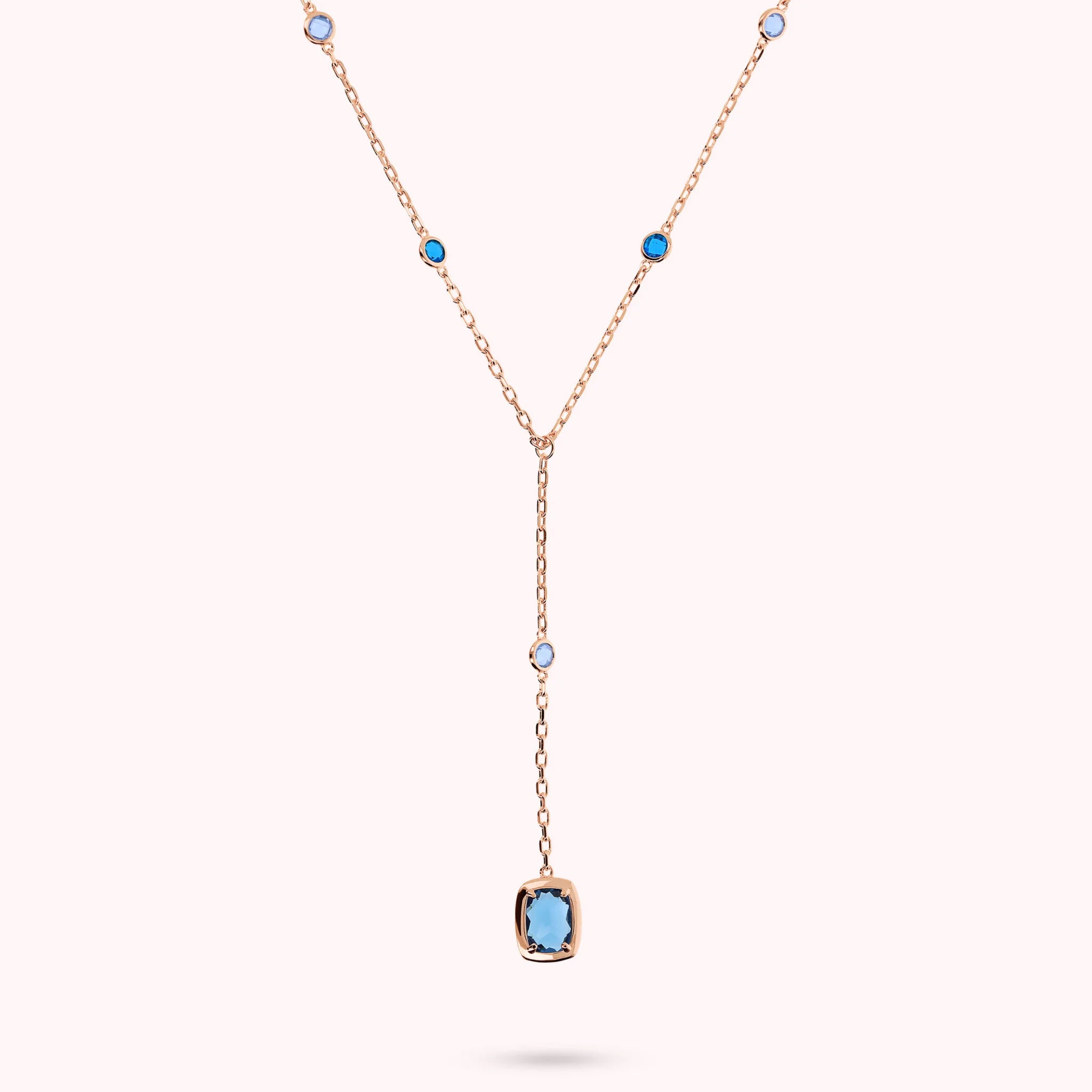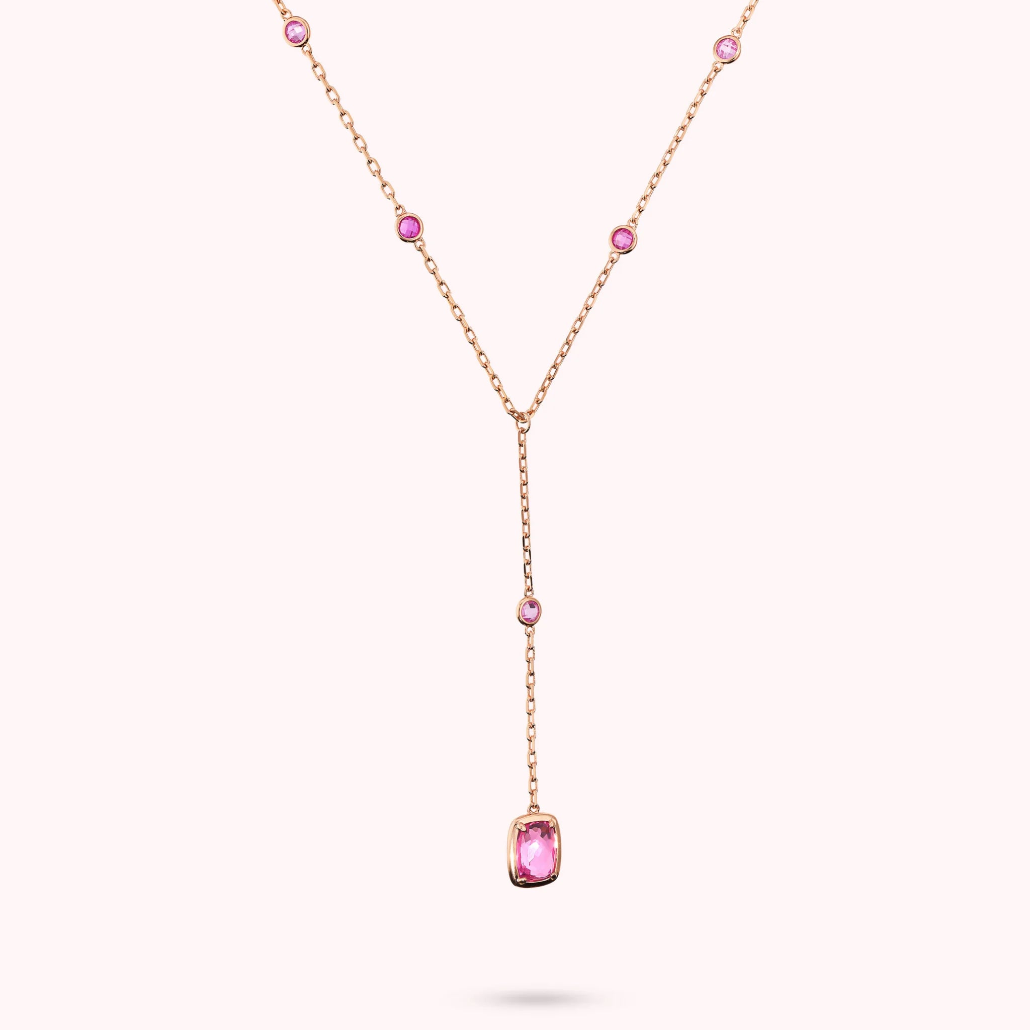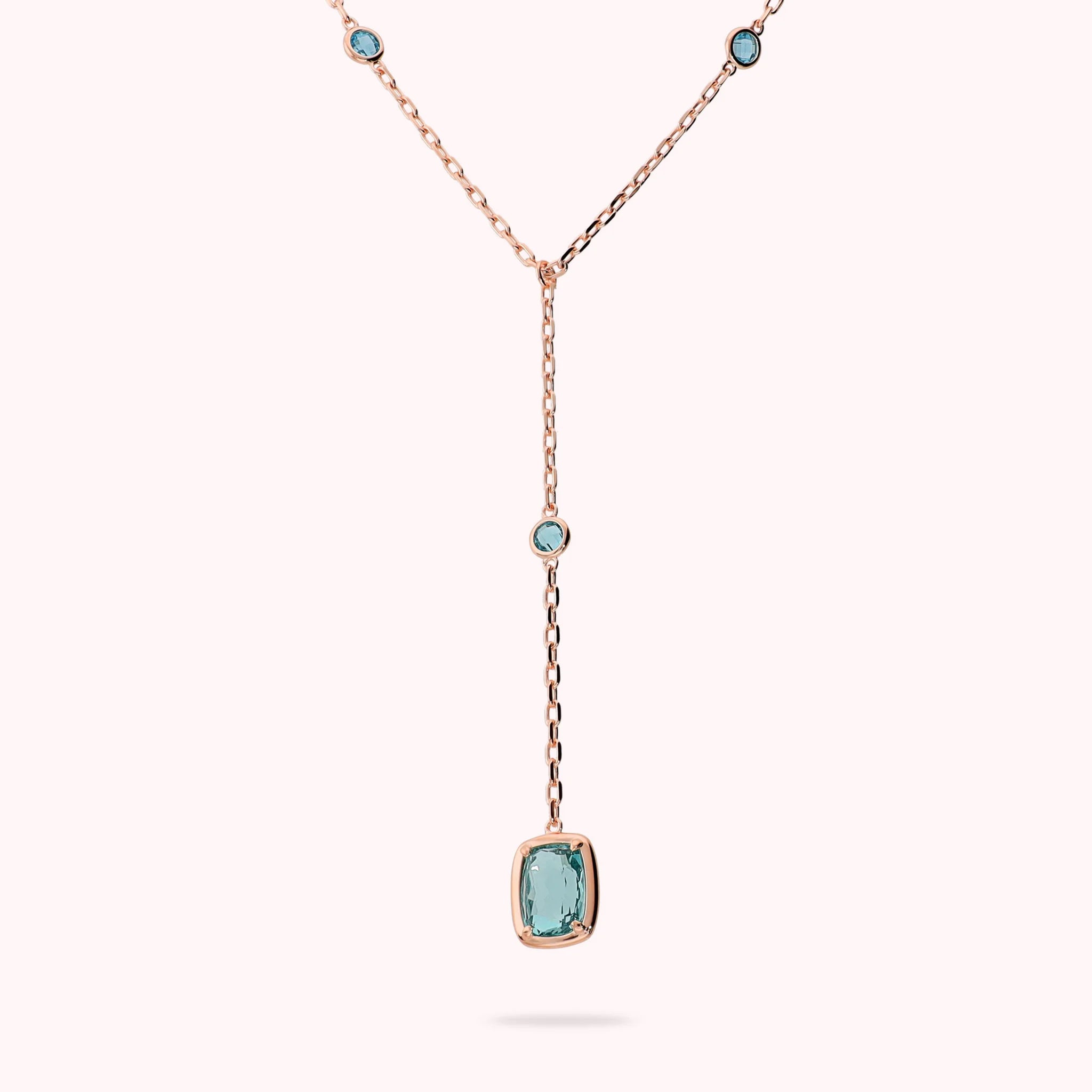 Bronzallure tie necklace made of Golden Rosé alloy, plated with 18kt Rose Gold, featuring a forzatina chain embellished with shiny rectangular nuggets (11x8 mm) alternating with round gem prism stones (4.5 mm) and baguettes (11x8 mm). Length 38+8 cm drop. Lobster clasp with a 5cm extension.