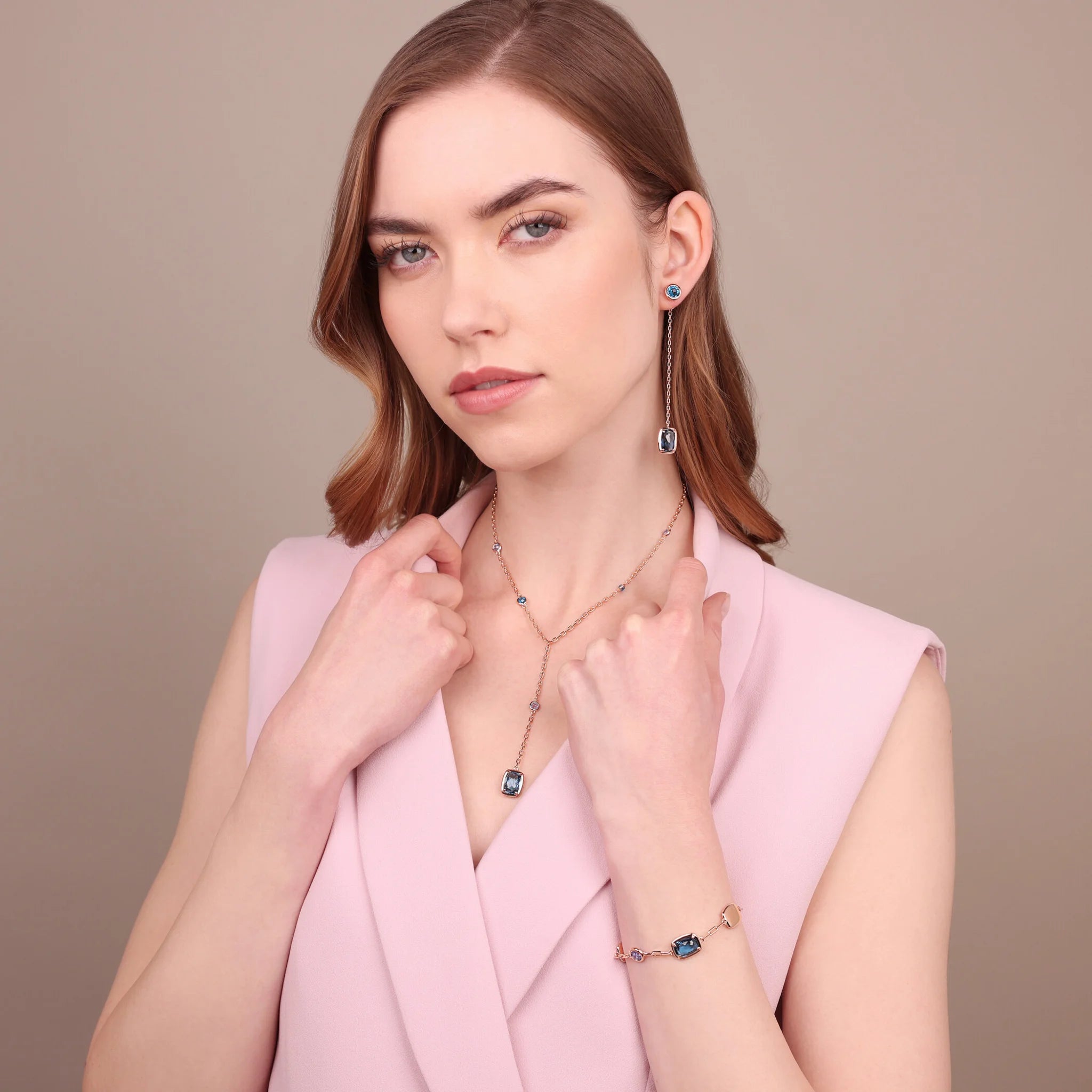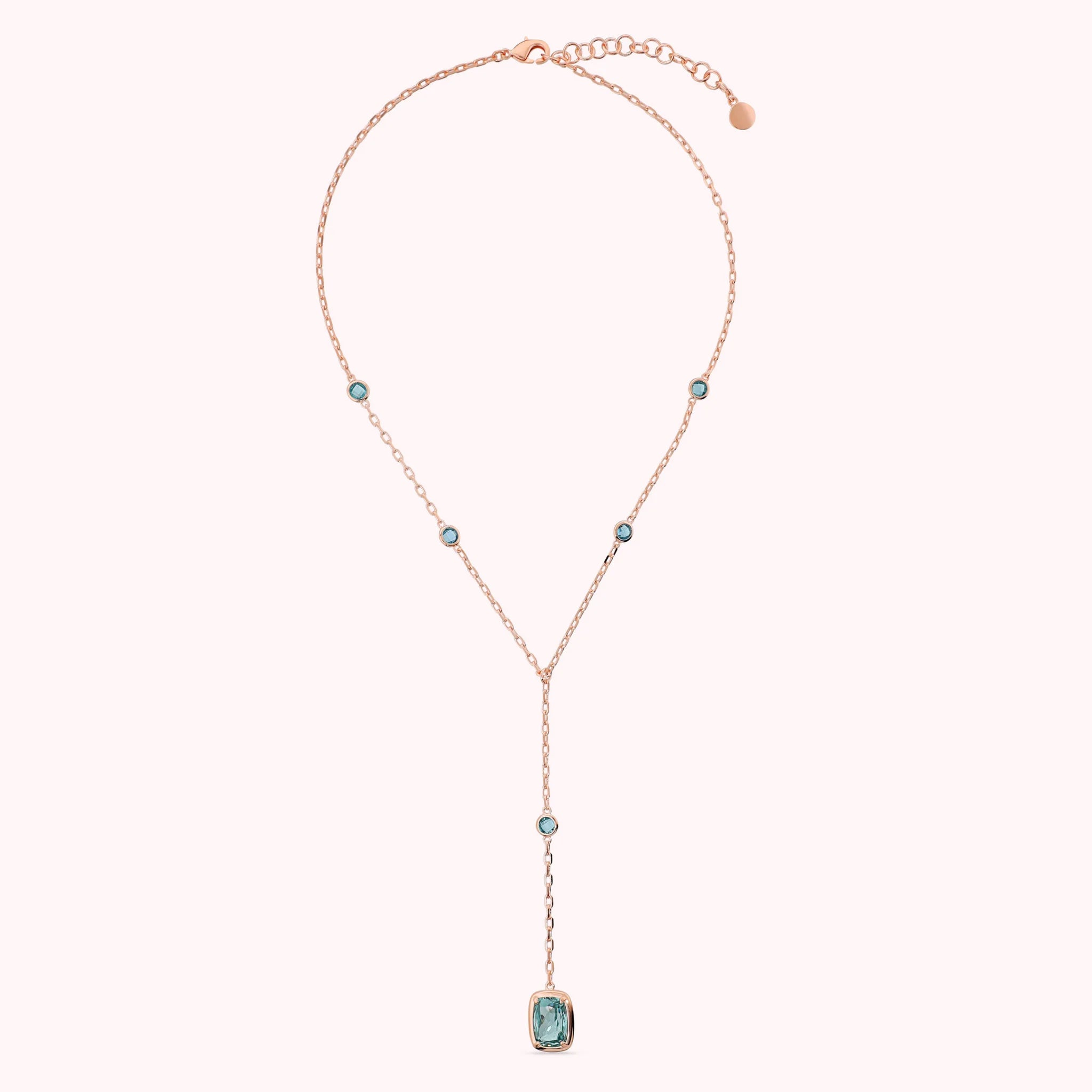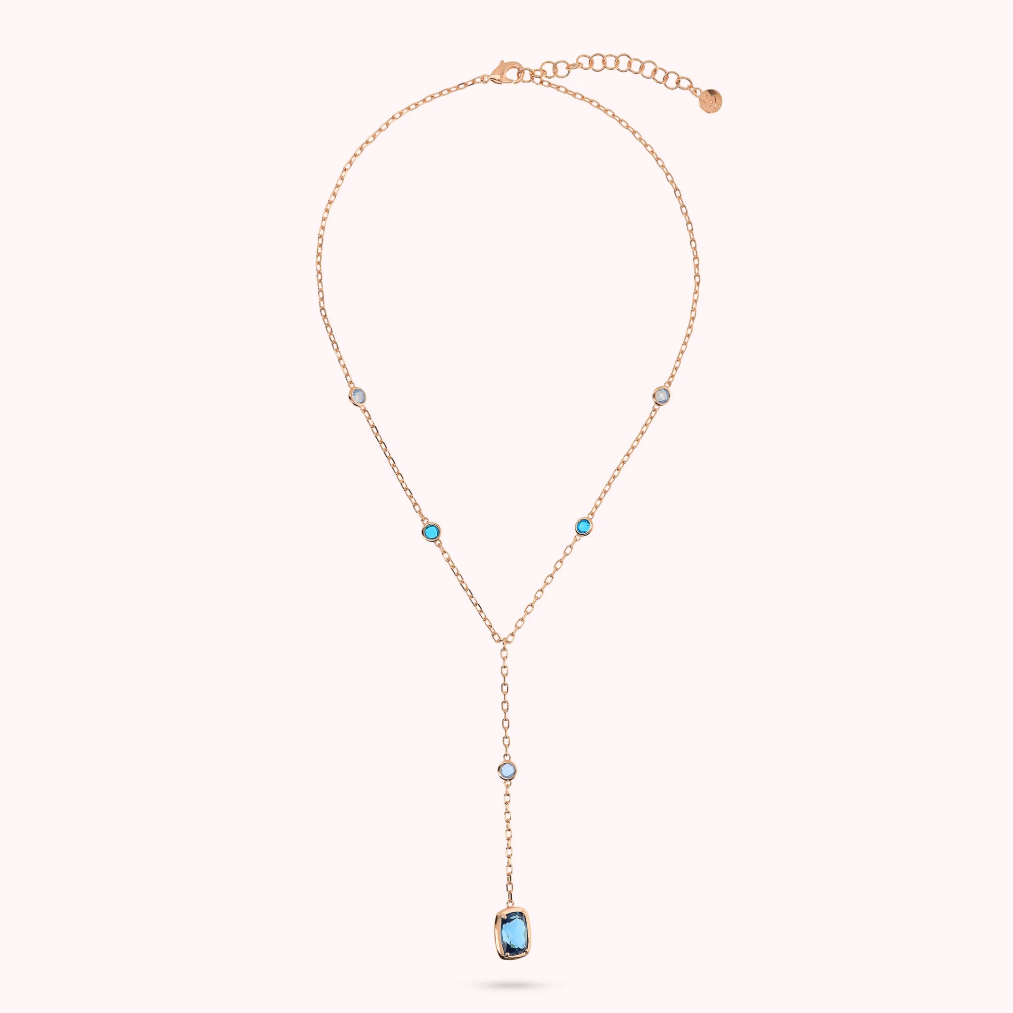 Bronzallure tie necklace made of Golden Rosé alloy, plated with 18kt Rose Gold, featuring a forzatina chain embellished with shiny rectangular nuggets (11x8 mm) alternating with round gem prism stones (4.5 mm) and baguettes (11x8 mm). Length 38+8 cm drop. Lobster clasp with a 5cm extension.