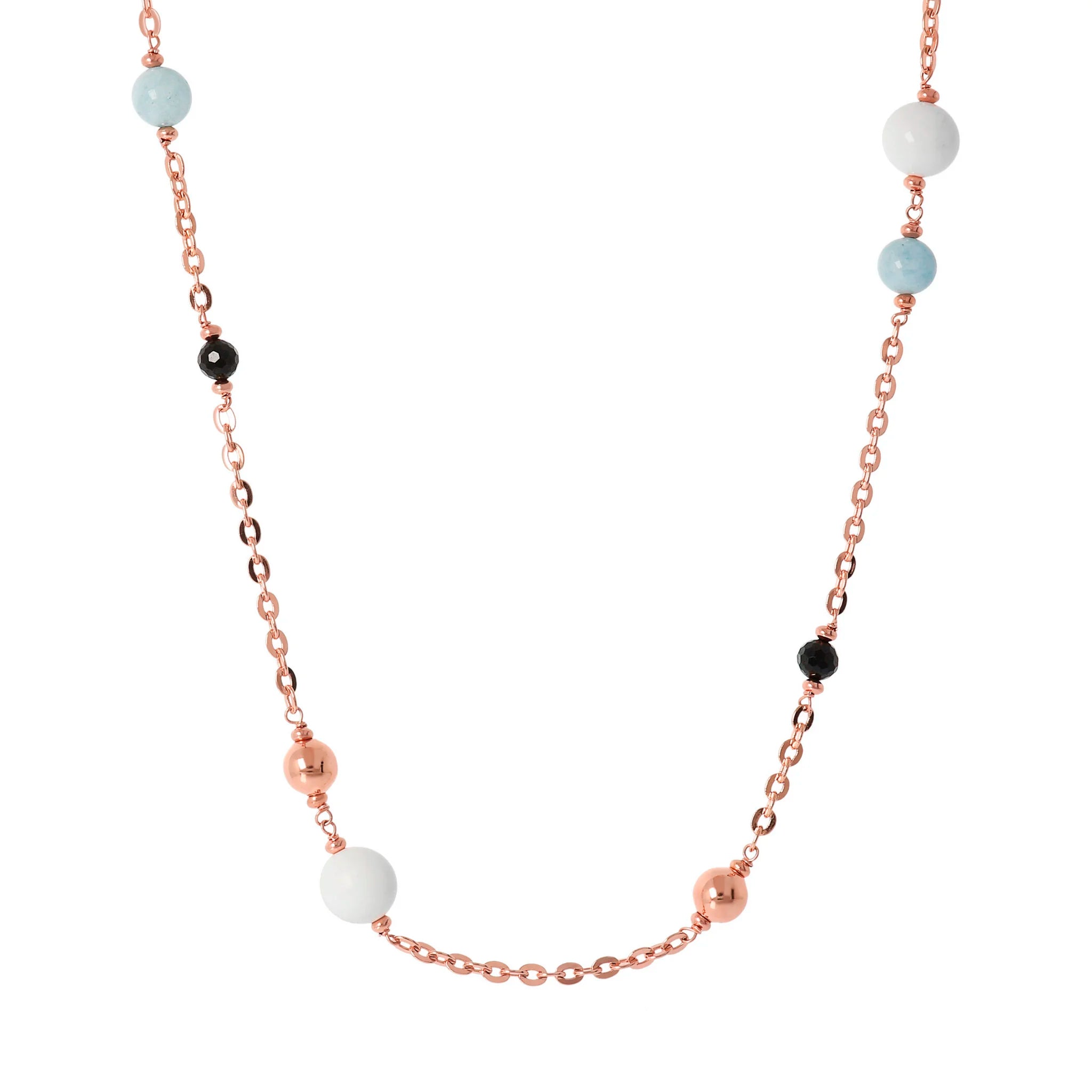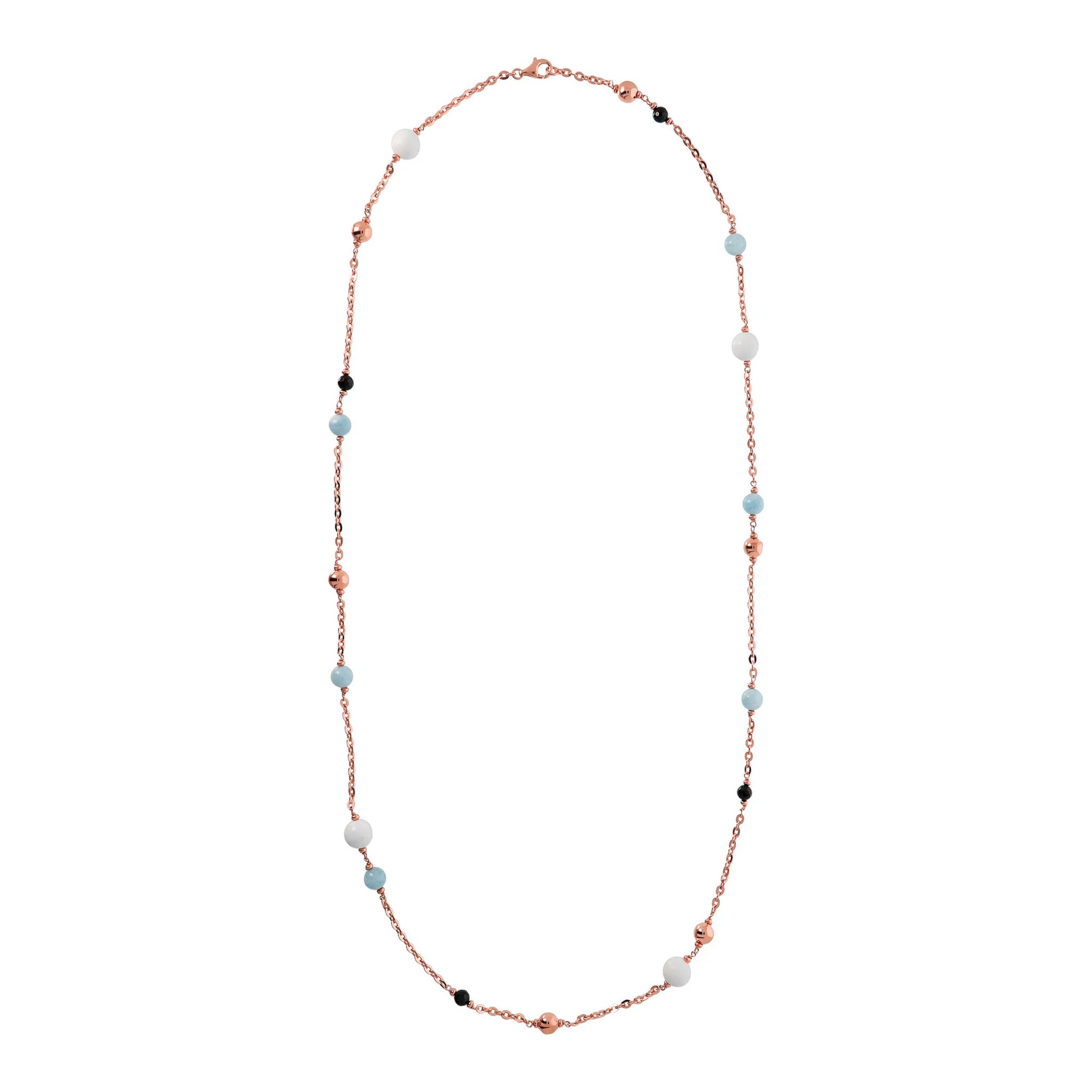 Bronzallure long necklace made of Golden Rosé alloy, 18kt rose gold plated, with rolo chain embellished with small spheres in Golden Rosé and natural stones: black spinel (6 mm), blue aquamarine (8 mm) and white agate (10 mm); lobster clasp closure.