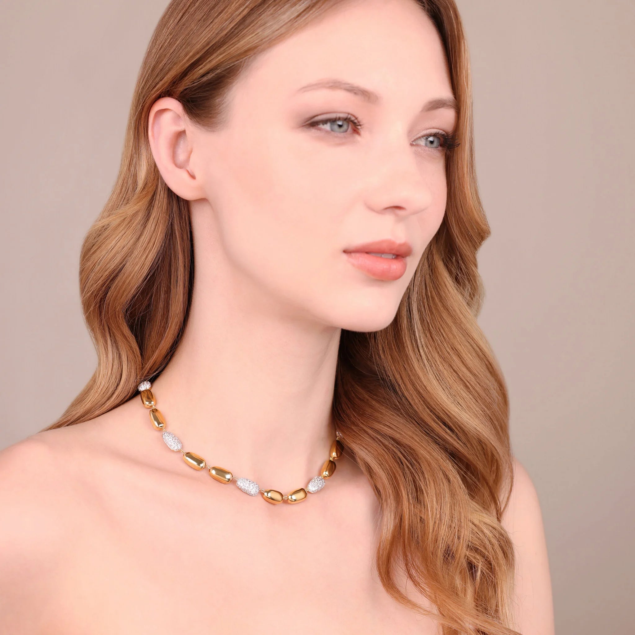 Shiny nuggets alternate with delicate sparkling details, for a choker that captures the light and illuminates the décolleté with natural elegance.