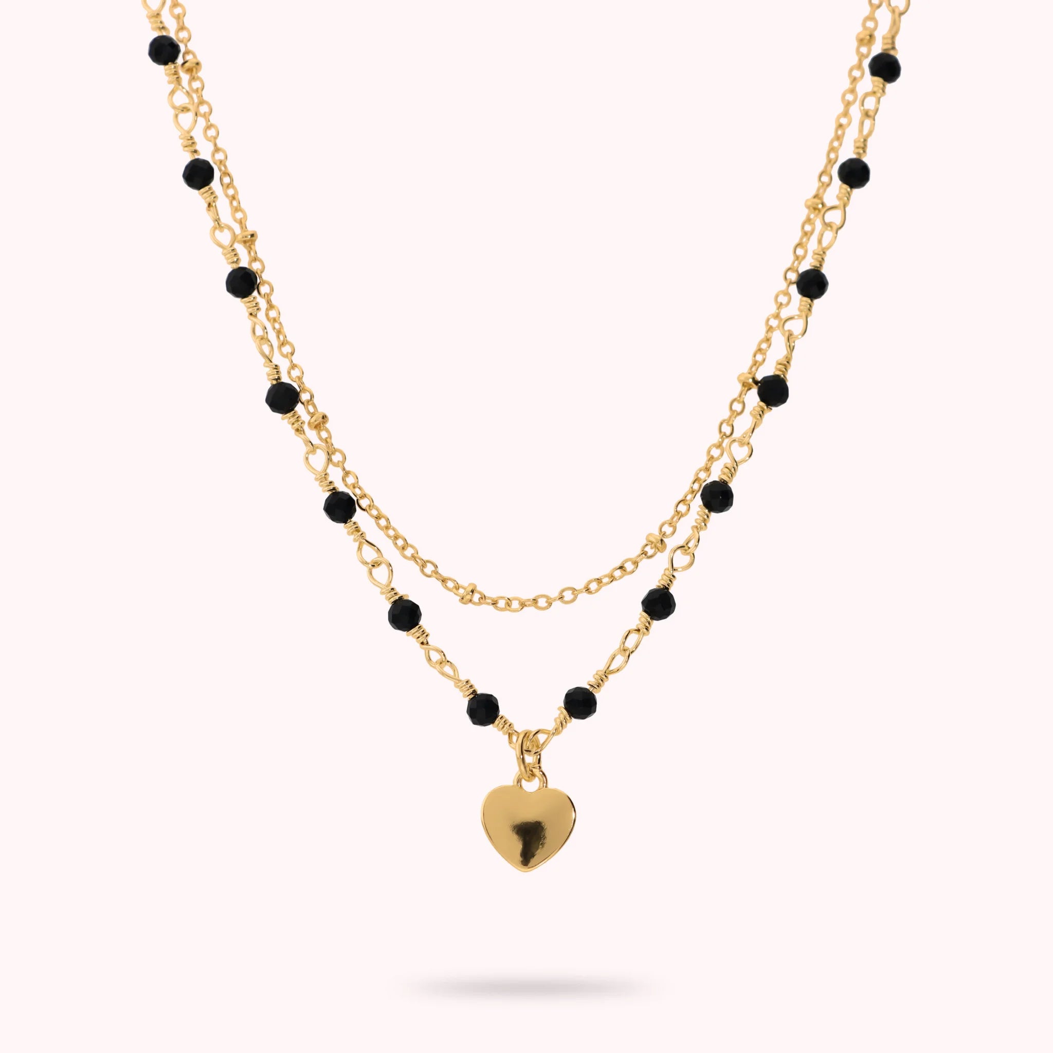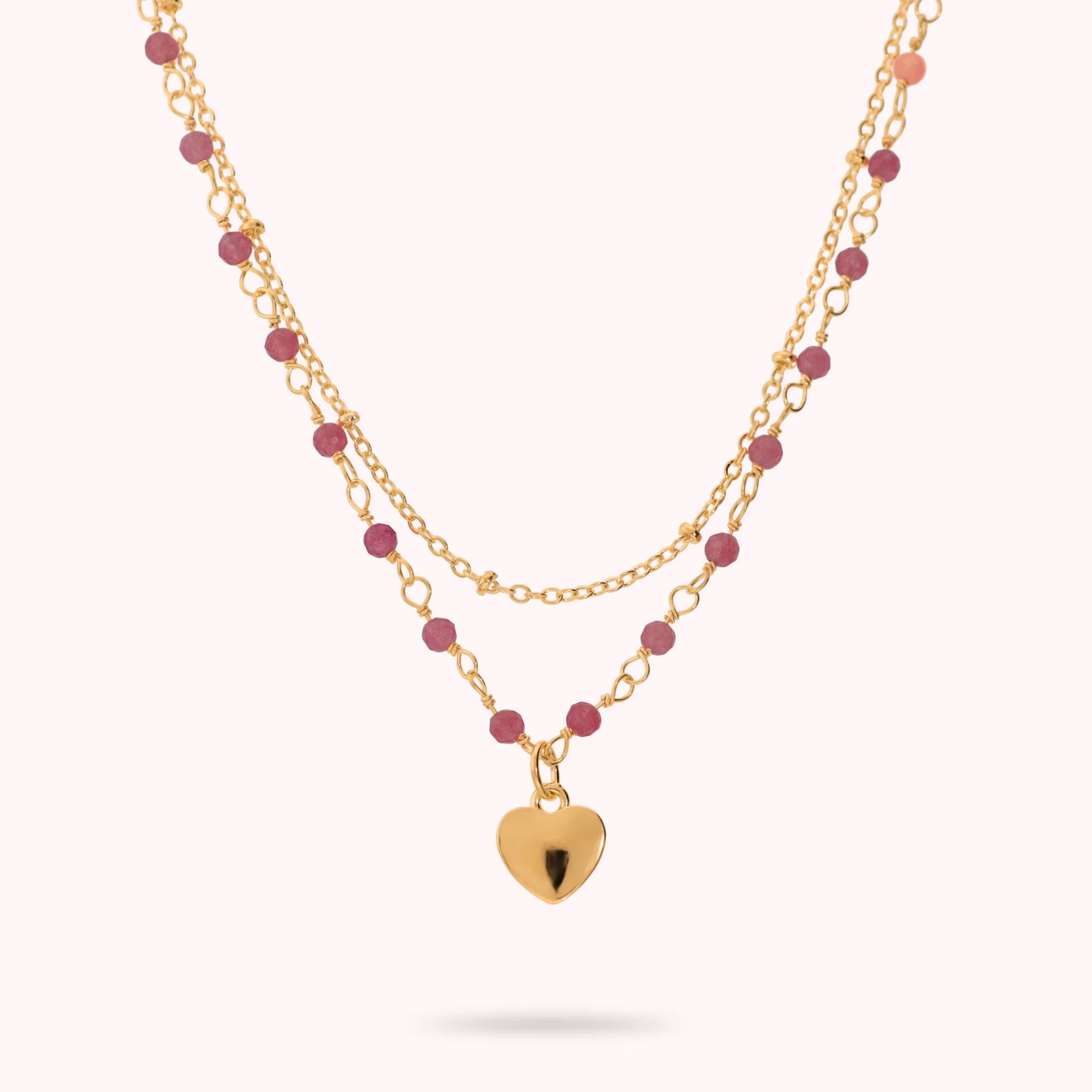 Un doppio filo che gioca con luce e colore: la delicatezza delle pietre naturali incontra la brillantezza della catena, mentre un cuore lucido aggiunge un tocco romantico e senza tempo.