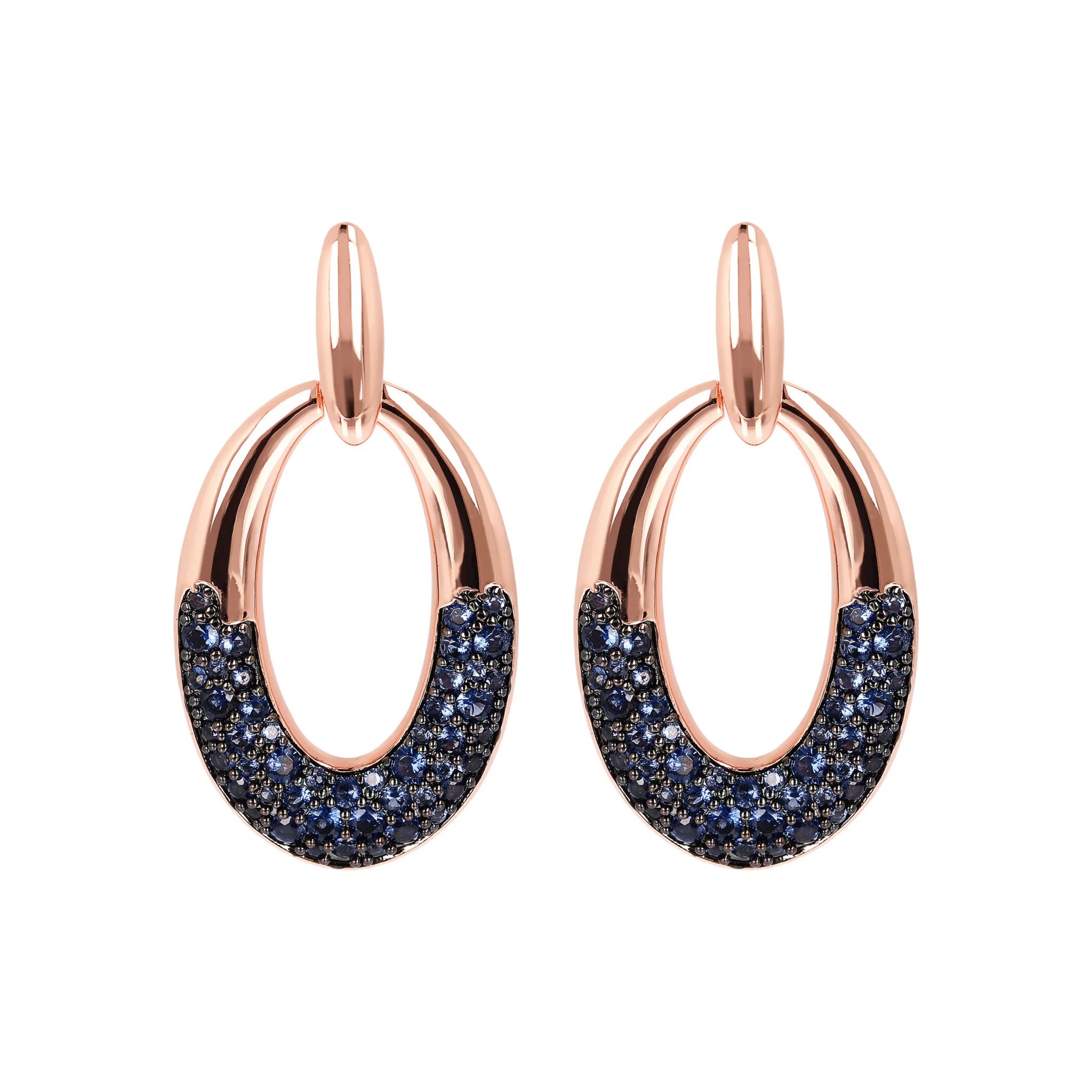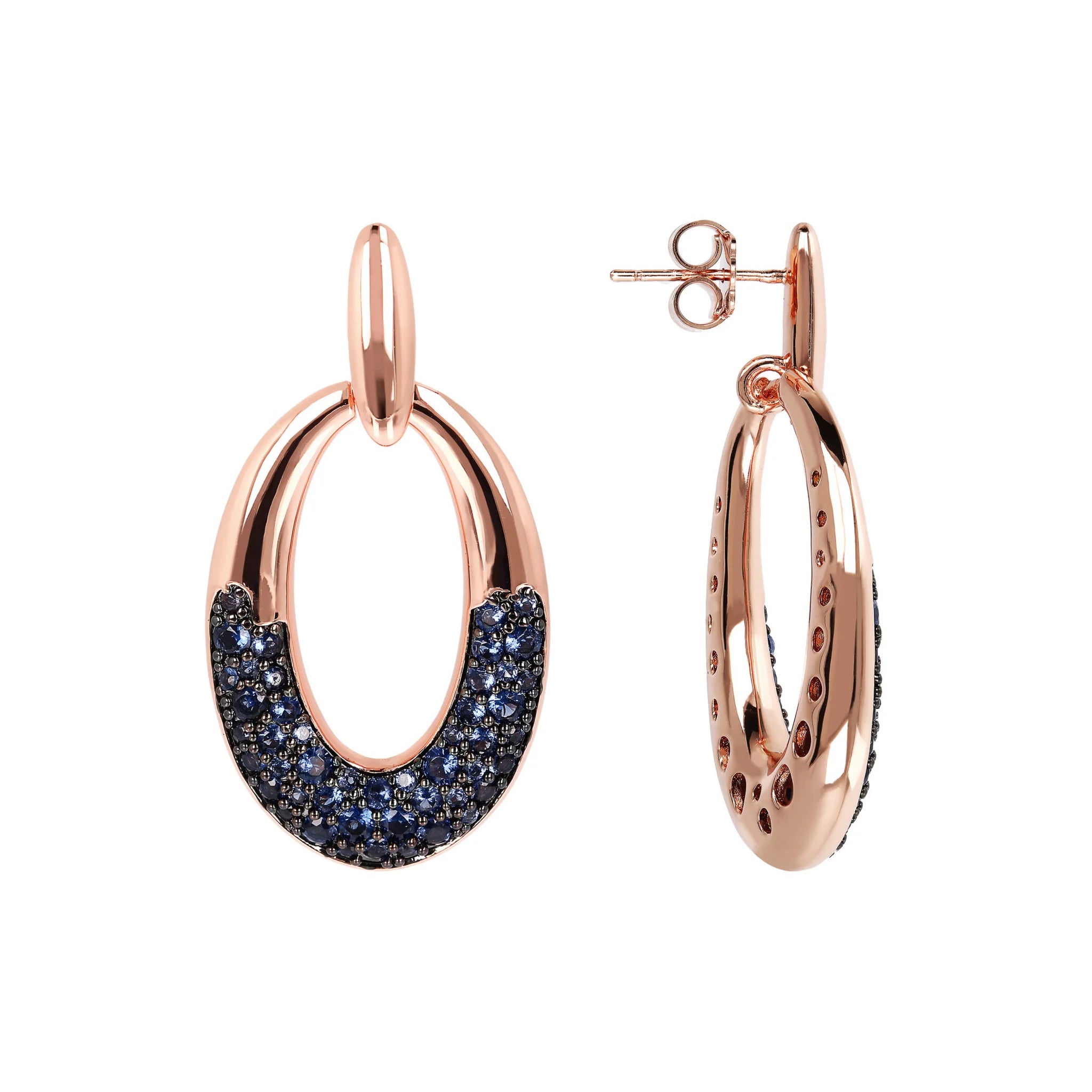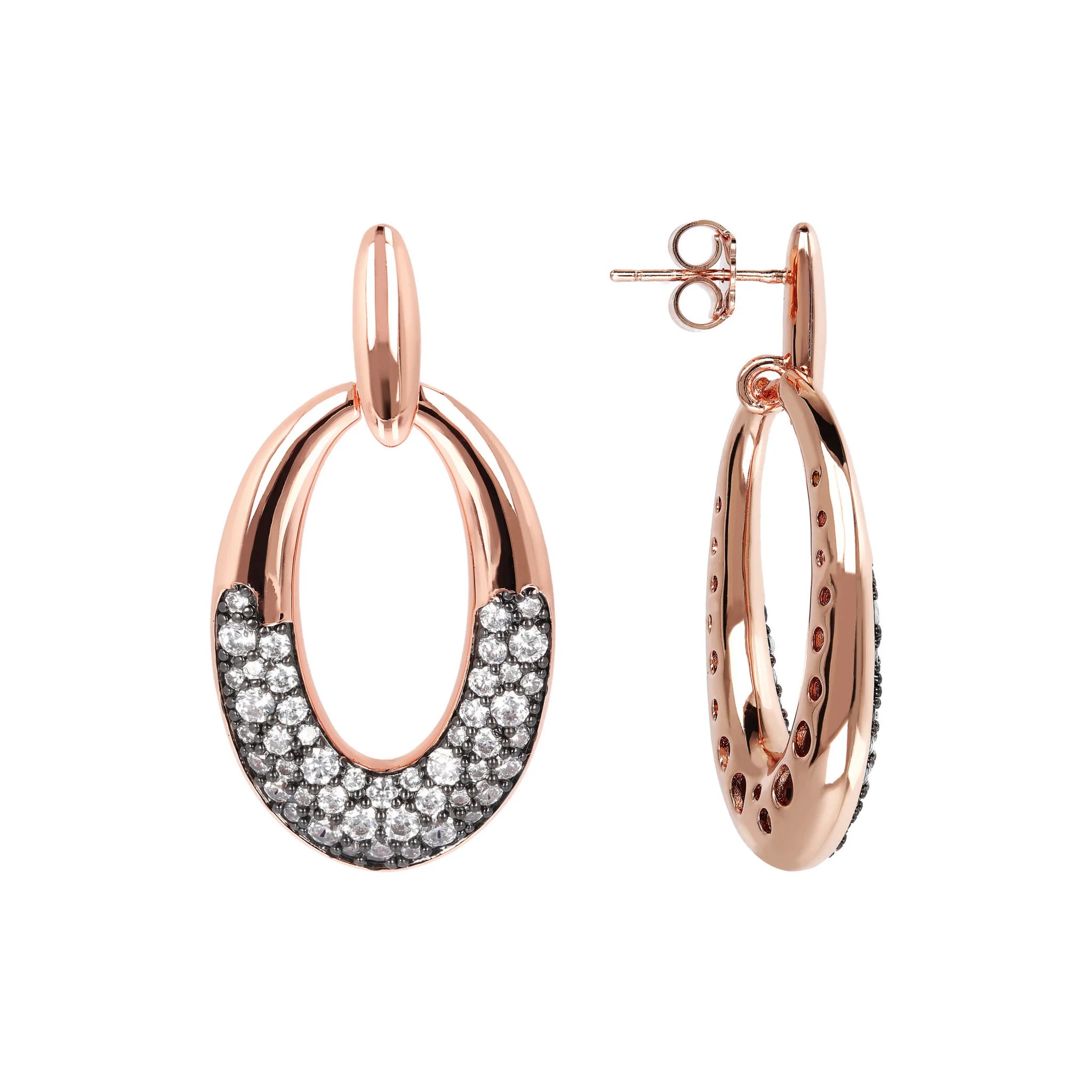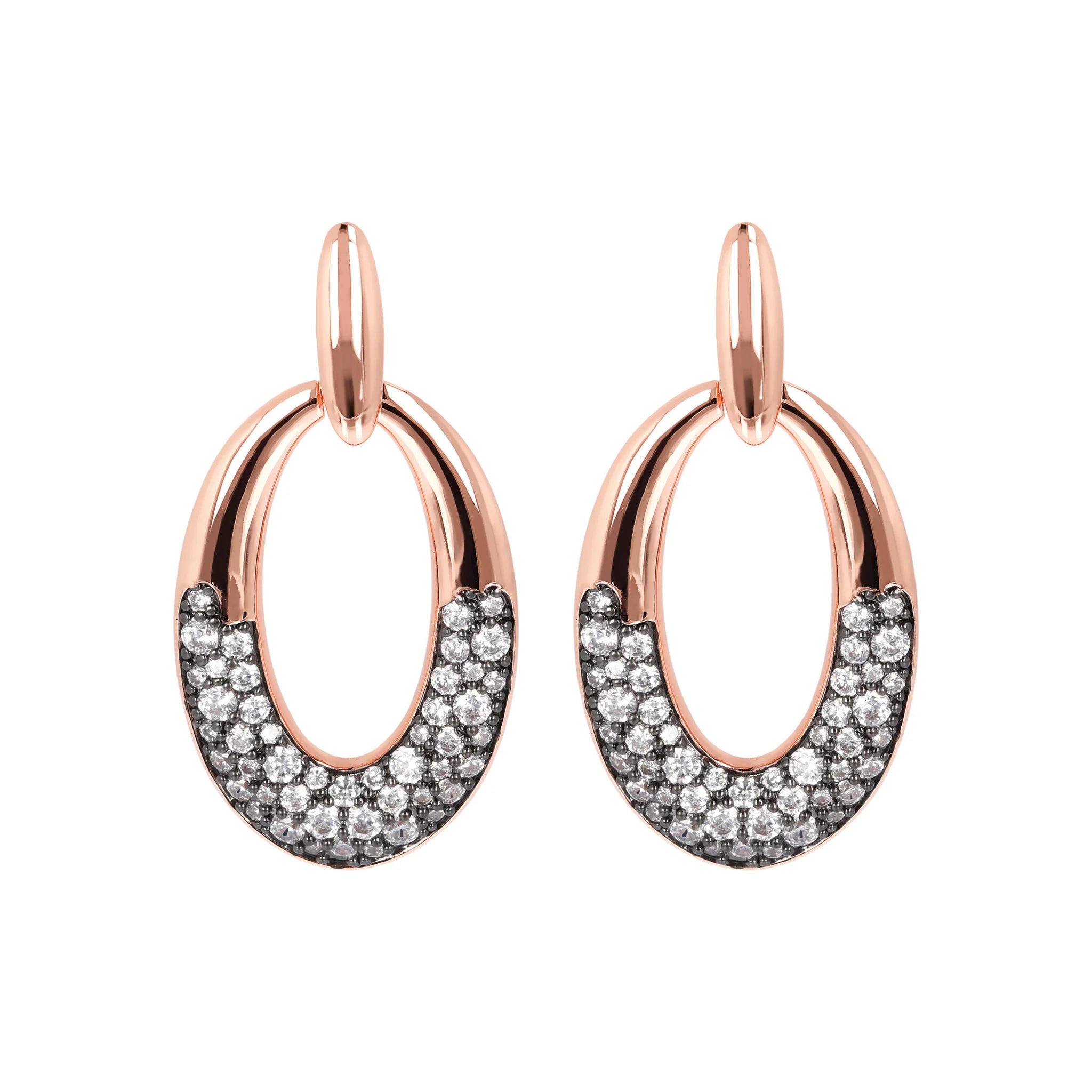 Bronzallure oval pendant earrings made of Golden Rosé alloy, 18kt rose gold plated, with oval element characterized by a detail in pavé of natural stones or cubic zirconia, mounted on an 18kt rose gold plated base; stud and butterfly closure.
