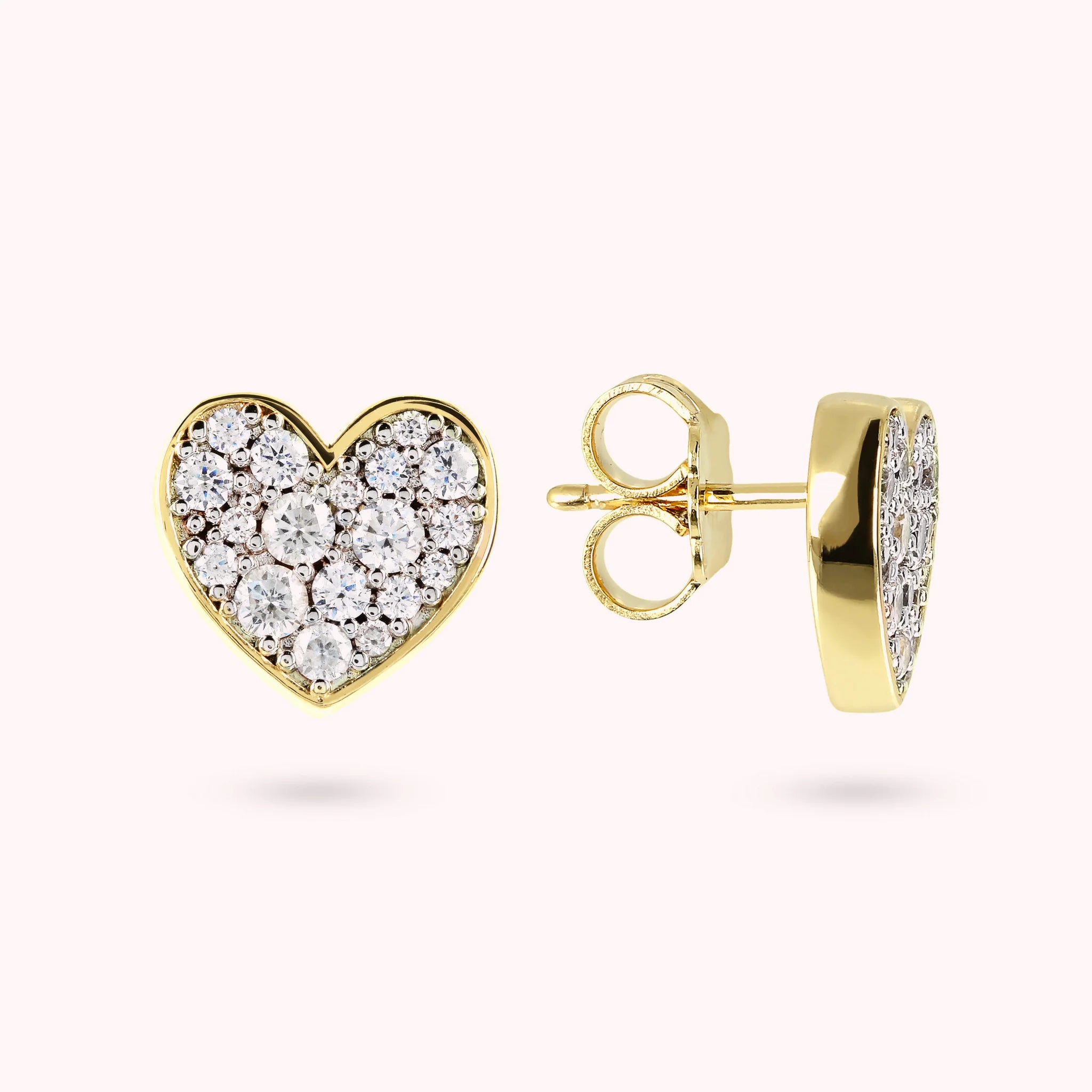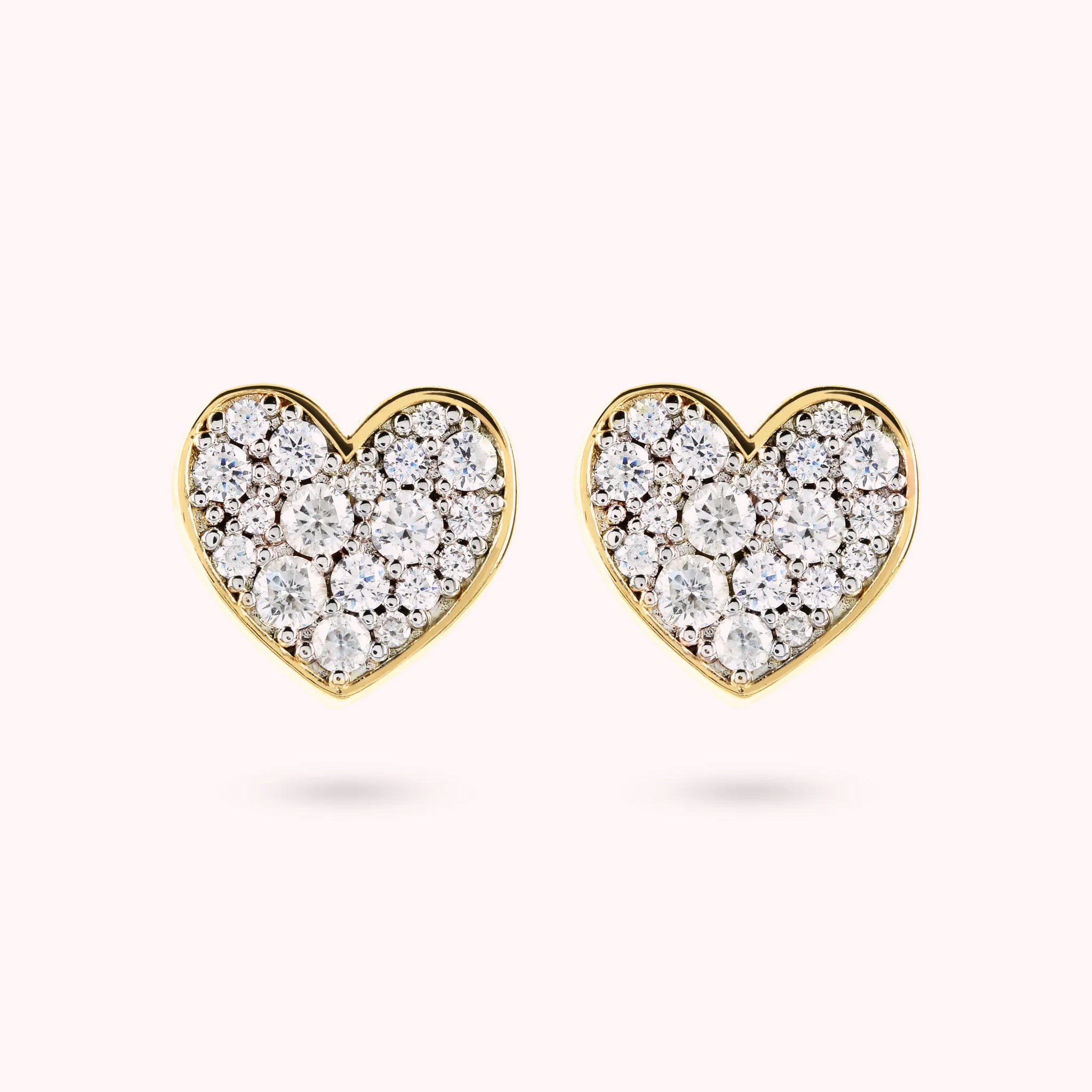 Golden Heart Stud Earrings with Pavé in Cubic Zirconia