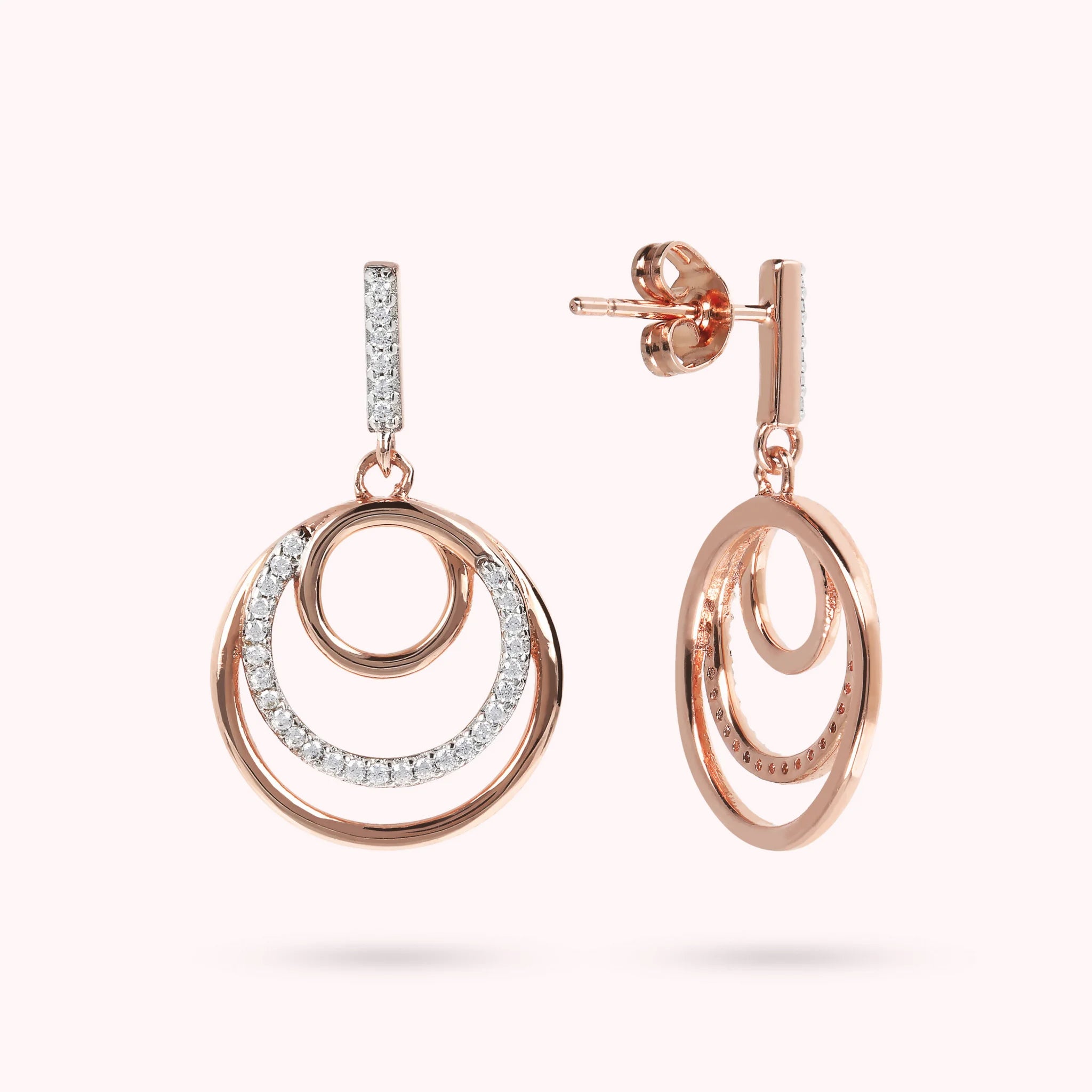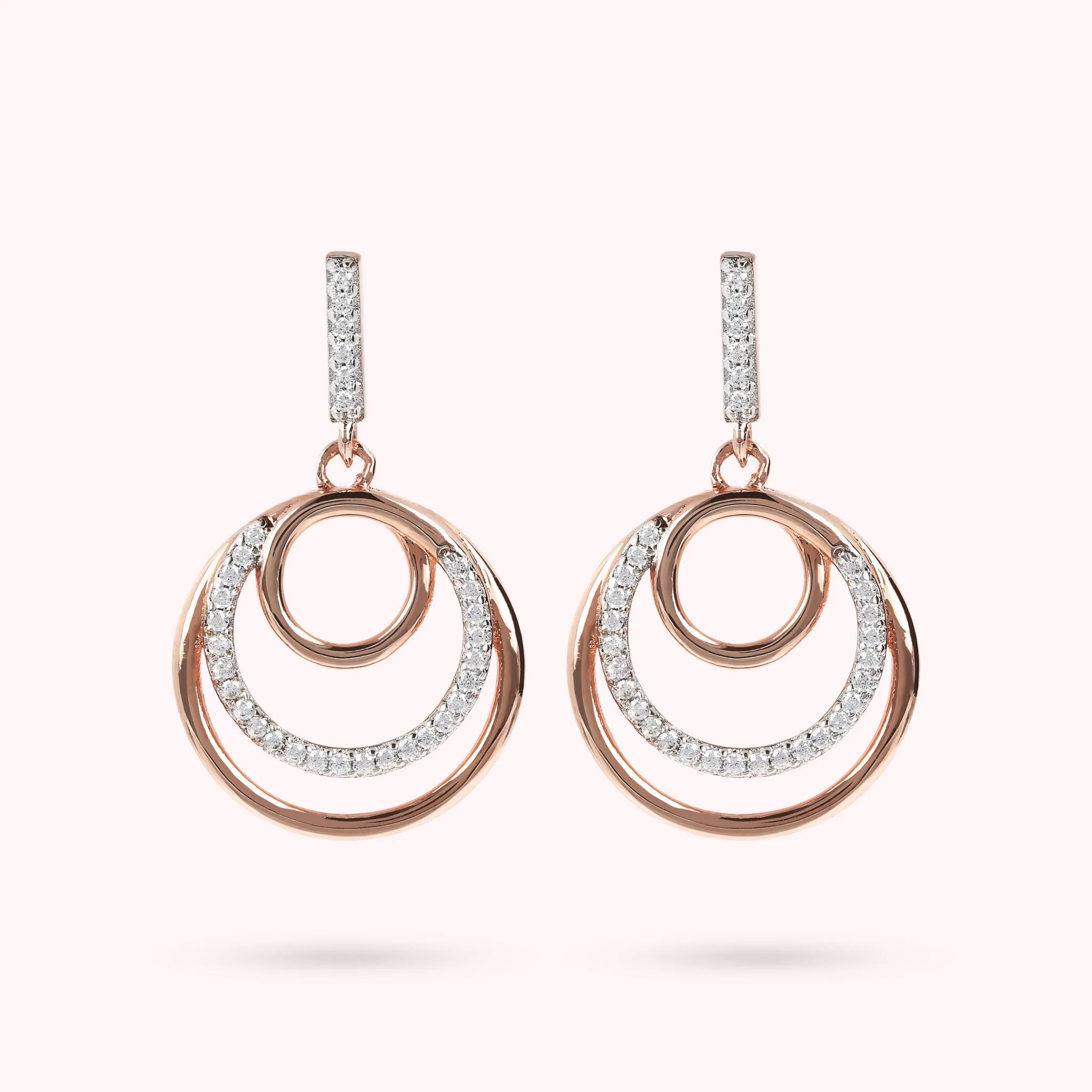 Bronzallure pendant earrings made of Golden Rosé alloy, 18kt rose gold plated, composed of a counter link in luminous cubic zirconia pavé and a triple graduated circle as a pendant, the intermediate circle also in luminous cubic zirconia; pin and butterfly closure; length of 2.5cm. Elegant and perfect creation to make your look shine.