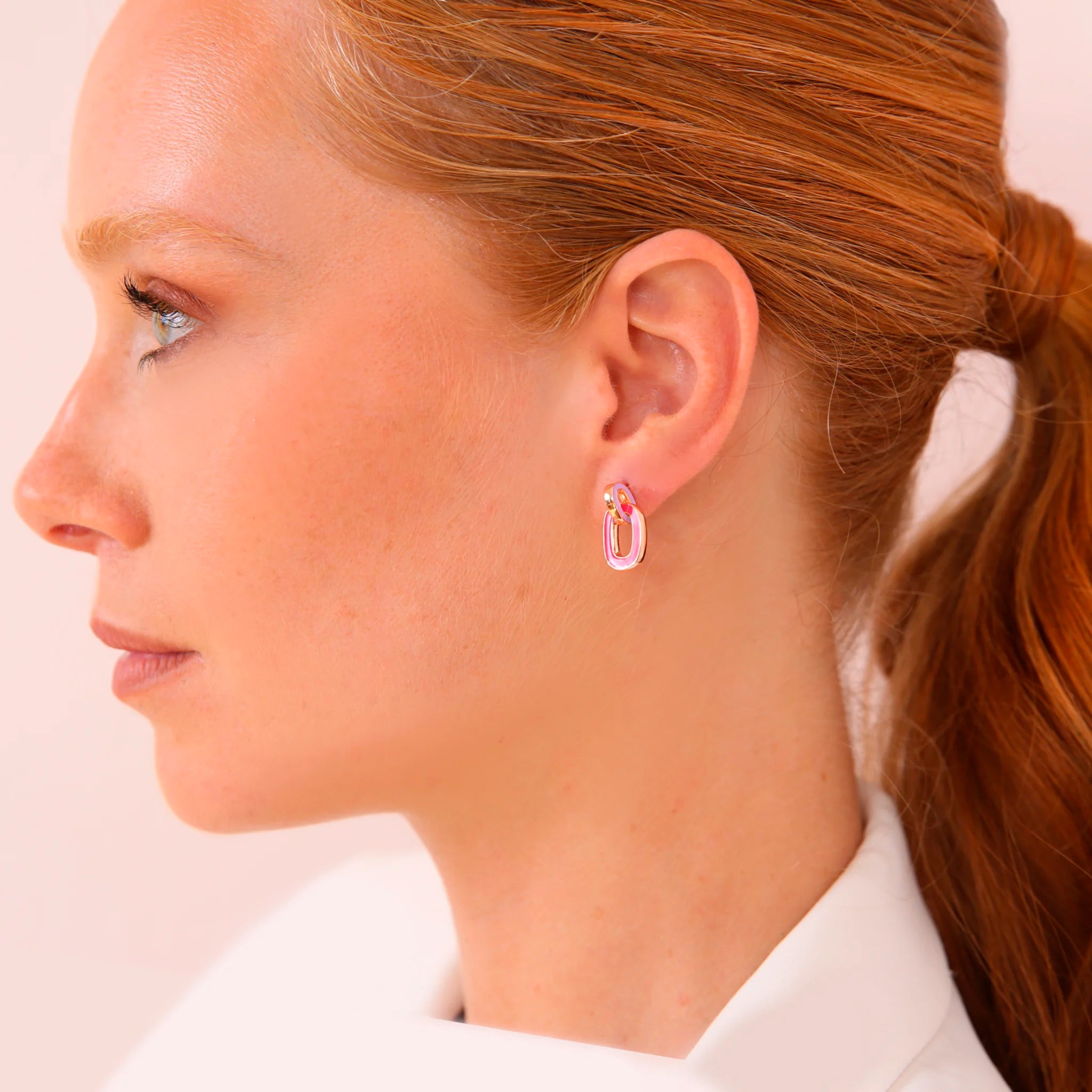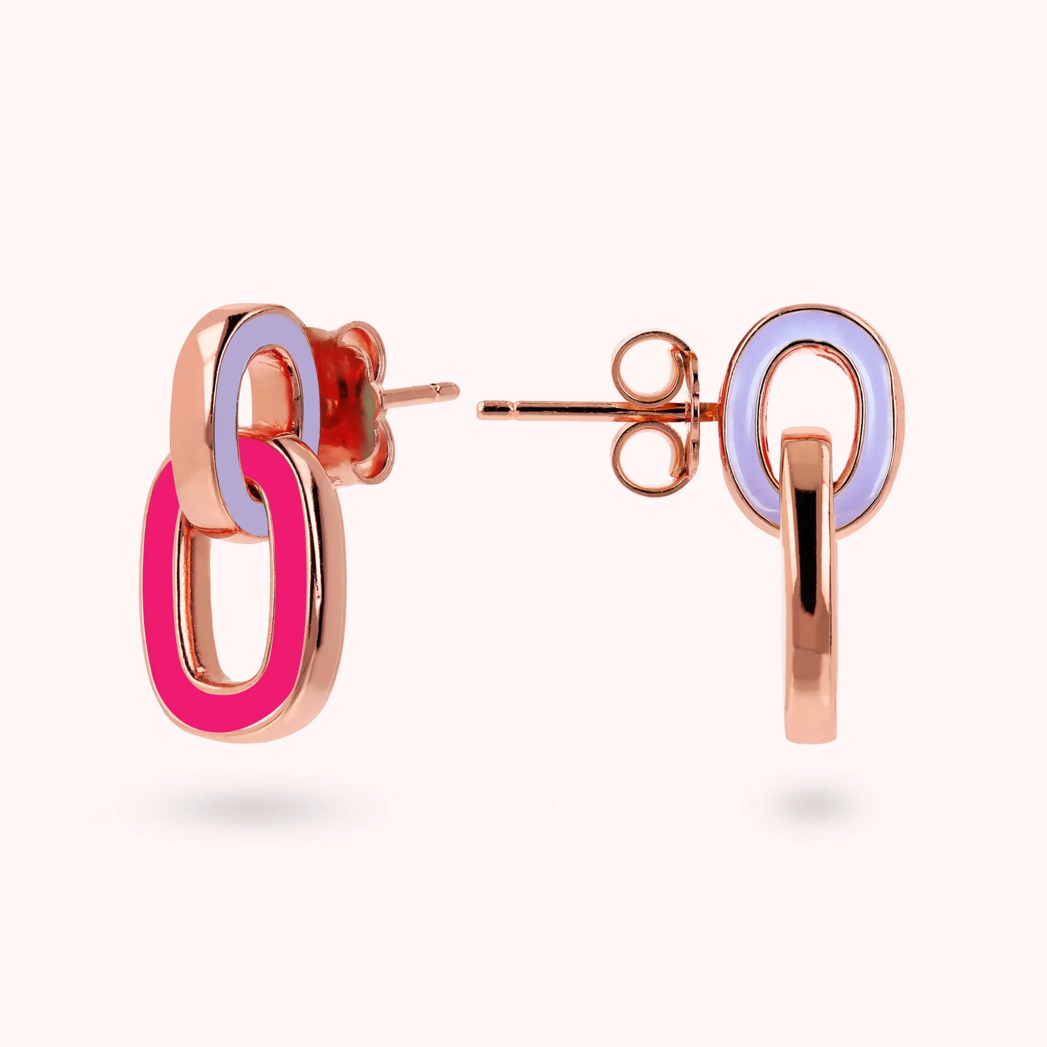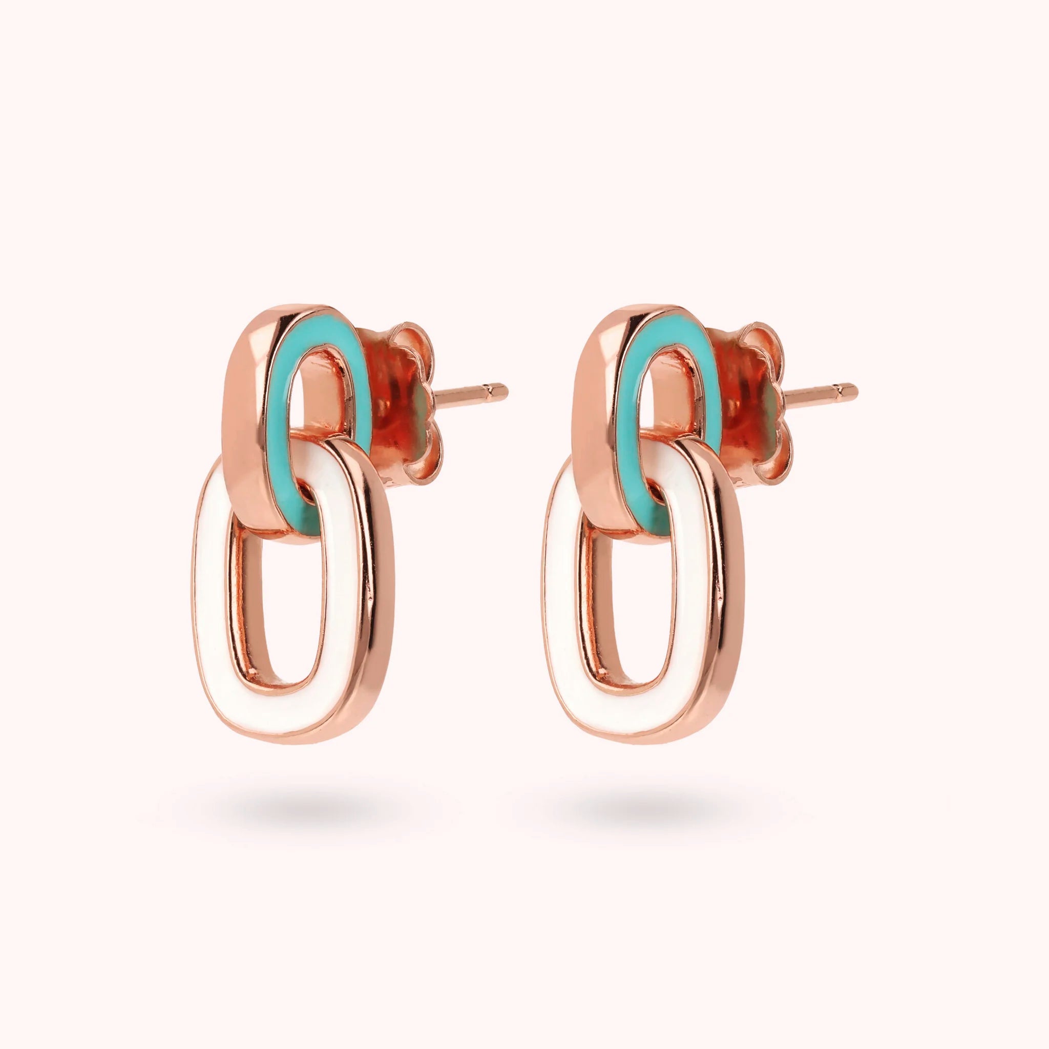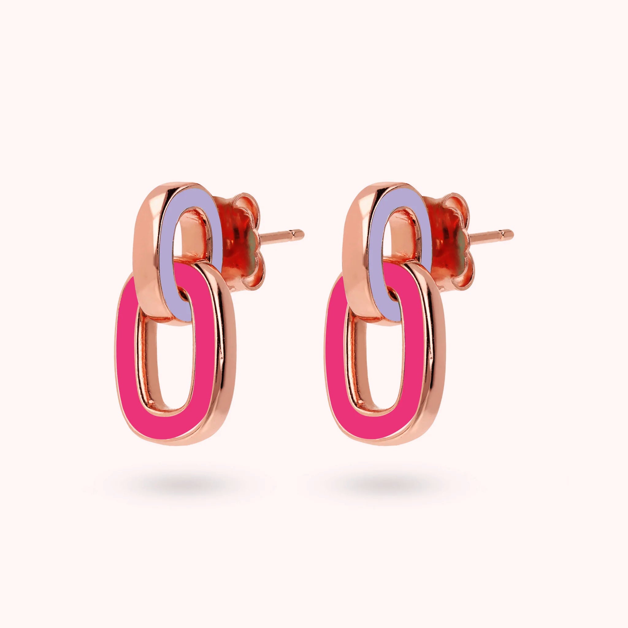 Bronzallure pendant earrings made of Golden Rosé alloy, 18kt rose gold plated, embellished with two concatenated two-tone links with an oval (11x9 mm) and rectangular (14.5x10.5 mm) shape with an enamelled surface; stud and butterfly closure.