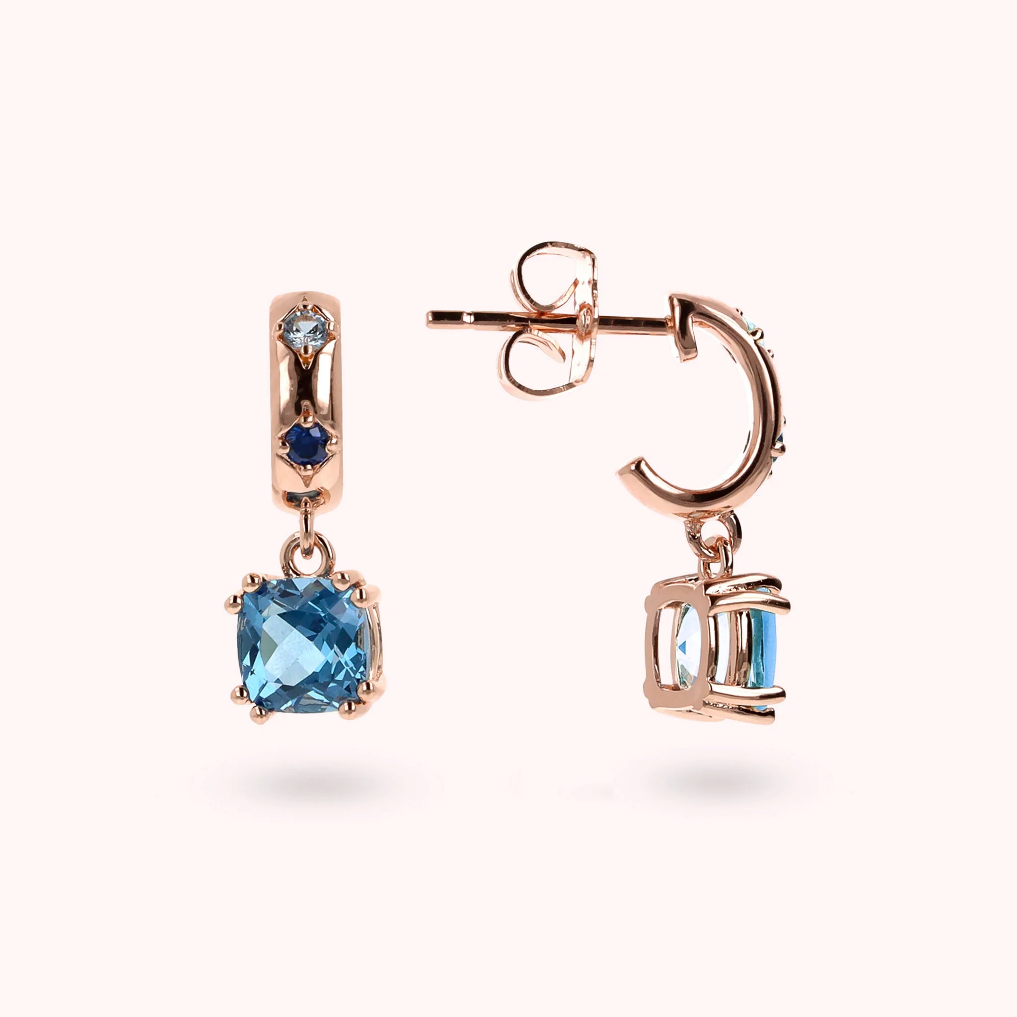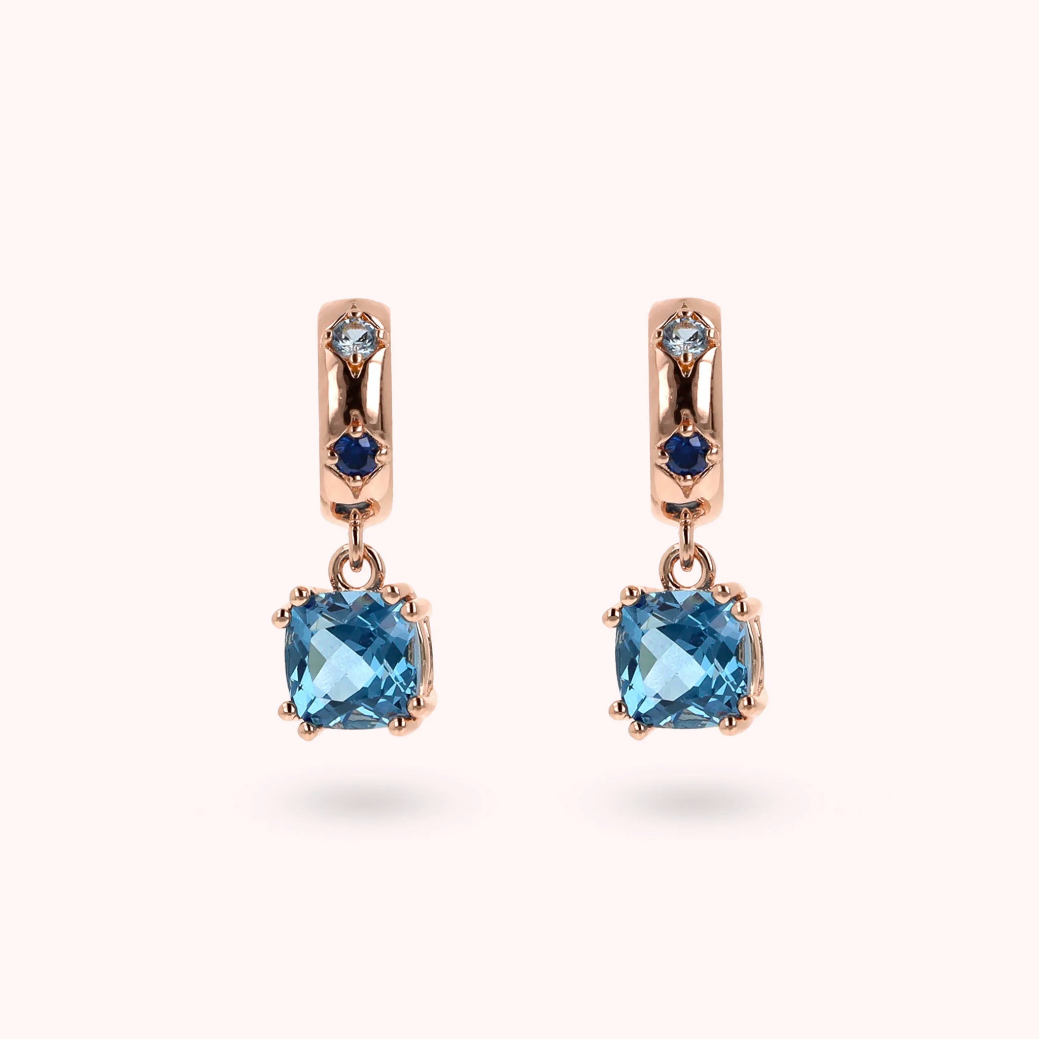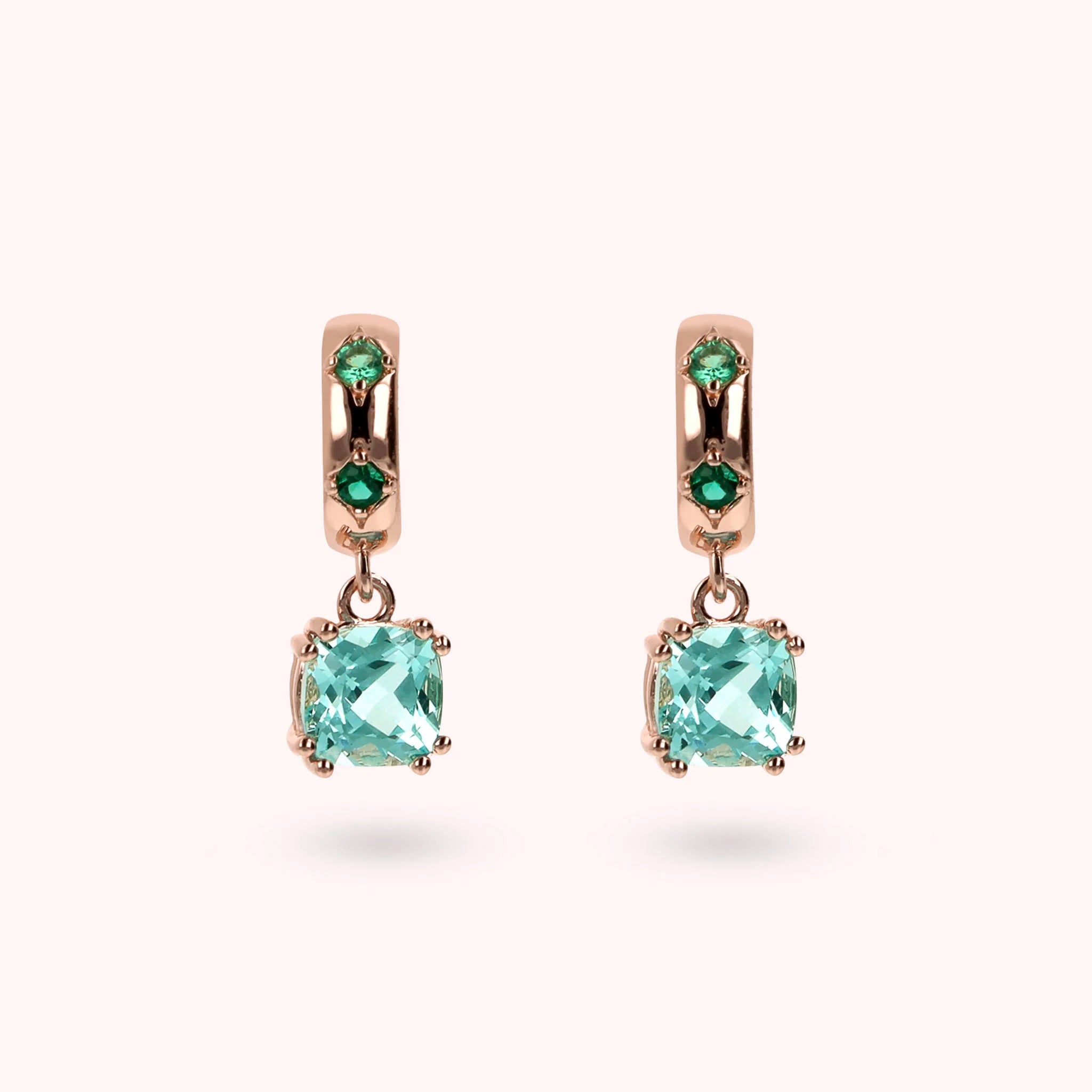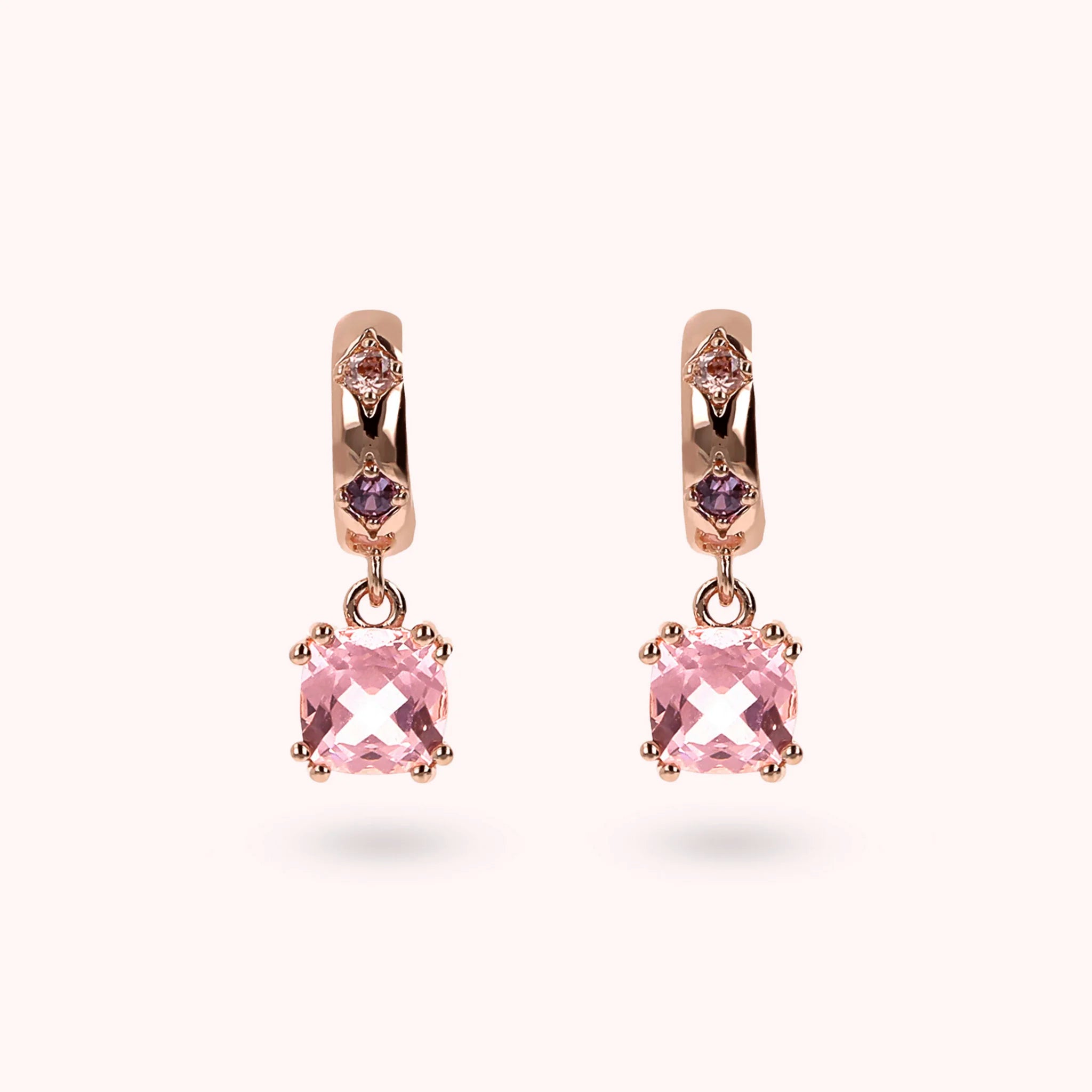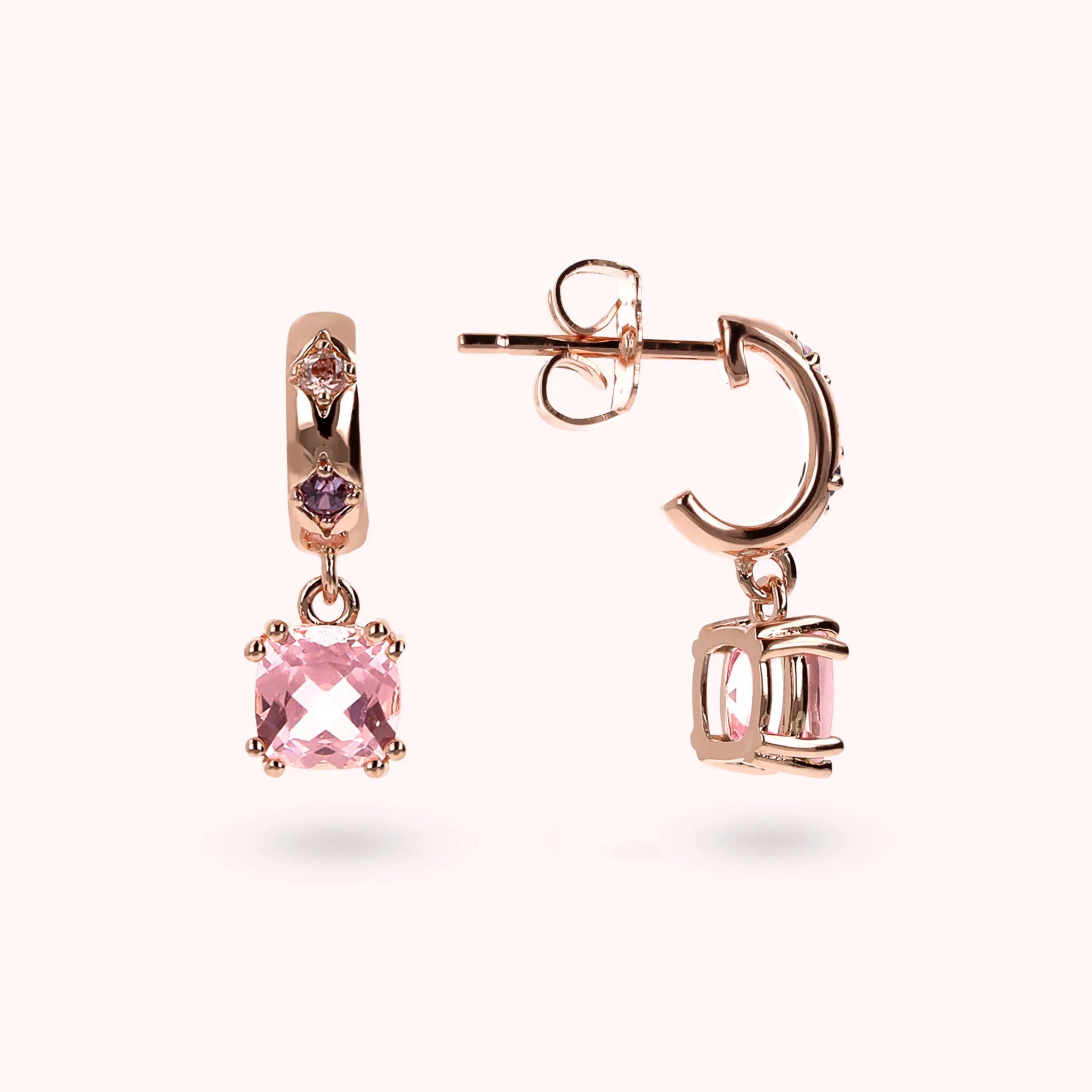 Pendant earrings made of Golden Rosé alloy, 18kt rose gold plated, embellished with étoile counter-link with cubic zirconia light points and two pendants with cushion-cut gem prism (6x6 mm). Length 1.8 cm. Pin and butterfly closure.