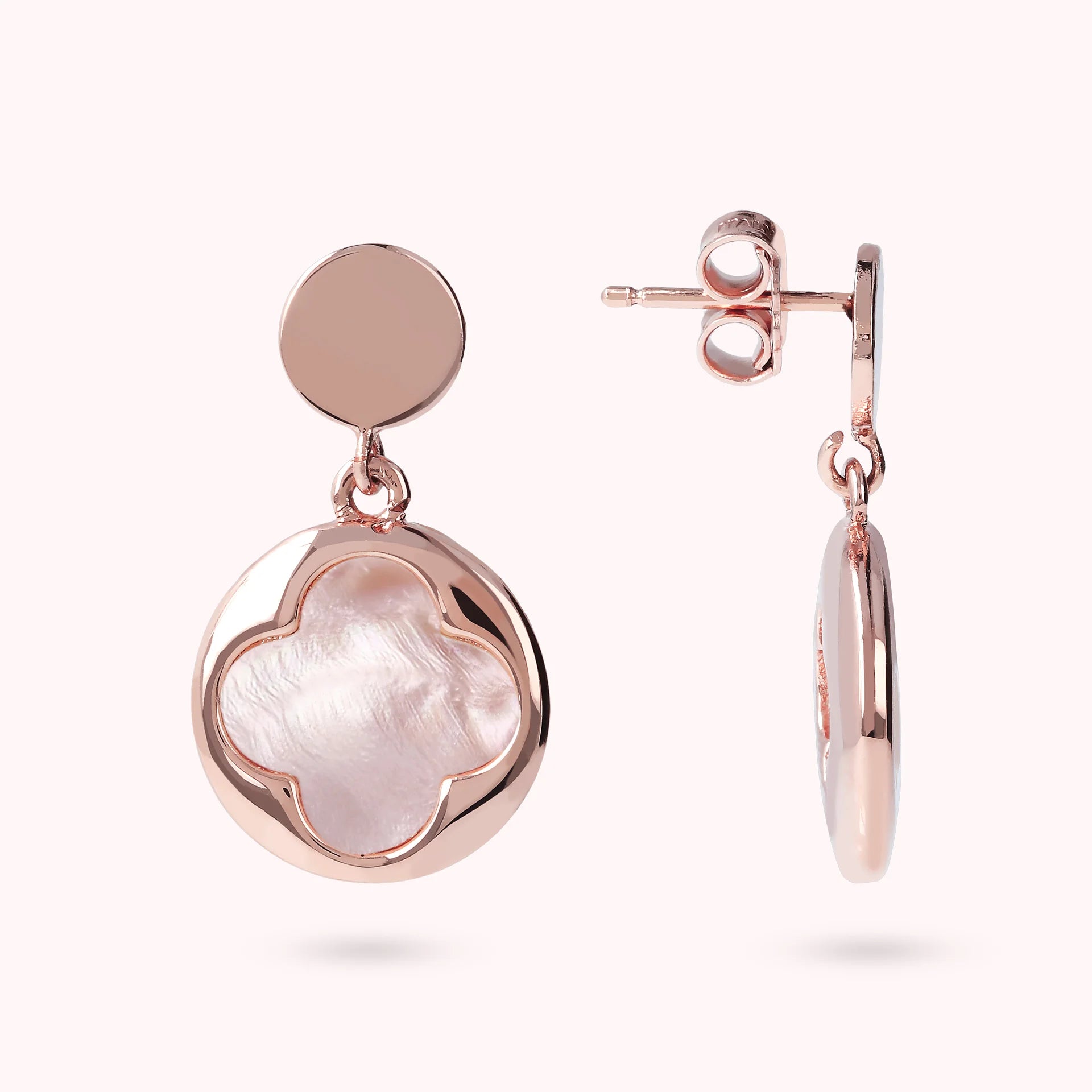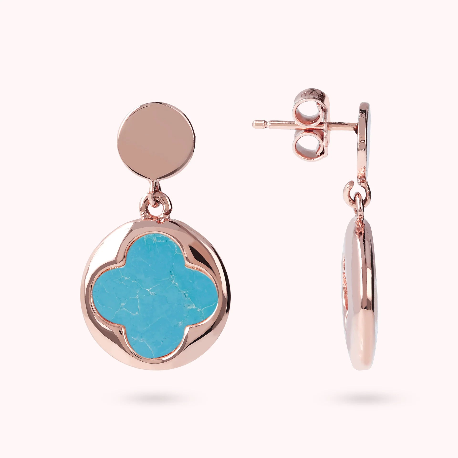 Bronzallure pendant earrings made of Golden Rosé alloy, 18kt rose gold plated with round pendant (1.5 cm) characterized by a four-leaf clover in natural stone, mounted on an 18kt rose gold plated base; stud and butterfly closure.