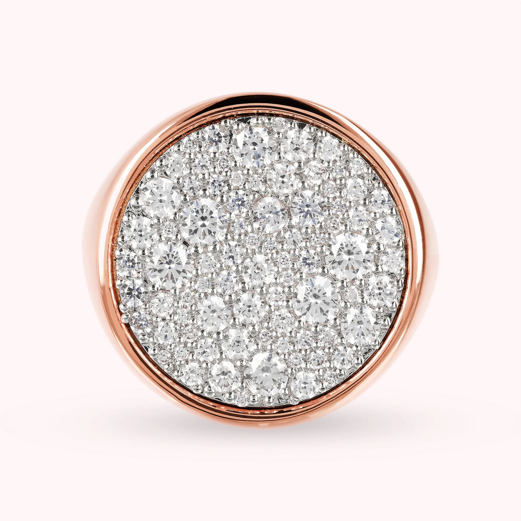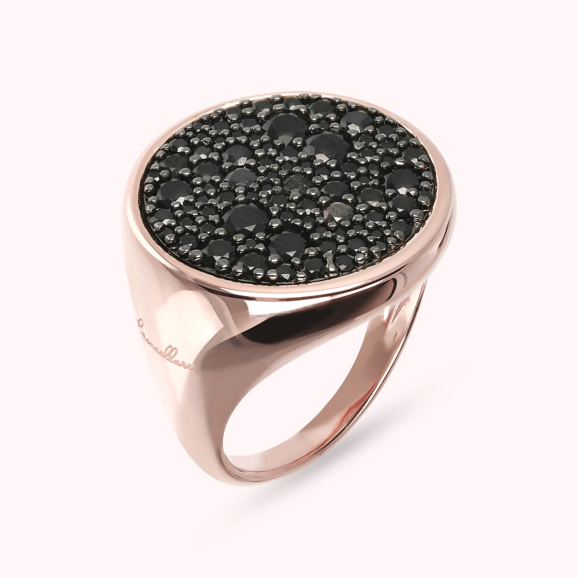 Bronzallure chevalier ring made of Golden Rosé alloy, 18kt rose gold plated, with round element in the upper part (1.8 cm) in white cubic zirconia pavé, luminous quality, or black spinels. Elegant creation, with a perfect design to make your look shine.