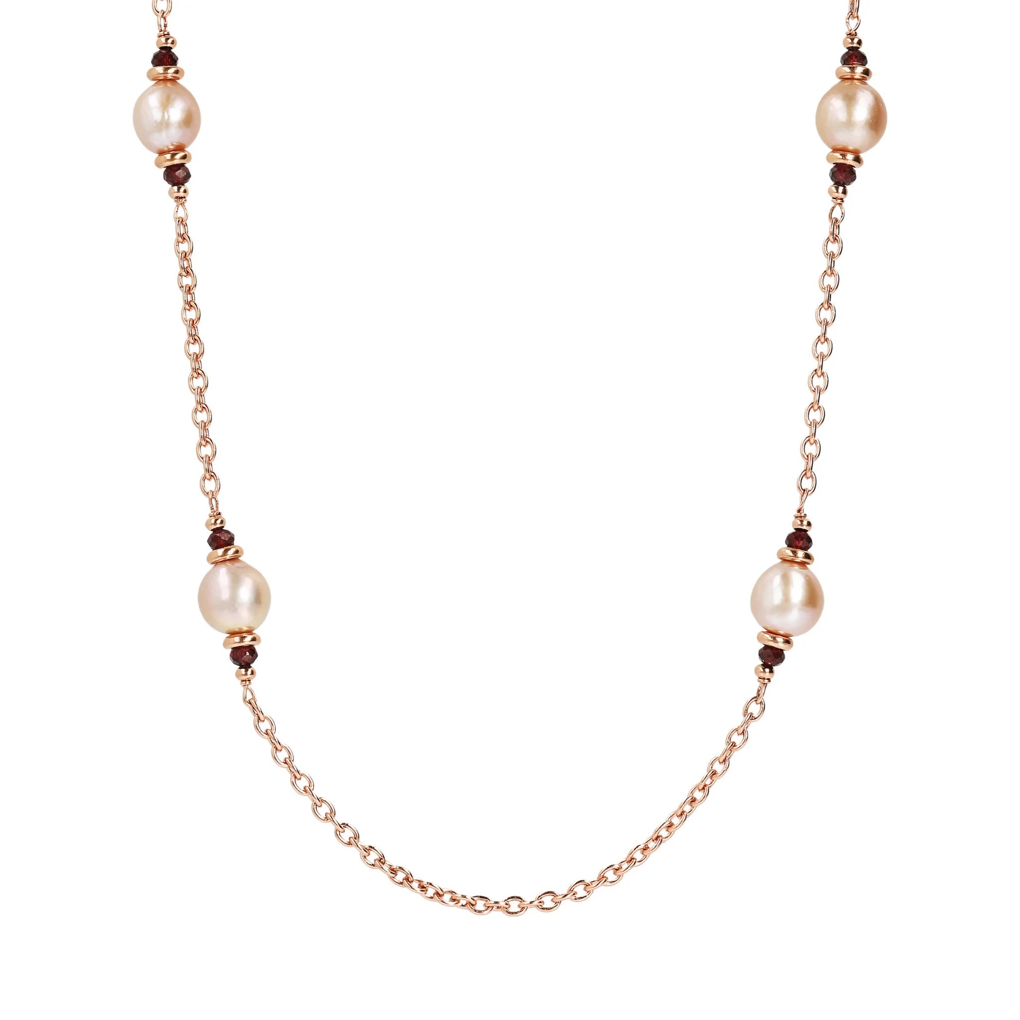 Bronzallure long necklace made of Golden Rosé alloy, 18kt rose gold plated, with rolo chain embellished with pink freshwater cultured pearls (11 mm) and small red garnet spheres, snap hook closure.