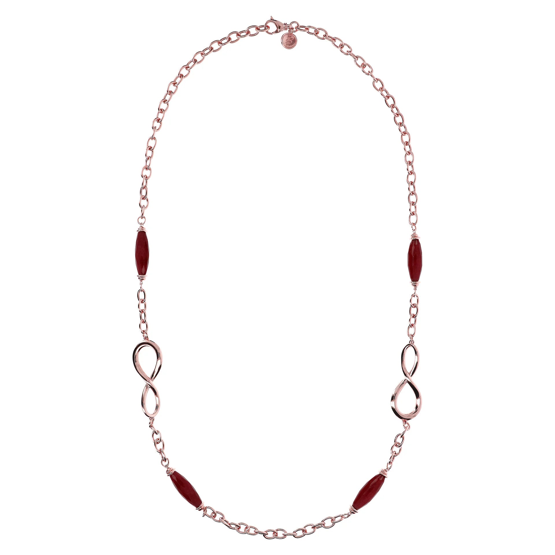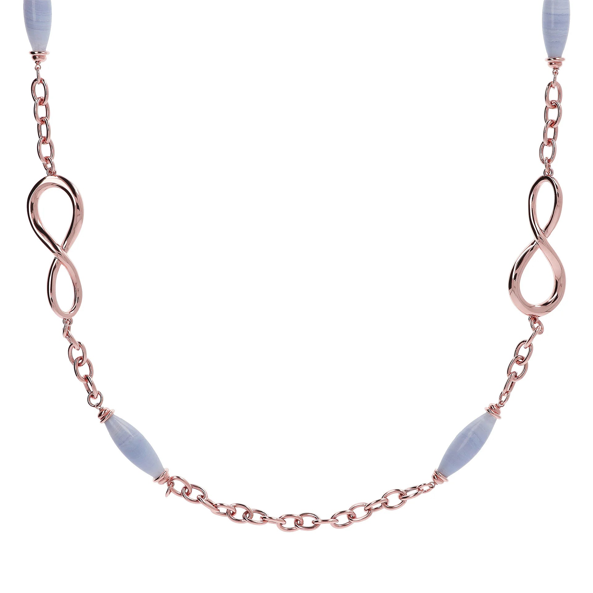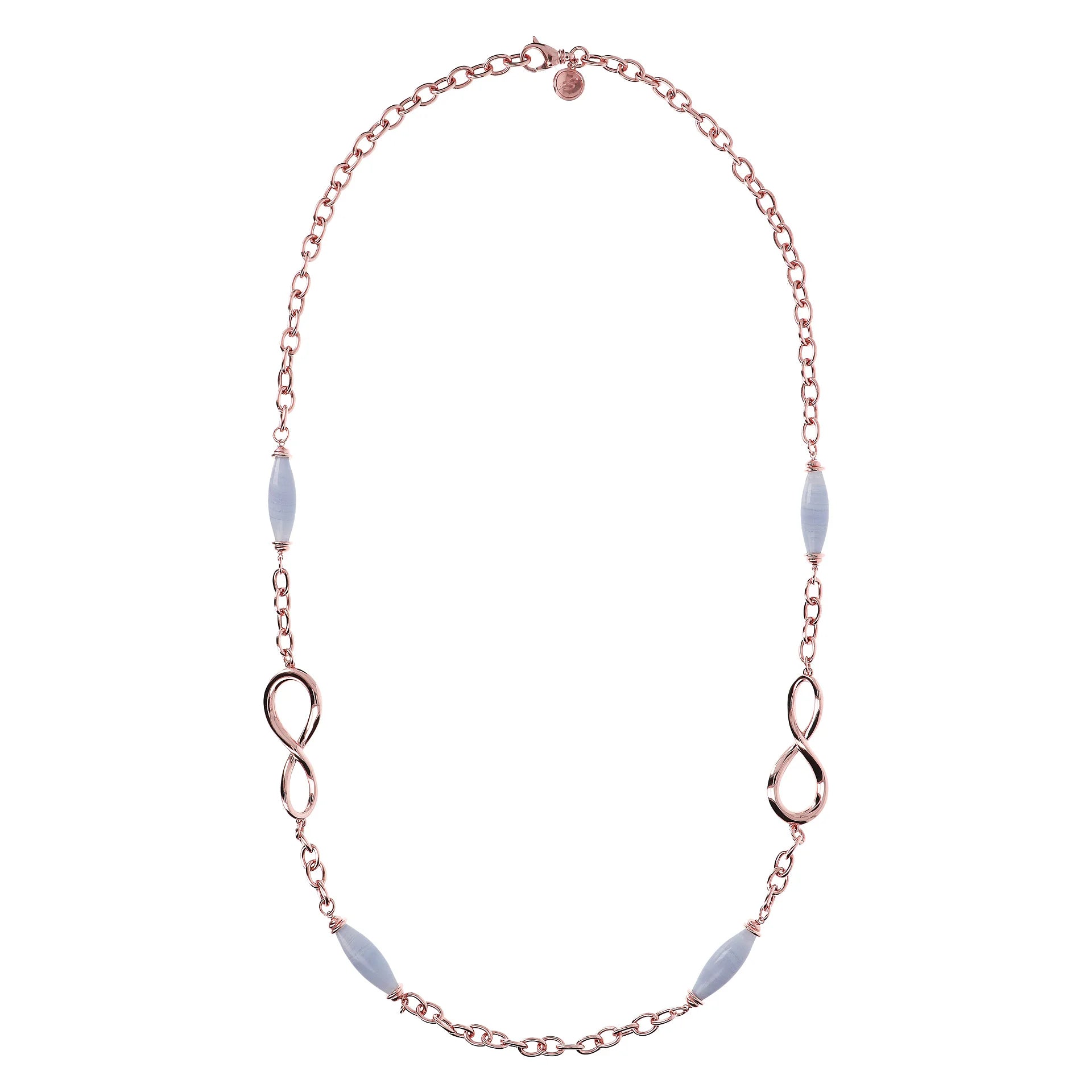A long necklace with oval stones and elongated cut elements, designed to enhance your looks. The perfect accessory that combines classic jewelry with an elongated oval rolo chain and eight stations featuring natural stones: quartzite, blue lace agate in romantic tones, thoughtfully designed to match from morning to evening. Wear them alone, paired, or with many rigid and soft bracelets, rolo chain, and our solitaire and cocktail rings with certified natural stones. Manufacturer and EU Responsible Person: