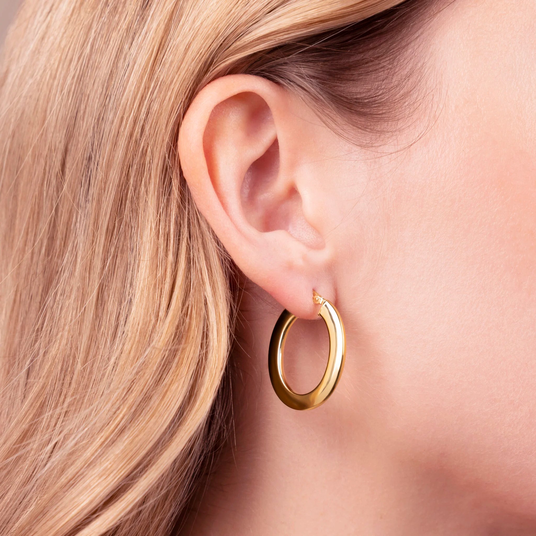 Bronzallure hoop earrings made of Golden Rosé alloy, plated with 18kt gold, featuring a glossy finish and a slim, squared design. Bayonet closure. Outer diameter 3cm.