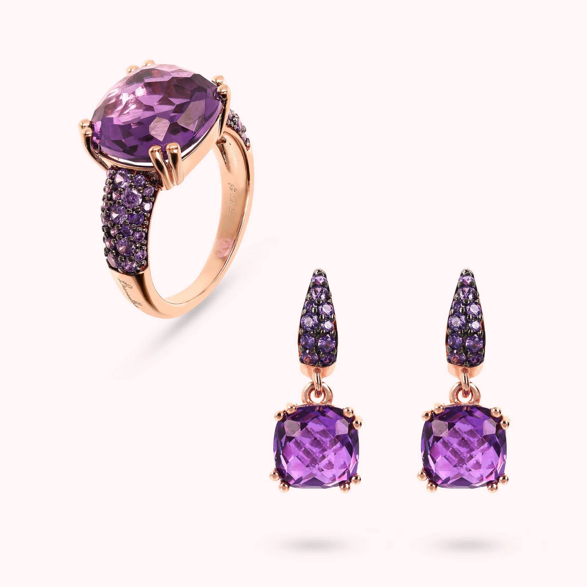 Bronzallure ring + earrings set made of Golden Rosé alloy, plated with 18kt rose gold. Cocktail ring with a central purple prism gem stone (12x12 mm) and pavé cubic zirconia. Dangle earrings with pavé cubic zirconia counter-link and two purple prism gem stones (8x8 mm); hook closure.