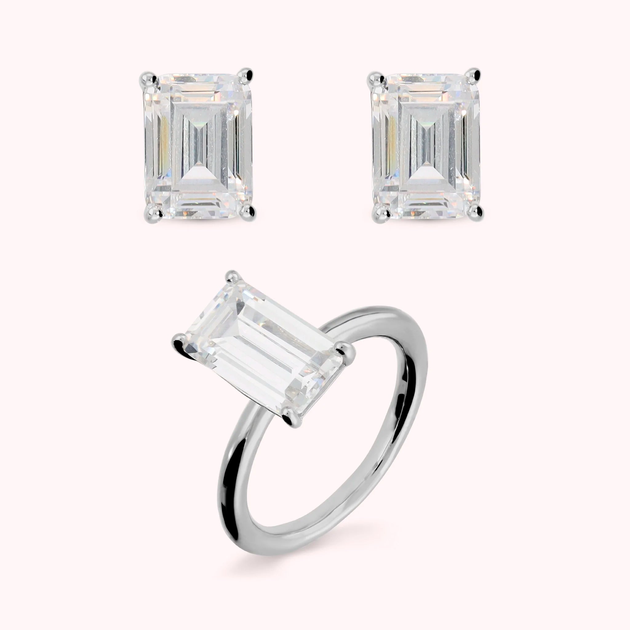 Linee pulite e luminosità discreta: orecchini a bottone e anello solitario con cubic zirconia a taglio baguette regalano uno stile raffinato e contemporaneo, ideale per ogni occasione.