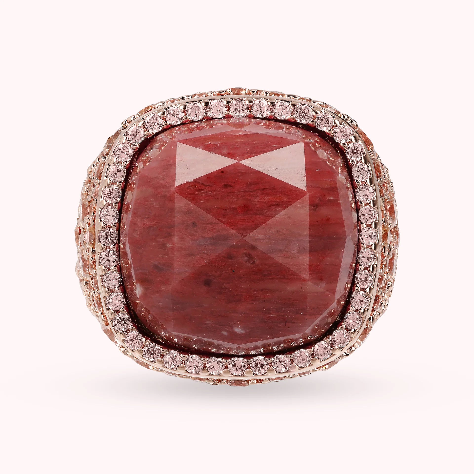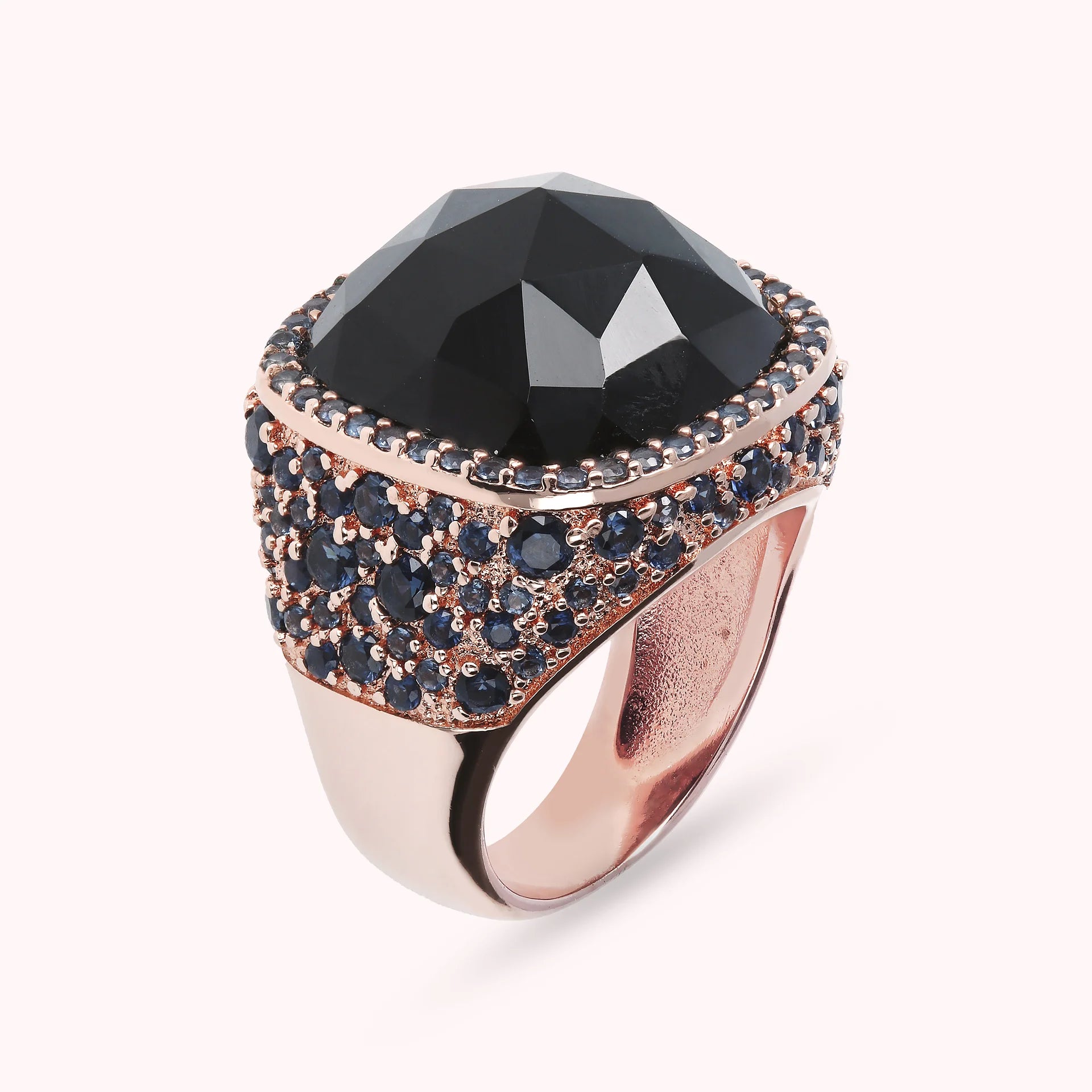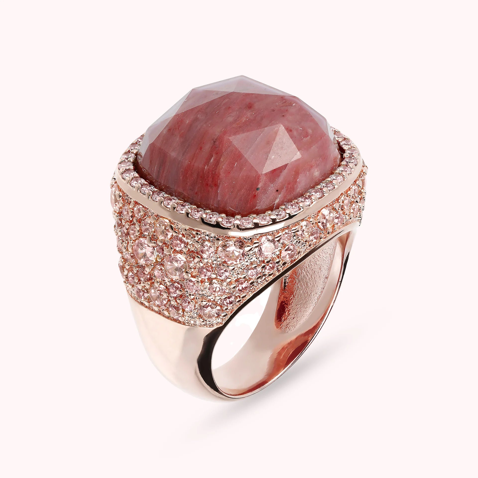 Bronzallure chevalier ring made of Golden Rosé alloy, 18kt rose gold plated, embellished with a central faceted natural stone (16x16 mm) slightly square and surrounded by small luminous cubic zirconia. The underlying part of the stone is covered with pavé of small round natural stones.