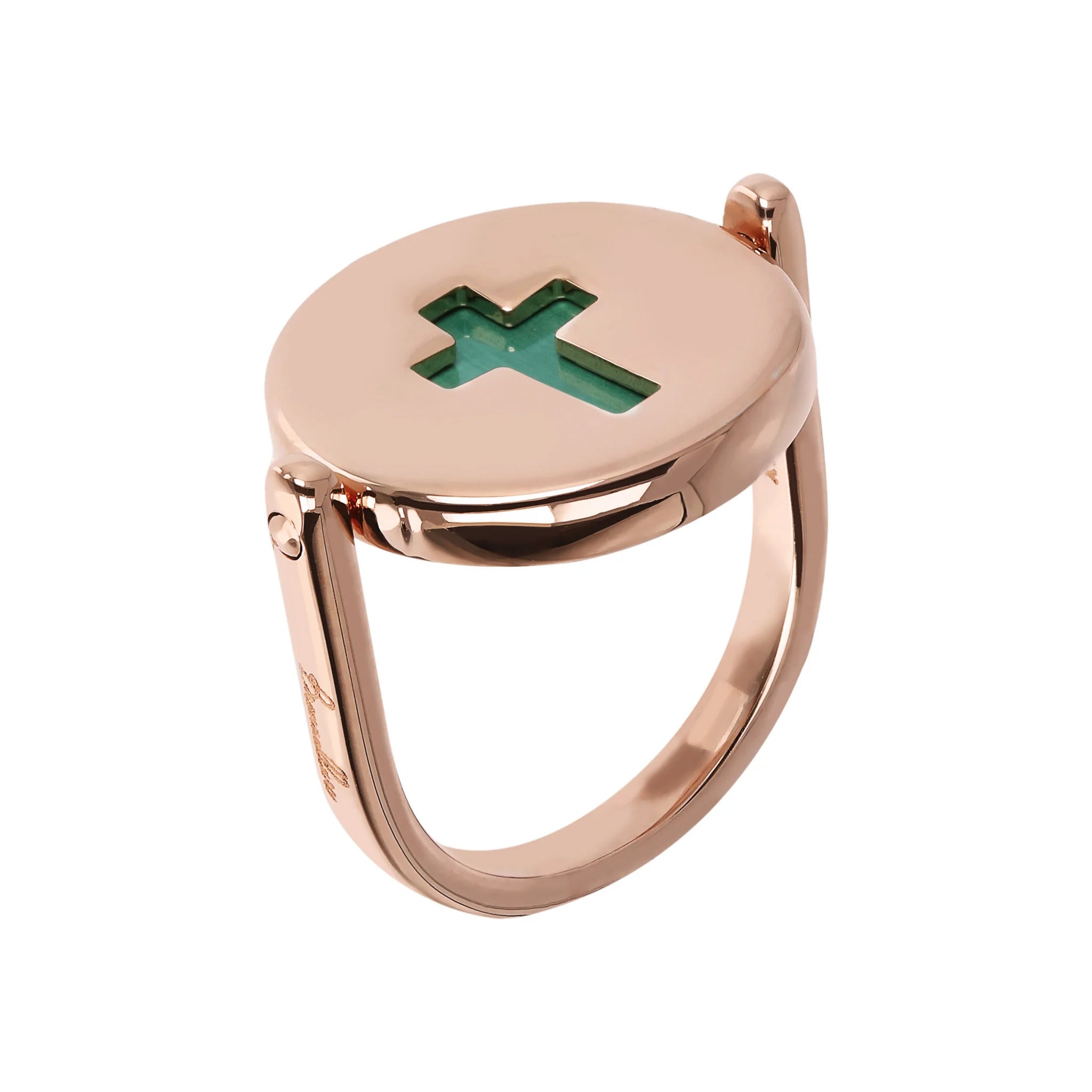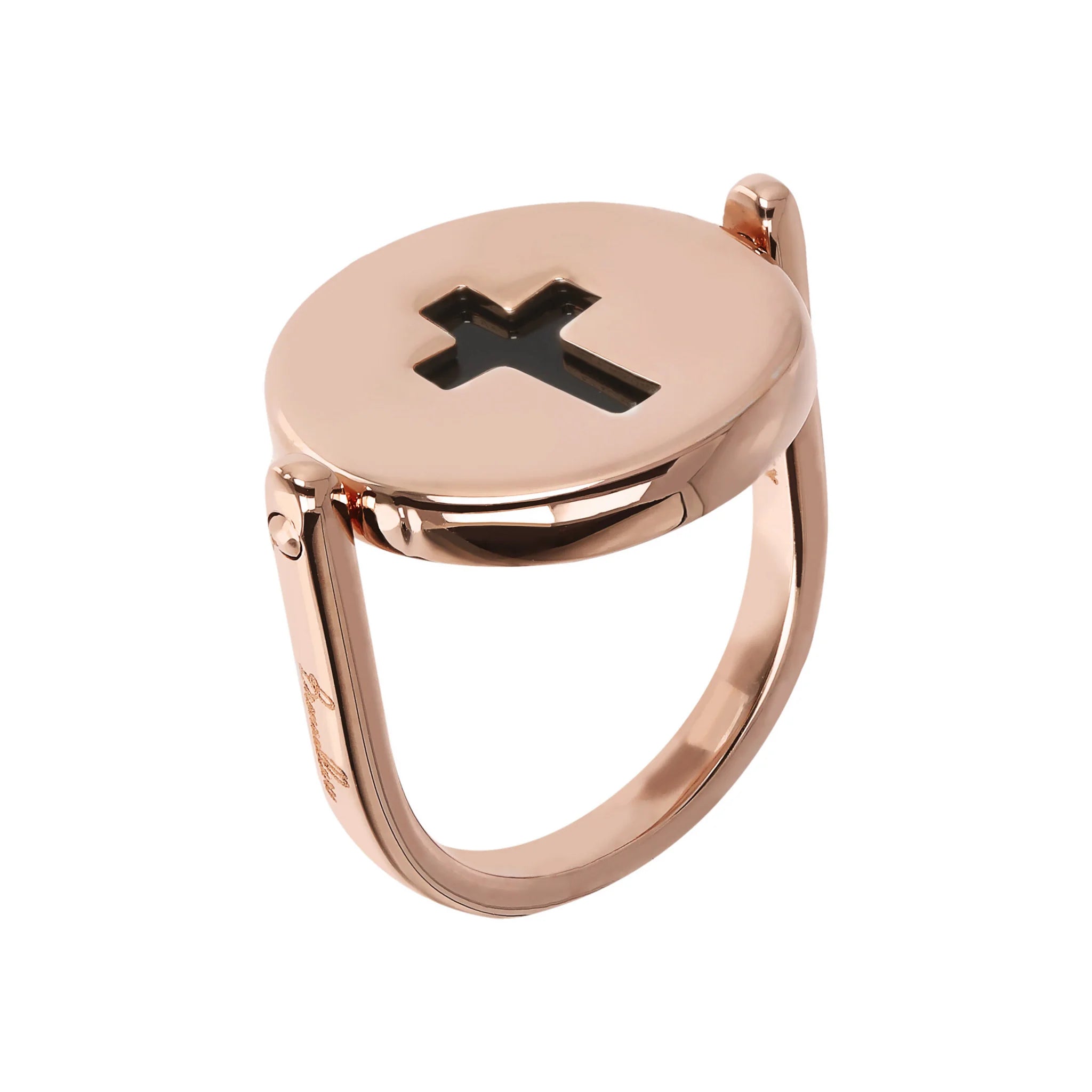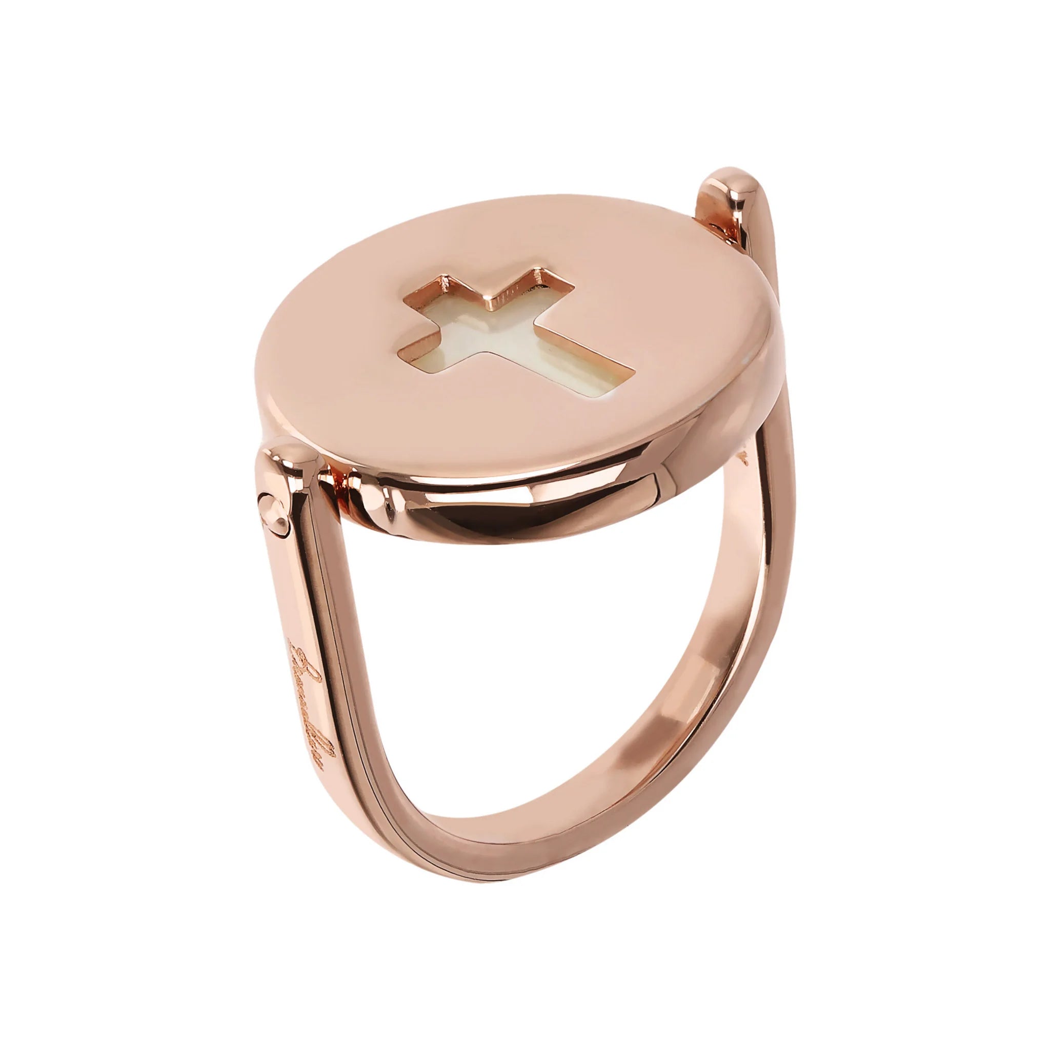 Bronzallure rotating cocktail ring made of Golden Rosé alloy, 18kt rose gold plated, embellished on one side with a round natural stone and on the other with a pierced cross-shaped element.