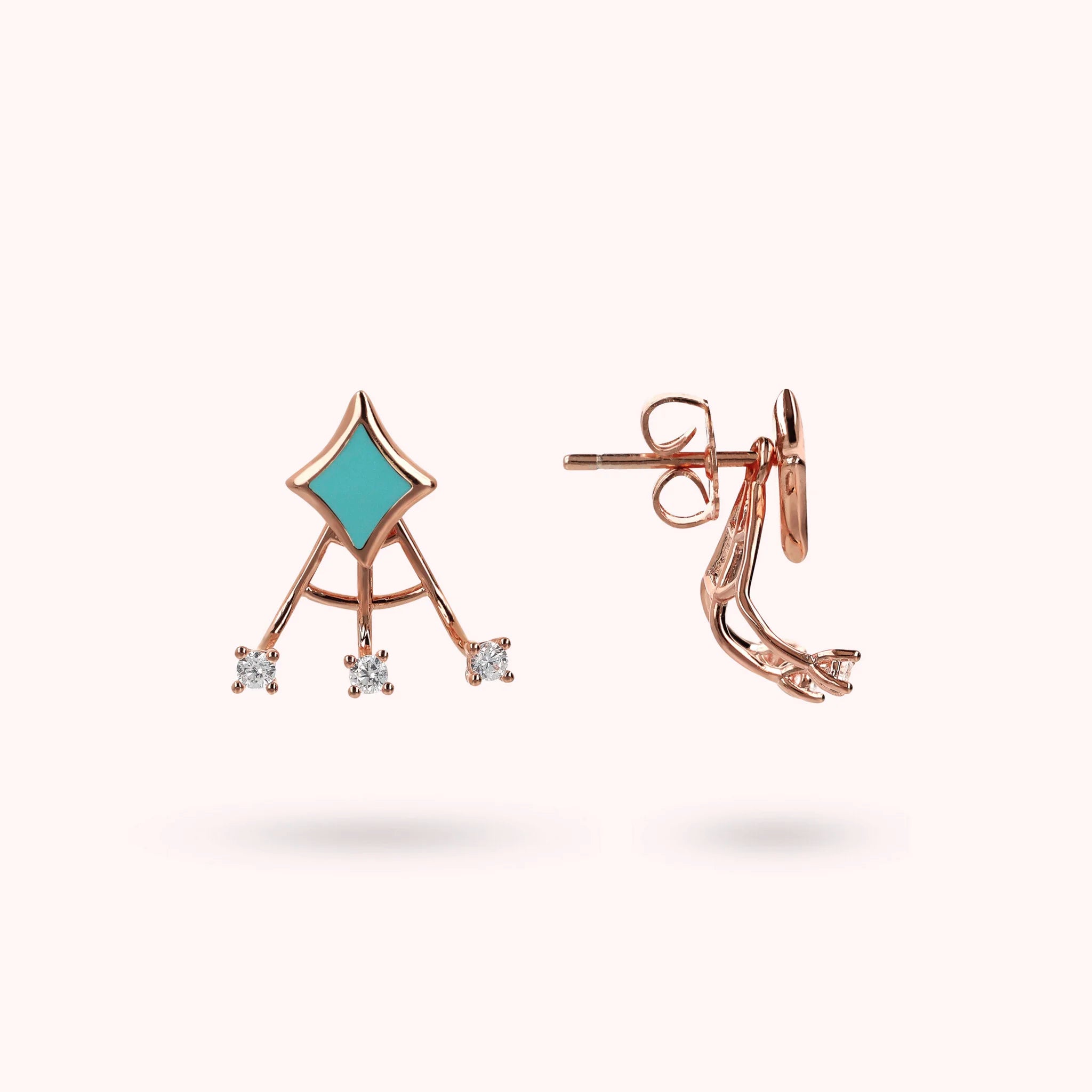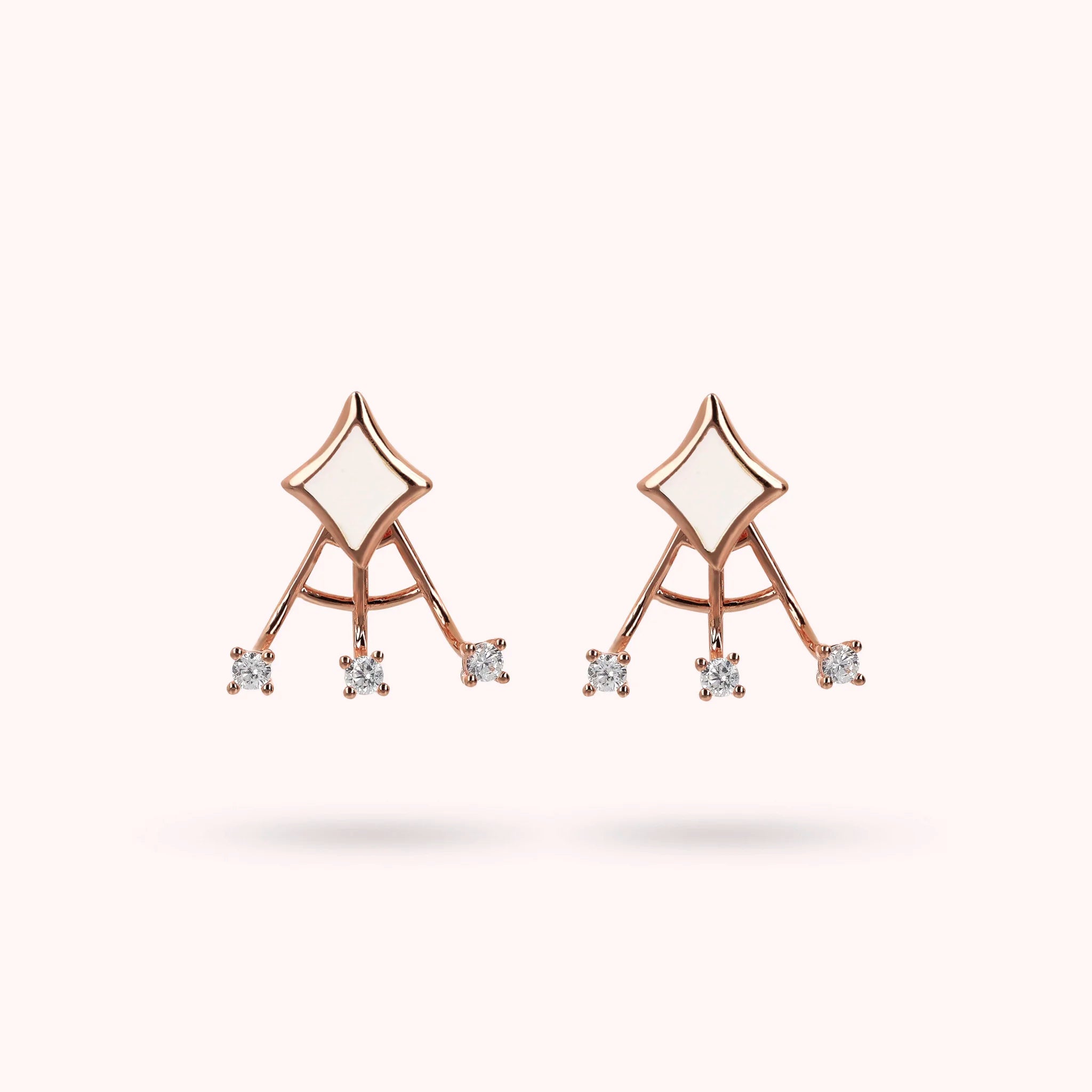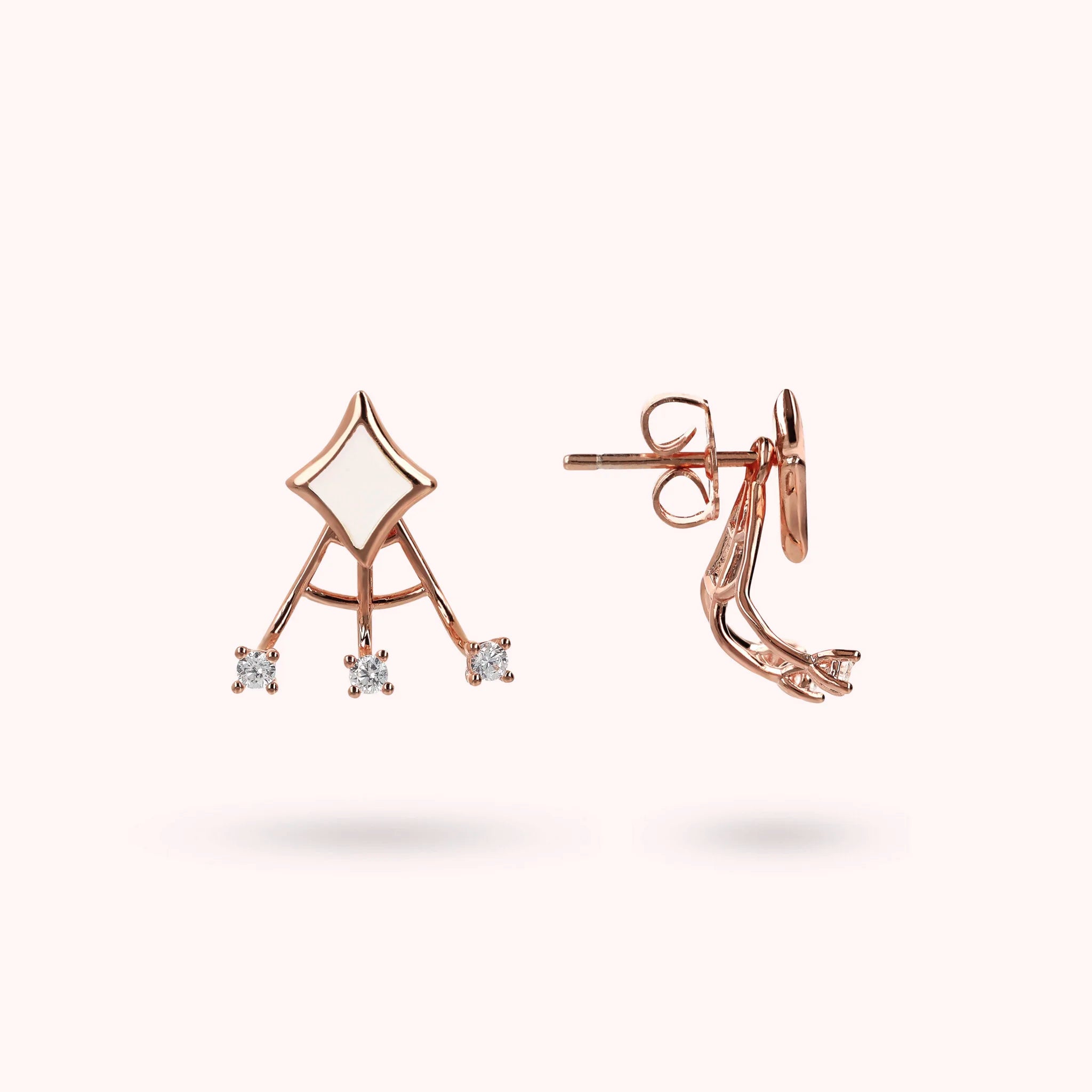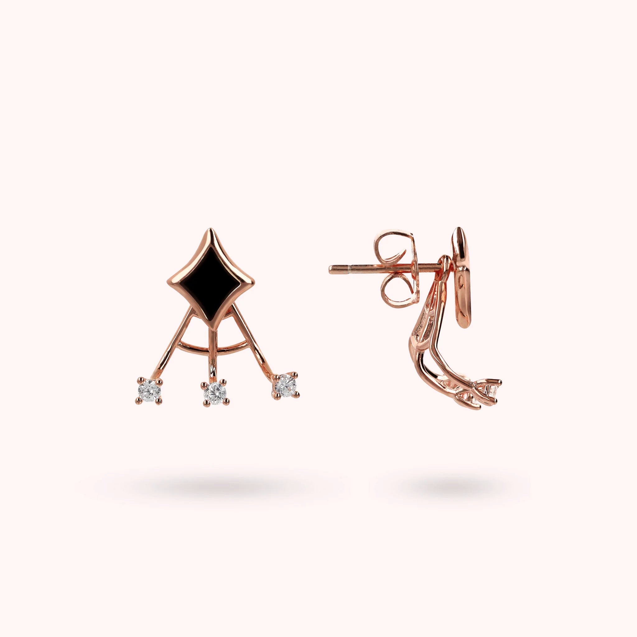 Stud earrings made of Golden Rosé alloy, 18kt rose gold plated, with enamelled étoile counter-link and additional element with three rigid wires with small points of light in cubic zirconia, luminous quality. To wear it, first insert the earring with the étoile and then add the second element from the back of the lobe. Pin and butterfly closure.