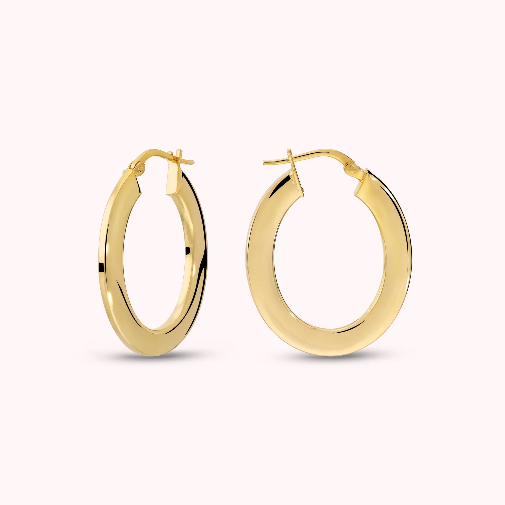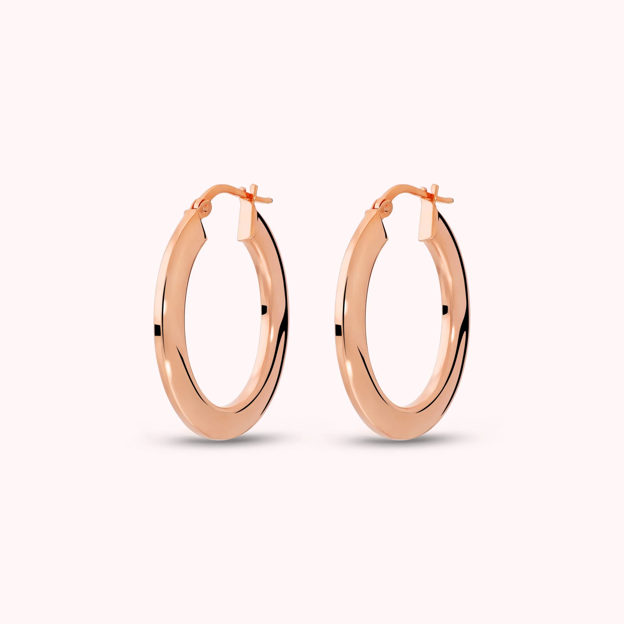 Orecchini a cerchio Bronzallure realizzati in lega Golden Rosé, placcata Oro 18kt, con finitura lucida, dal design squadrato e sottile. Chiusura a baionetta. Diametro esterno 3cm.