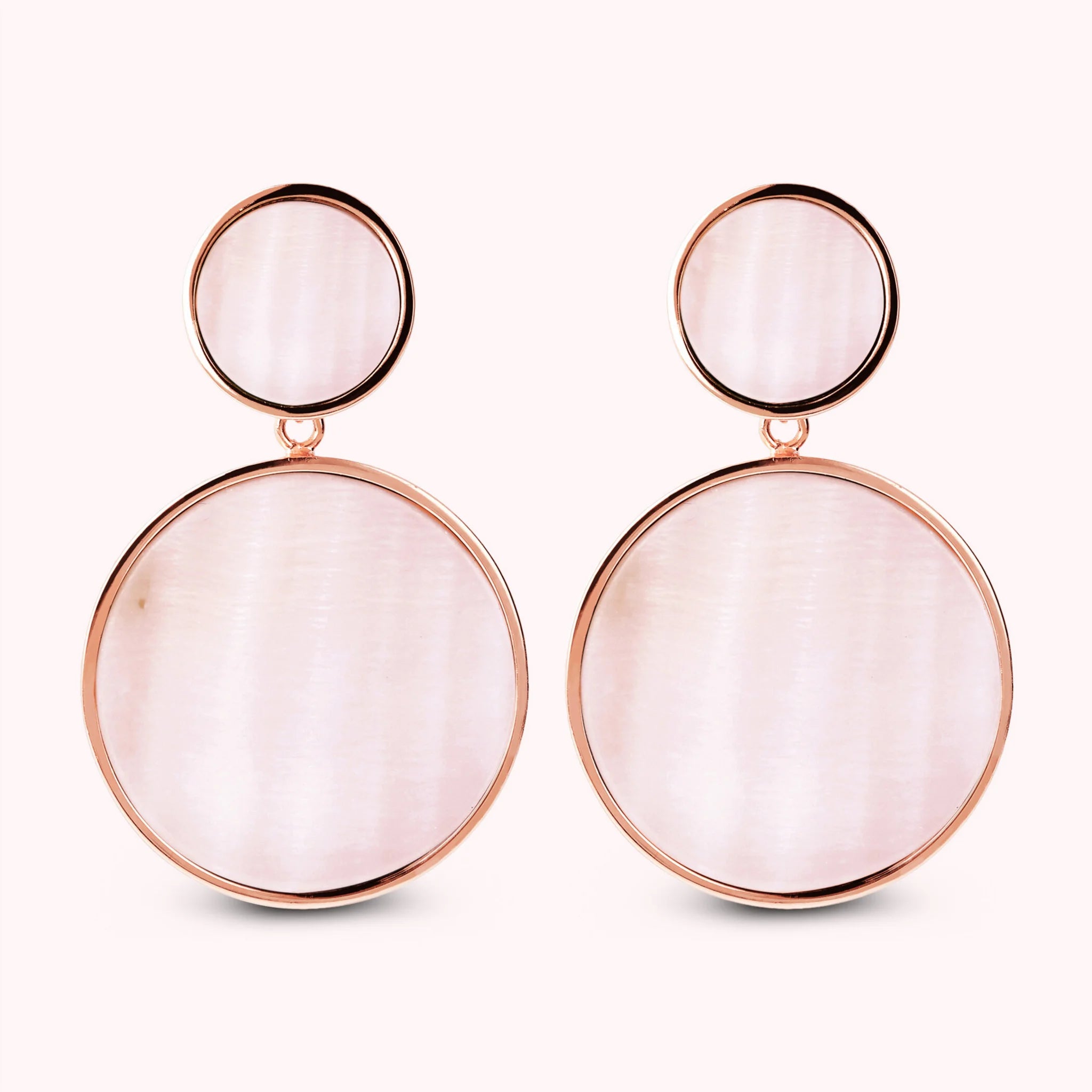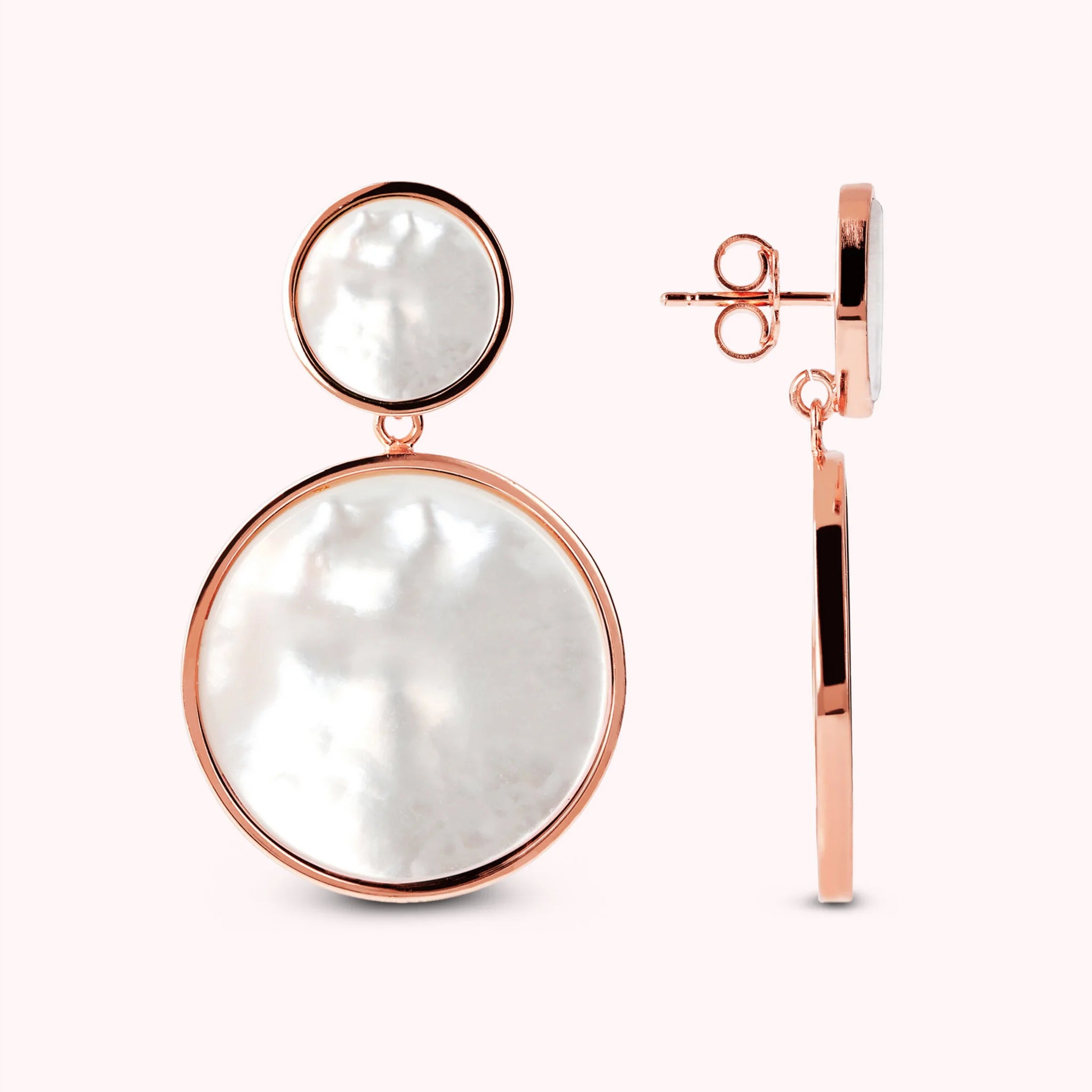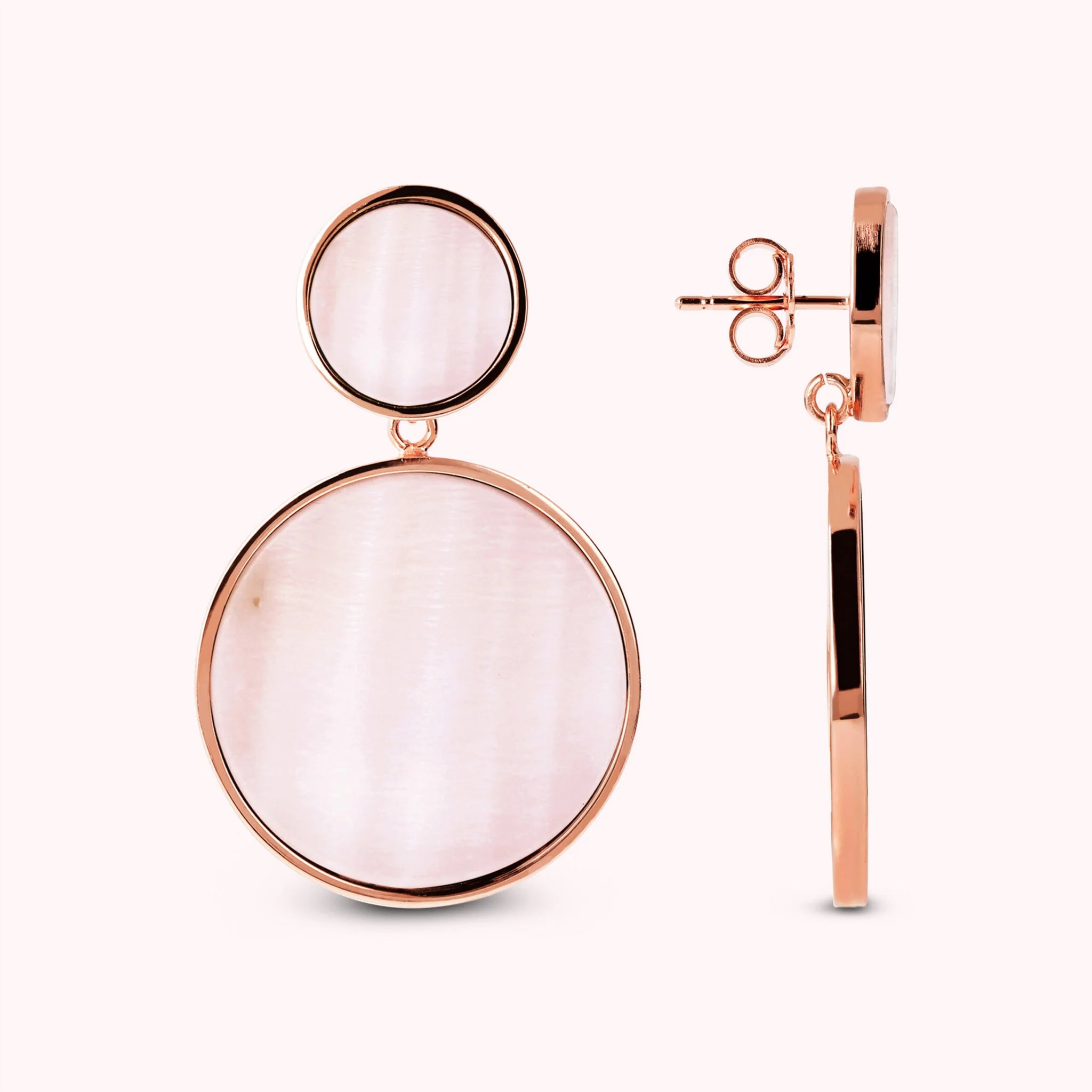 Bronzallure pendant earrings made of Golden Rosé alloy, 18kt rose gold plated with double disc with natural stone or pearl, one small (1.2 cm) and one large (2.5 cm) mounted on an 18kt rose gold plated base; stud and butterfly closure.