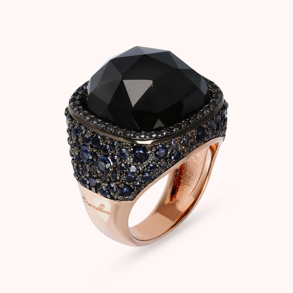 Bronzallure chevalier ring made of Golden Rosé alloy, 18kt rose gold plated, embellished with a faceted natural stone, black onyx, slightly square (16x16 mm) and surrounded by small black luminous cubic zirconia. In the lower part of the stone there is a luminous pavé of small blue cubic zirconia stones.