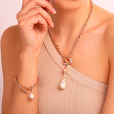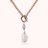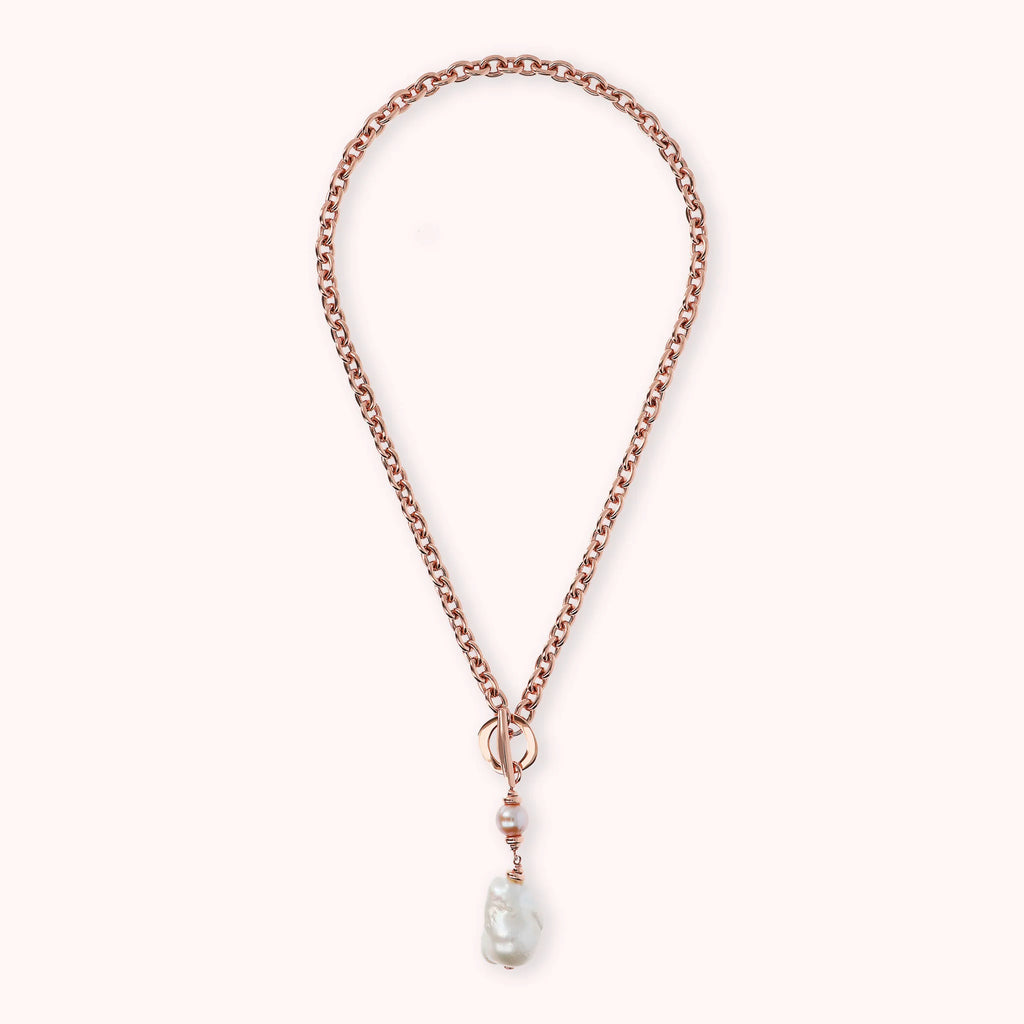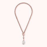 Bronzallure tie necklace made of Golden Rosé alloy, 18kt rose gold plated, with rolo chain embellished with freshwater cultured pearls: pink pearl and scaramazza pearl, T-Bar clasp.