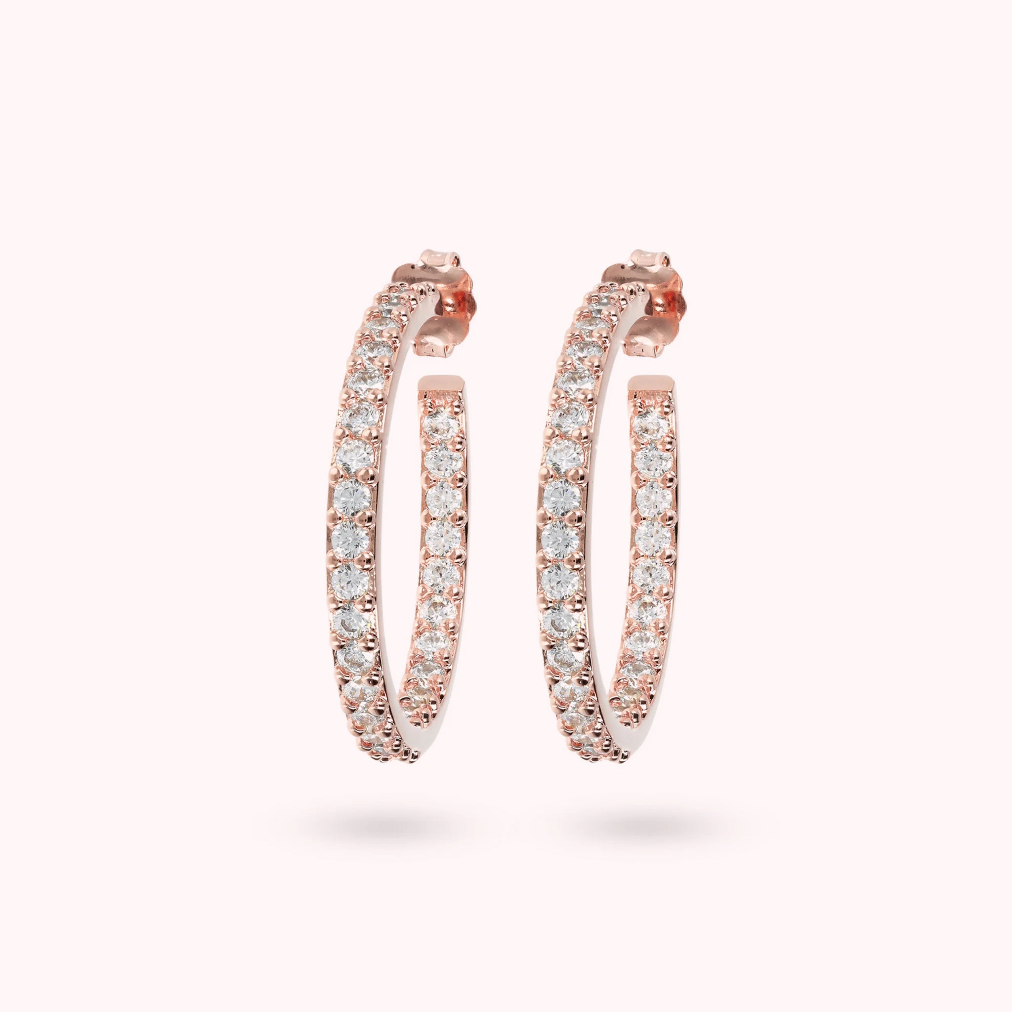 Bronzallure hoop earrings, made on a Golden Rosé base, 18kt rose gold plated, covered entirely with cubic zirconia, luminous quality; pin and butterfly closure. External diameter of 3 cm.