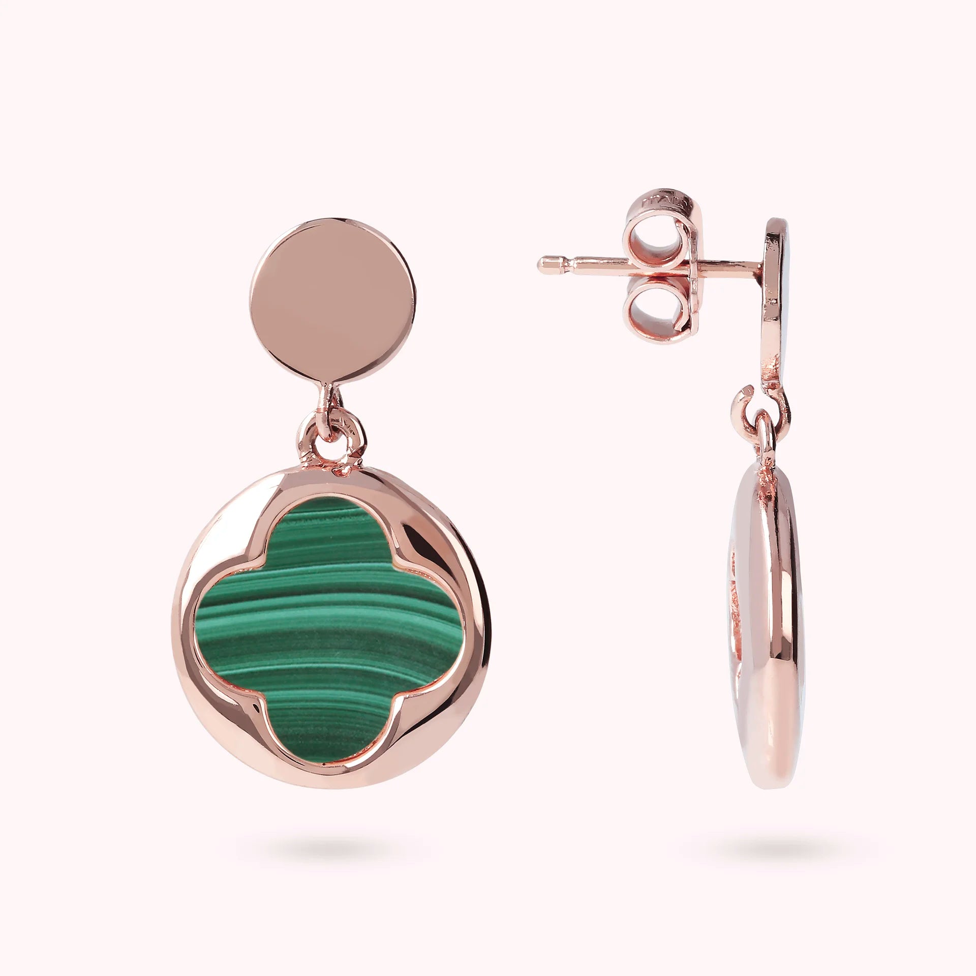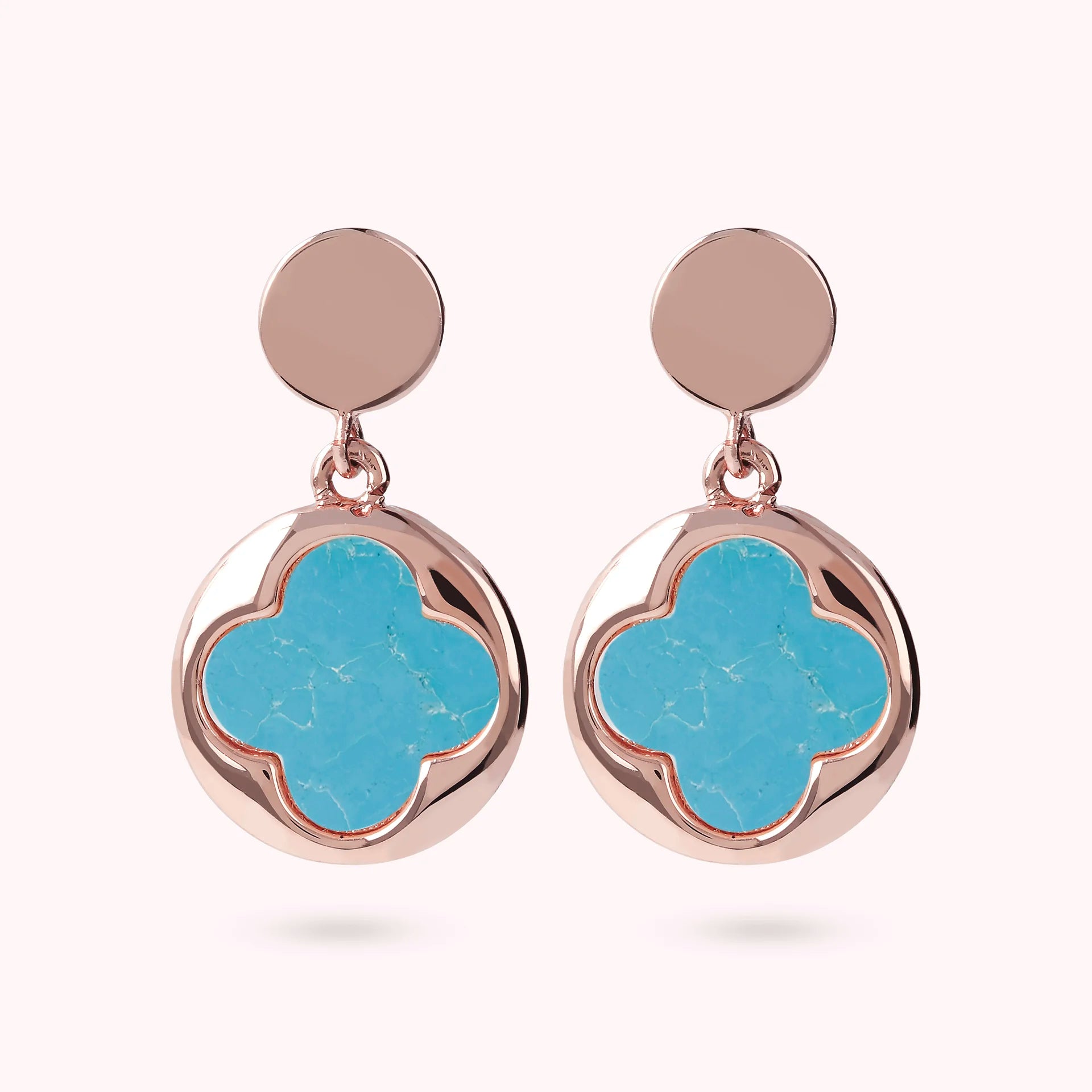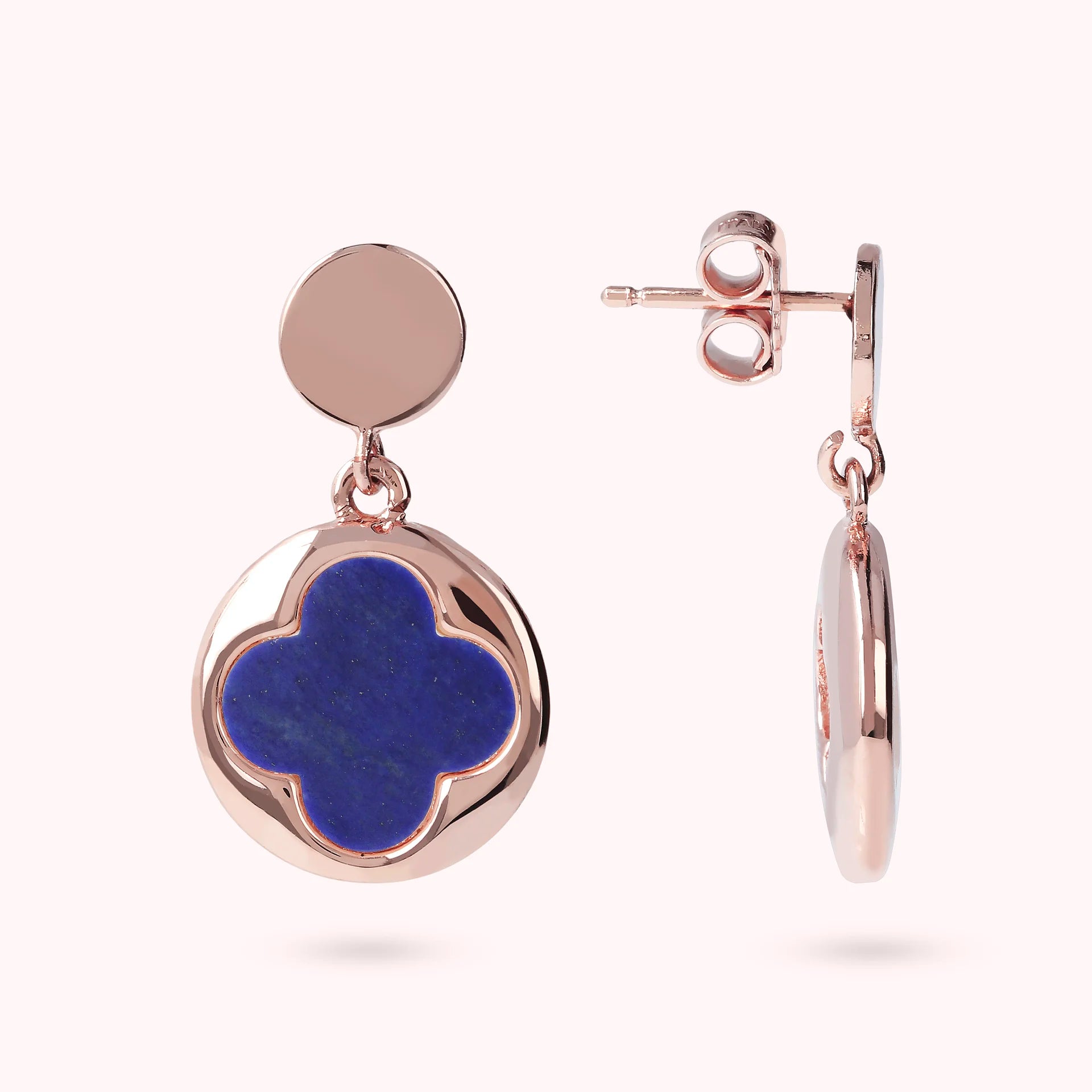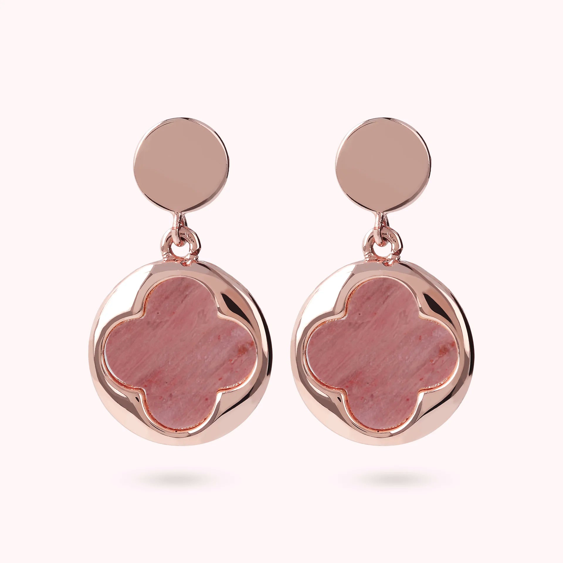 Bronzallure pendant earrings made of Golden Rosé alloy, 18kt rose gold plated with round pendant (1.5 cm) characterized by a four-leaf clover in natural stone, mounted on an 18kt rose gold plated base; stud and butterfly closure.